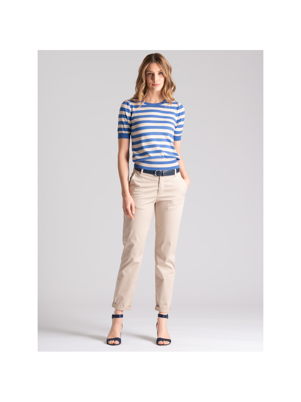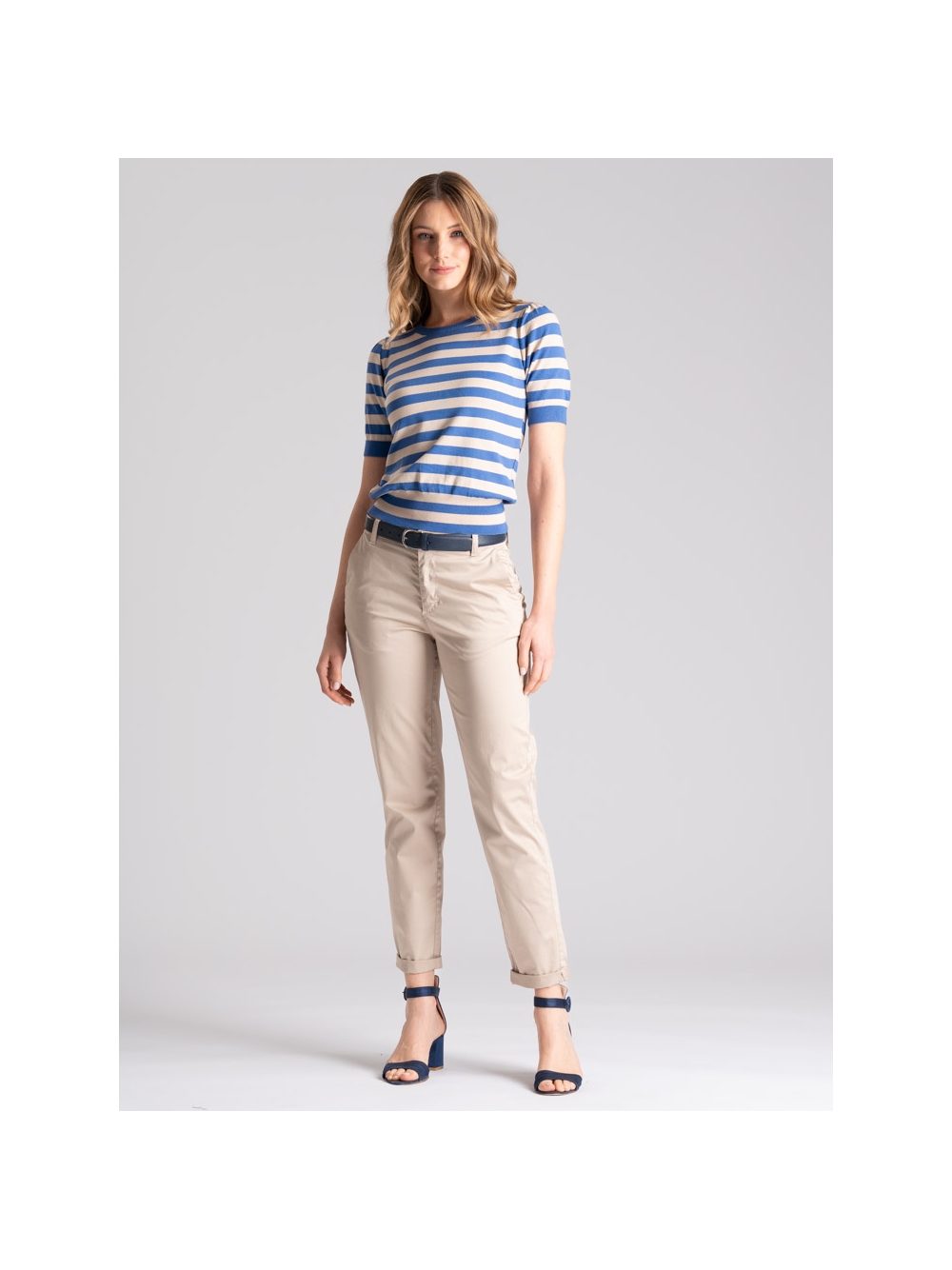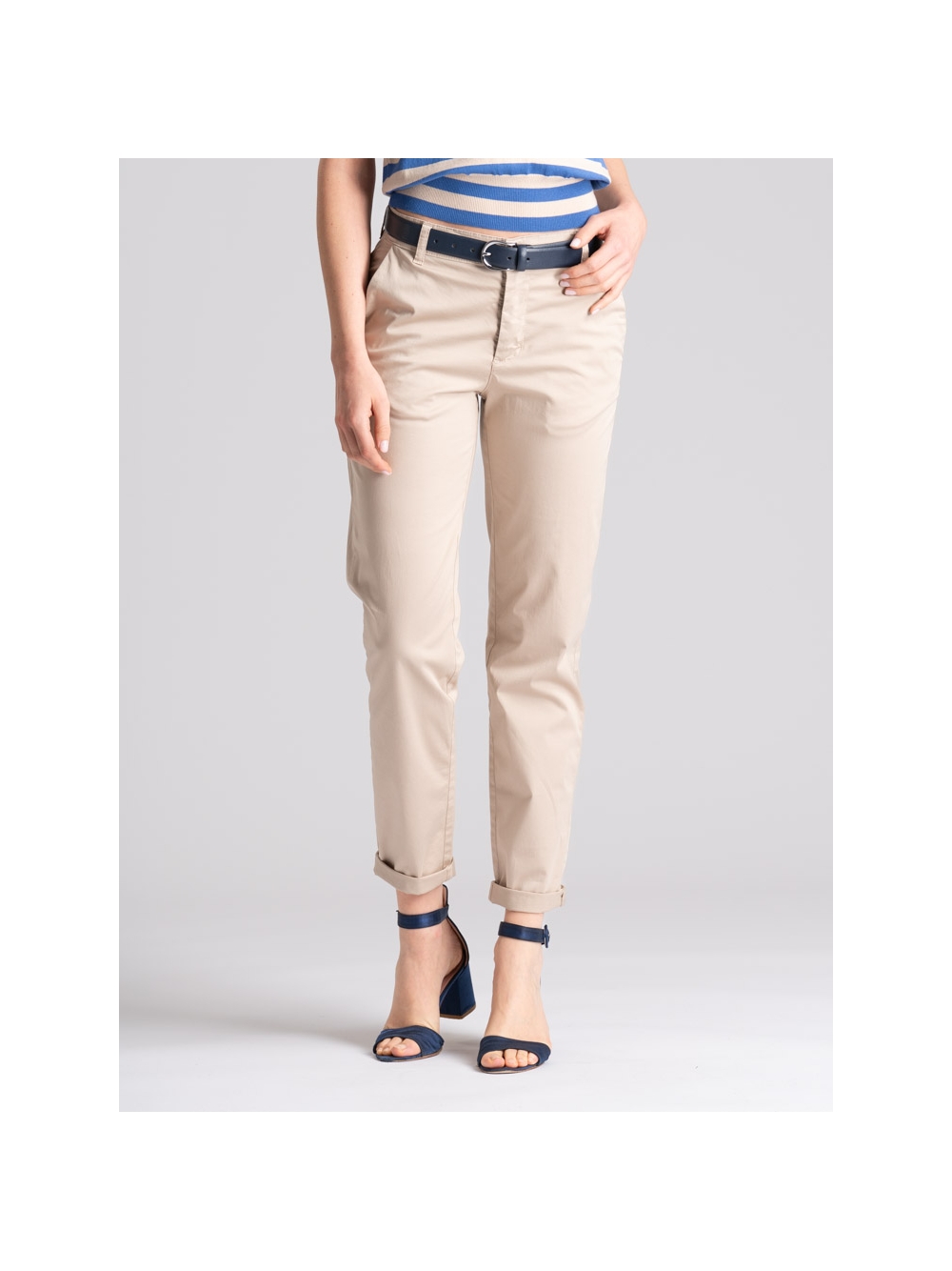 Pantalone donna in raso di cotone stretch modello chino, color sabbia tinto capo.