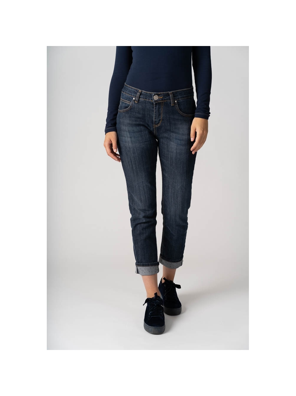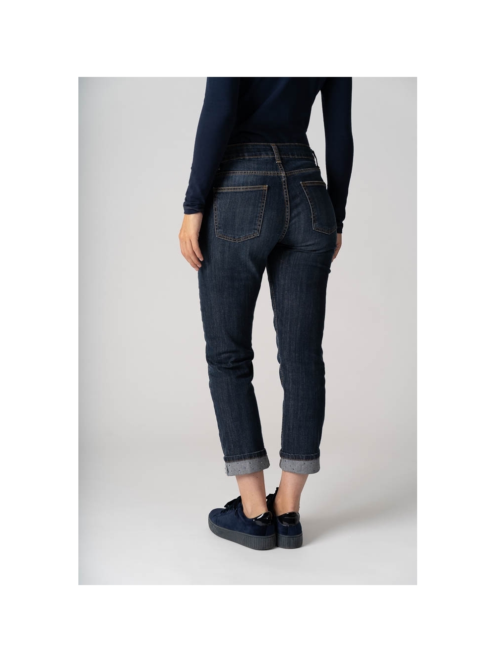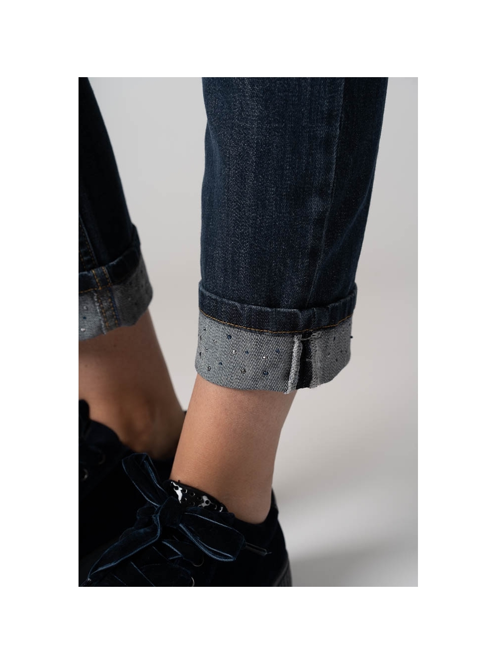 Jeans donna 5 tasche vestibilità boyfriend , fondo largo con risvolto fisso e applicazioni di strass, realizzato in denim stretch