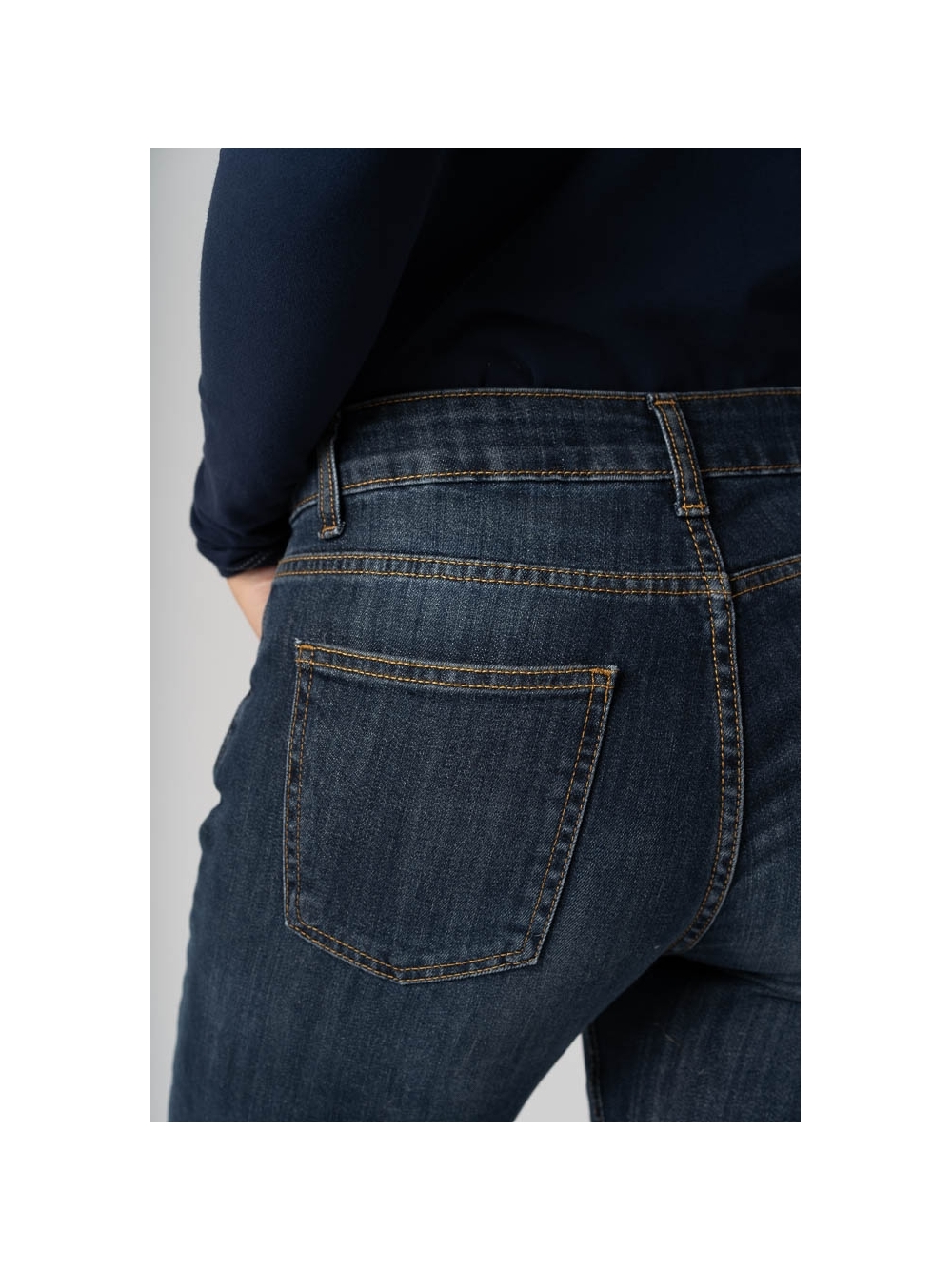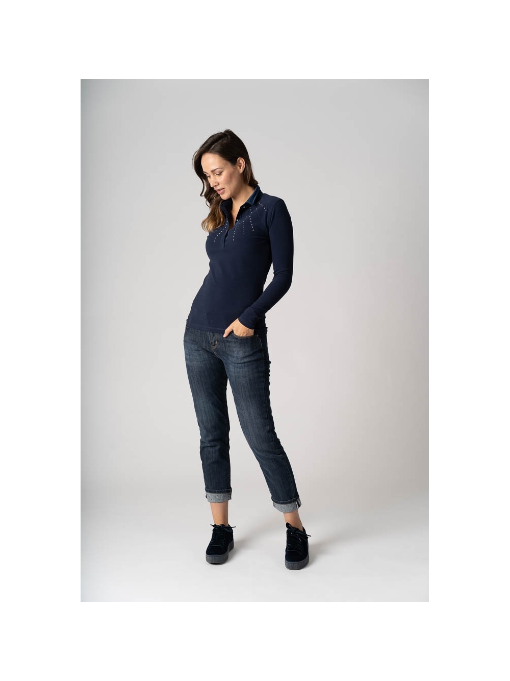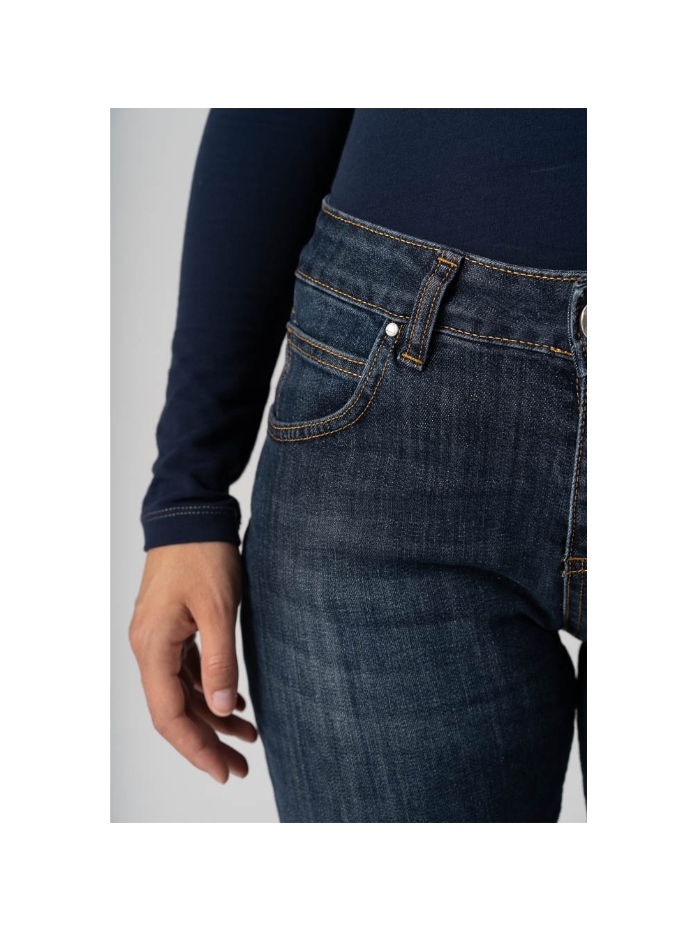Jeans donna 5 tasche vestibilità boyfriend , fondo largo con risvolto fisso e applicazioni di strass, realizzato in denim stretch