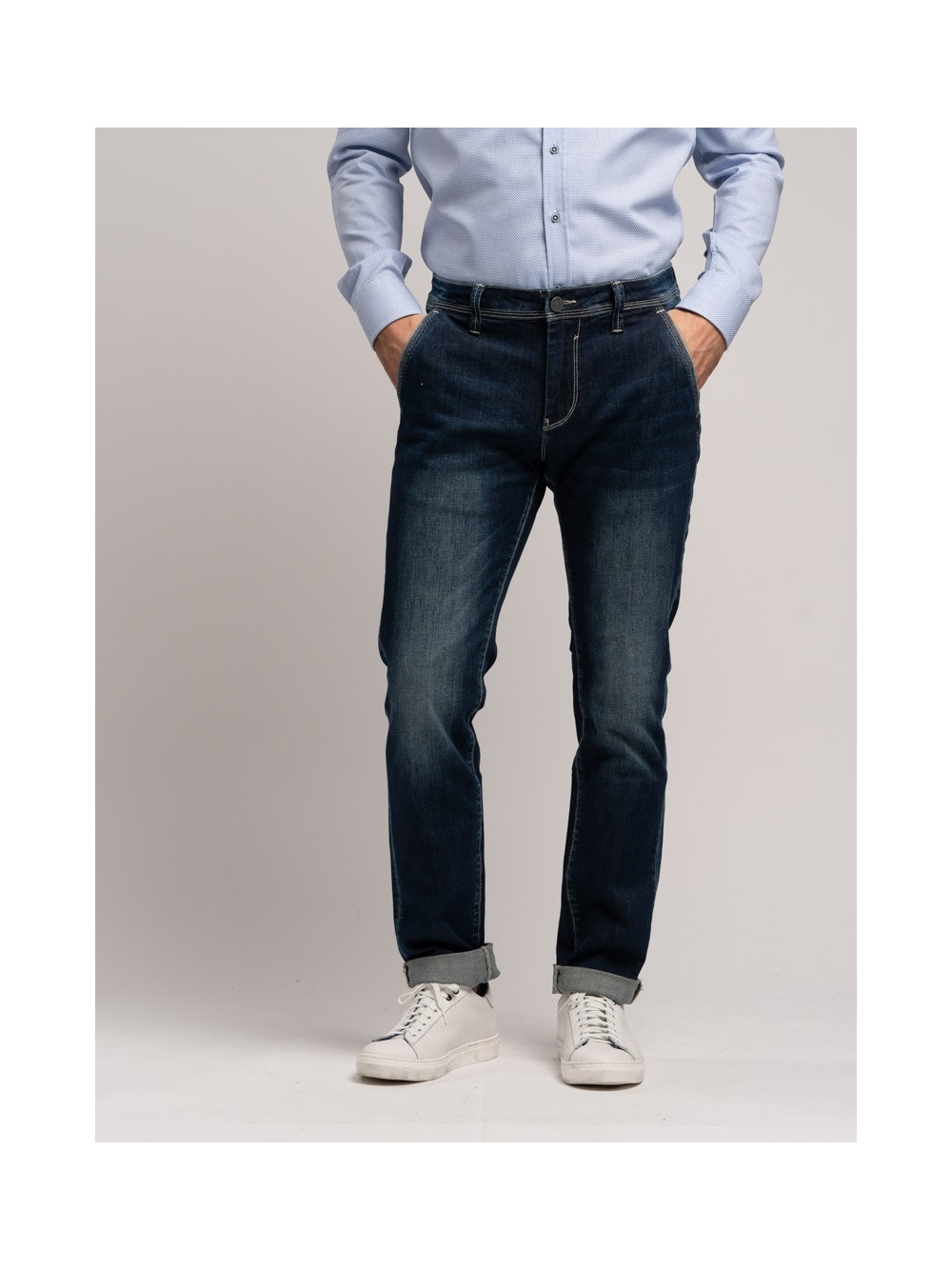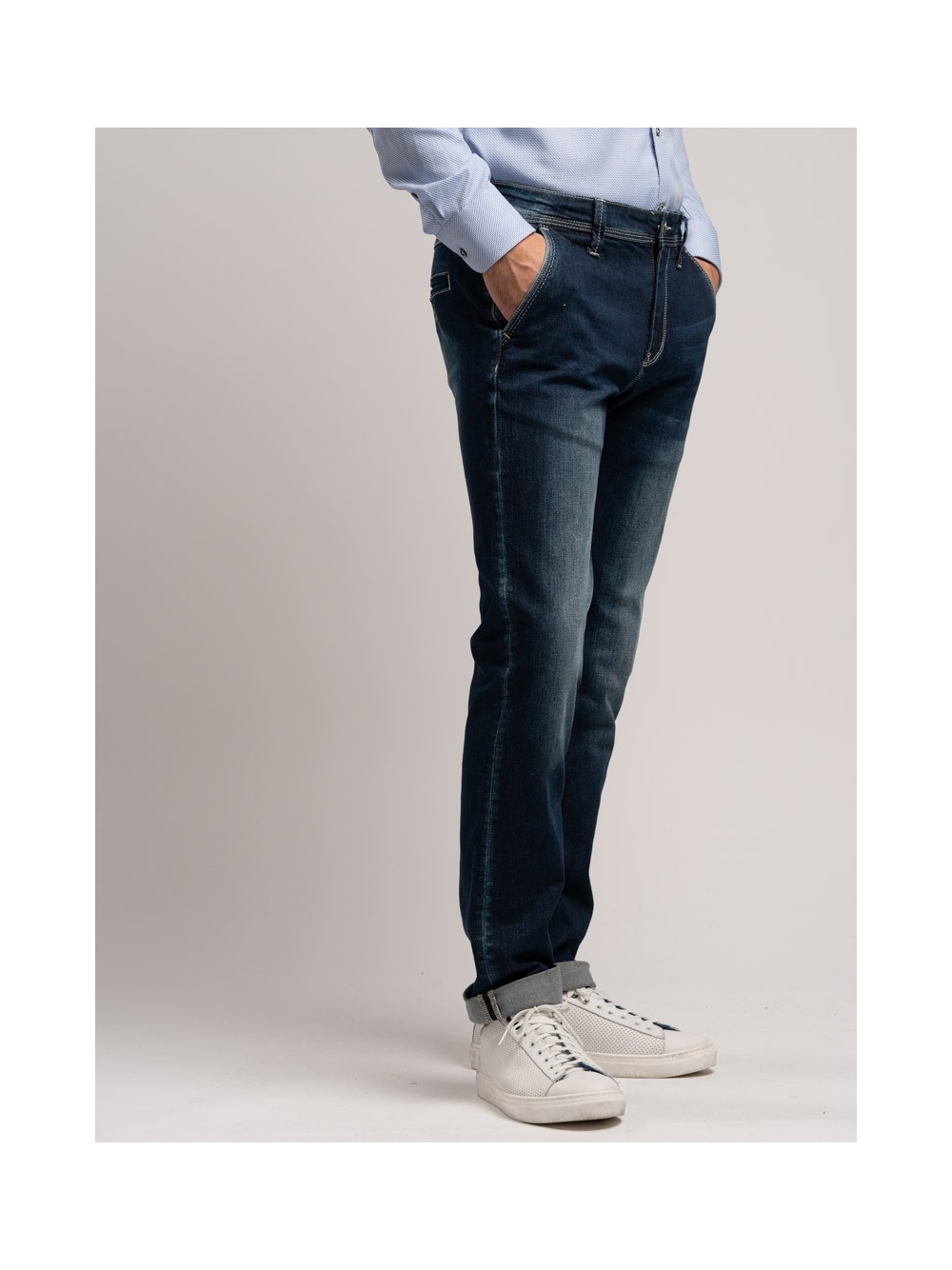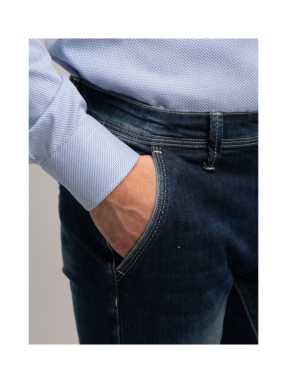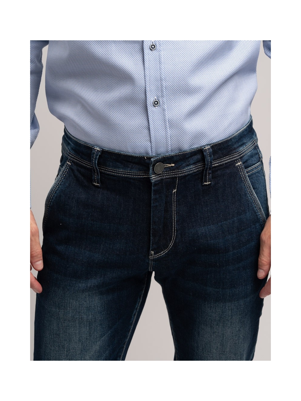 Jeans uomo stretch modello chinos in denim blu scuro con leggero carteggio per un effetto vissuto e dettagli raffinati in tessuto a contrasto, una nuova versione del classico denim.