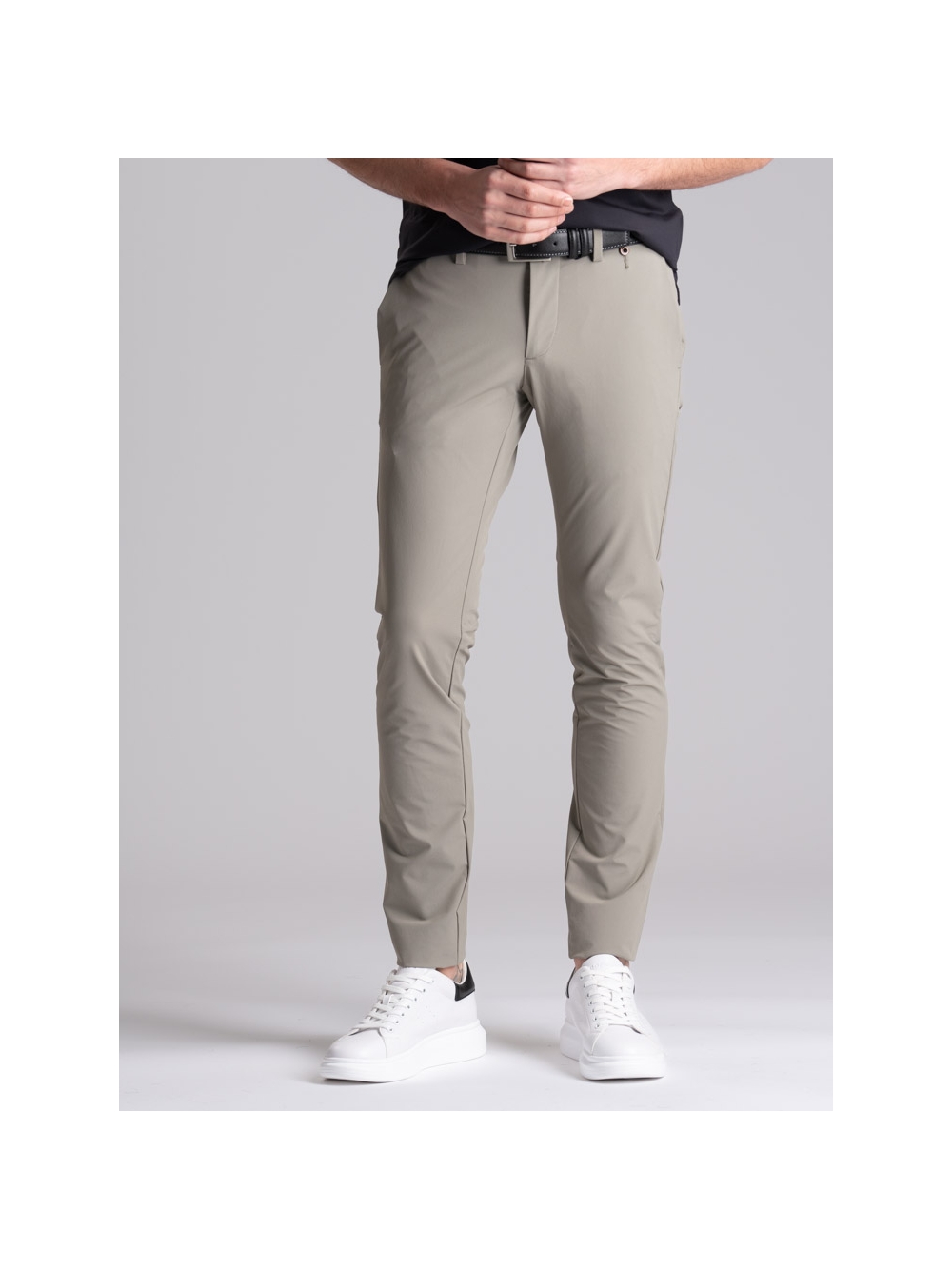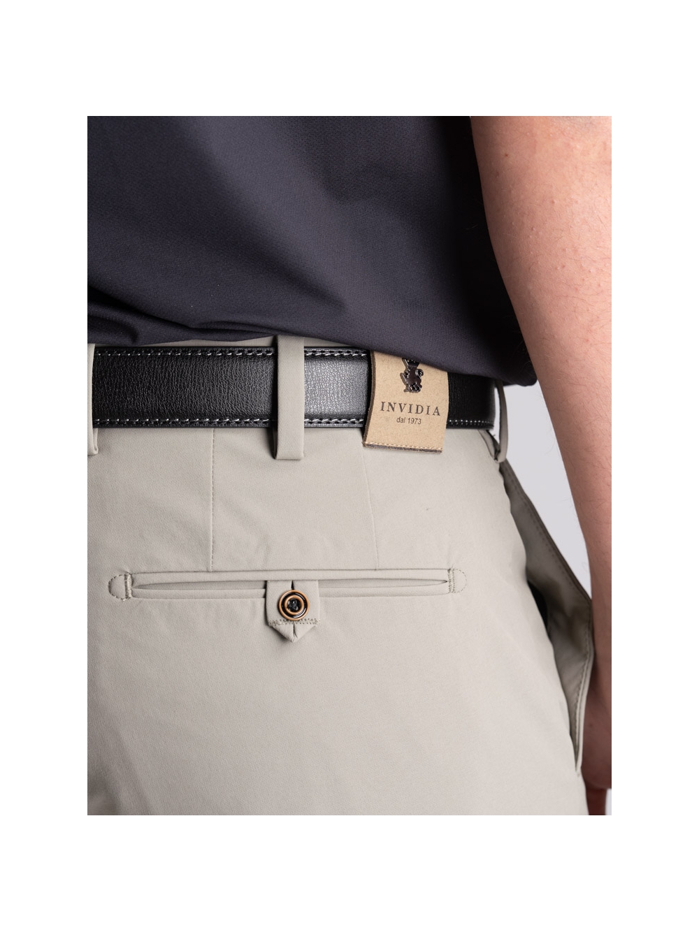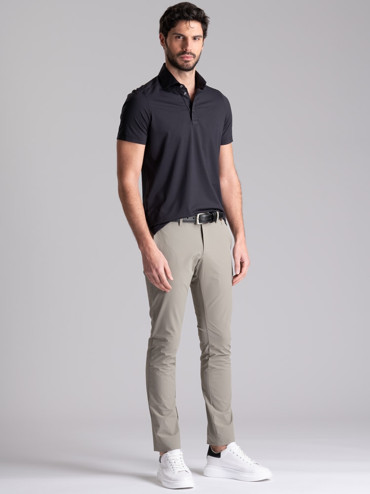 Pantalone uomo modello chino realizzato in confortevole tessuto TECNO effetto crêpe, traspirante e no pieghe, rifinito con attenzione sartoriale.