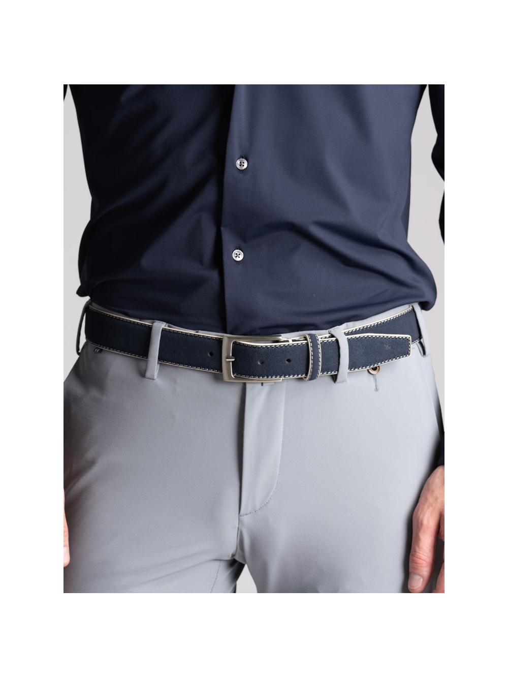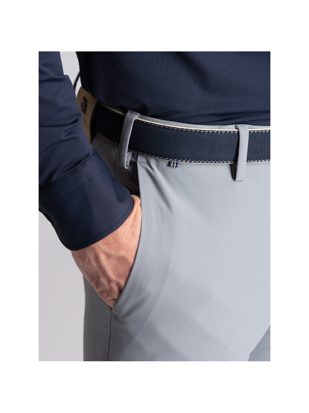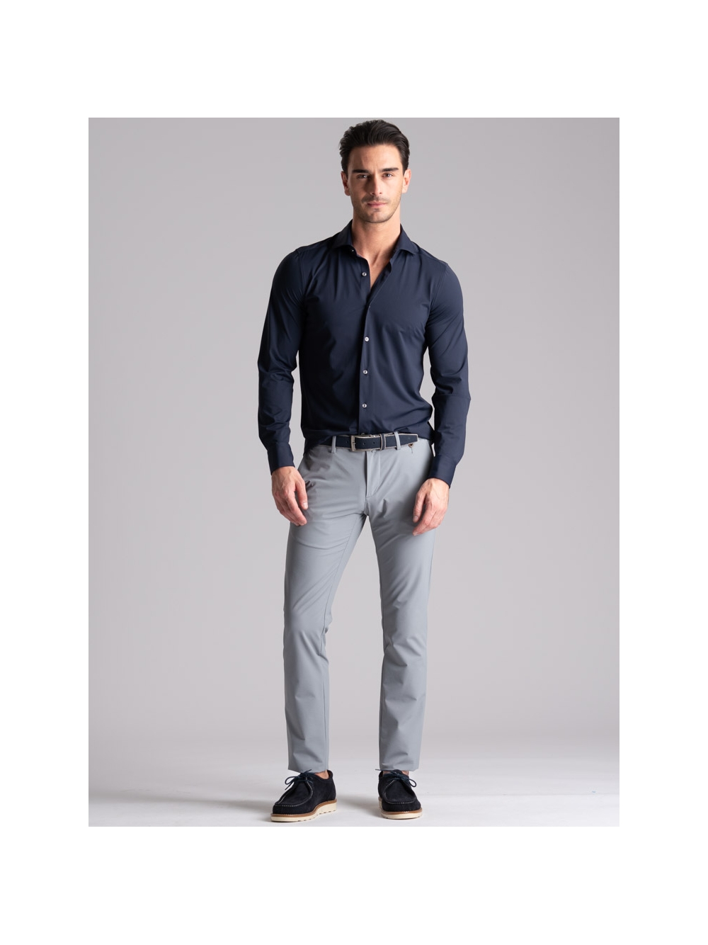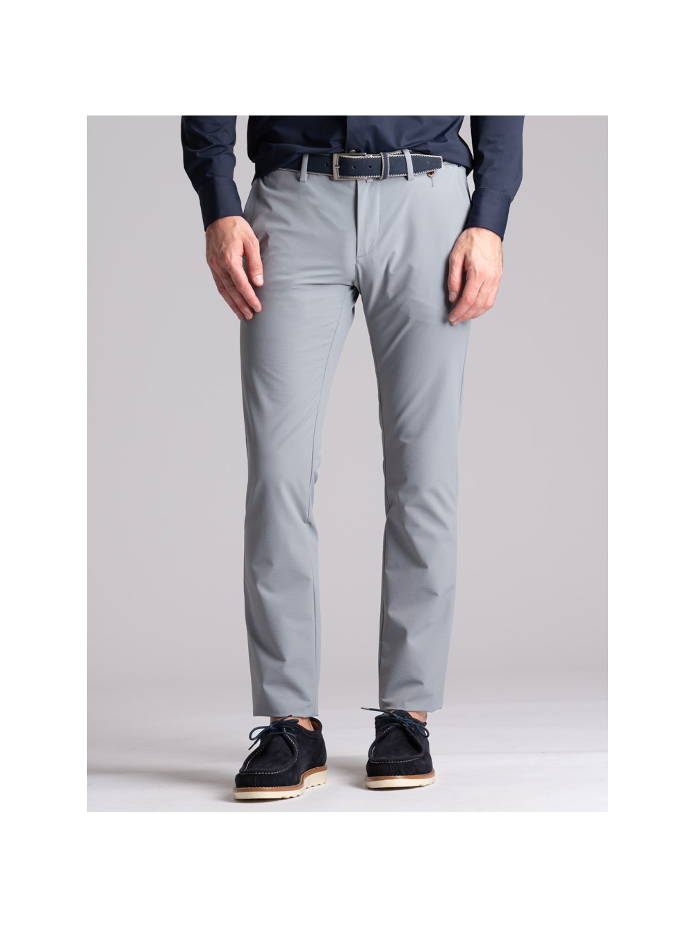 Pantalone uomo modello chino realizzato in confortevole tessuto TECNO effetto crêpe, traspirante e no pieghe, rifinito con attenzione sartoriale.