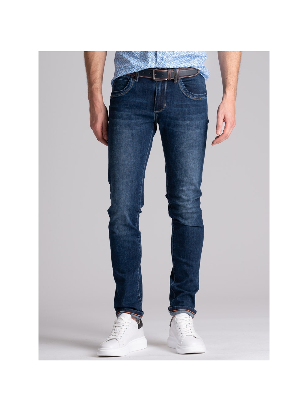 Jeans uomo modello cinque tasche realizzato in denim stretch lavaggio scuro con doppio taschino e cuciture a contrasto.