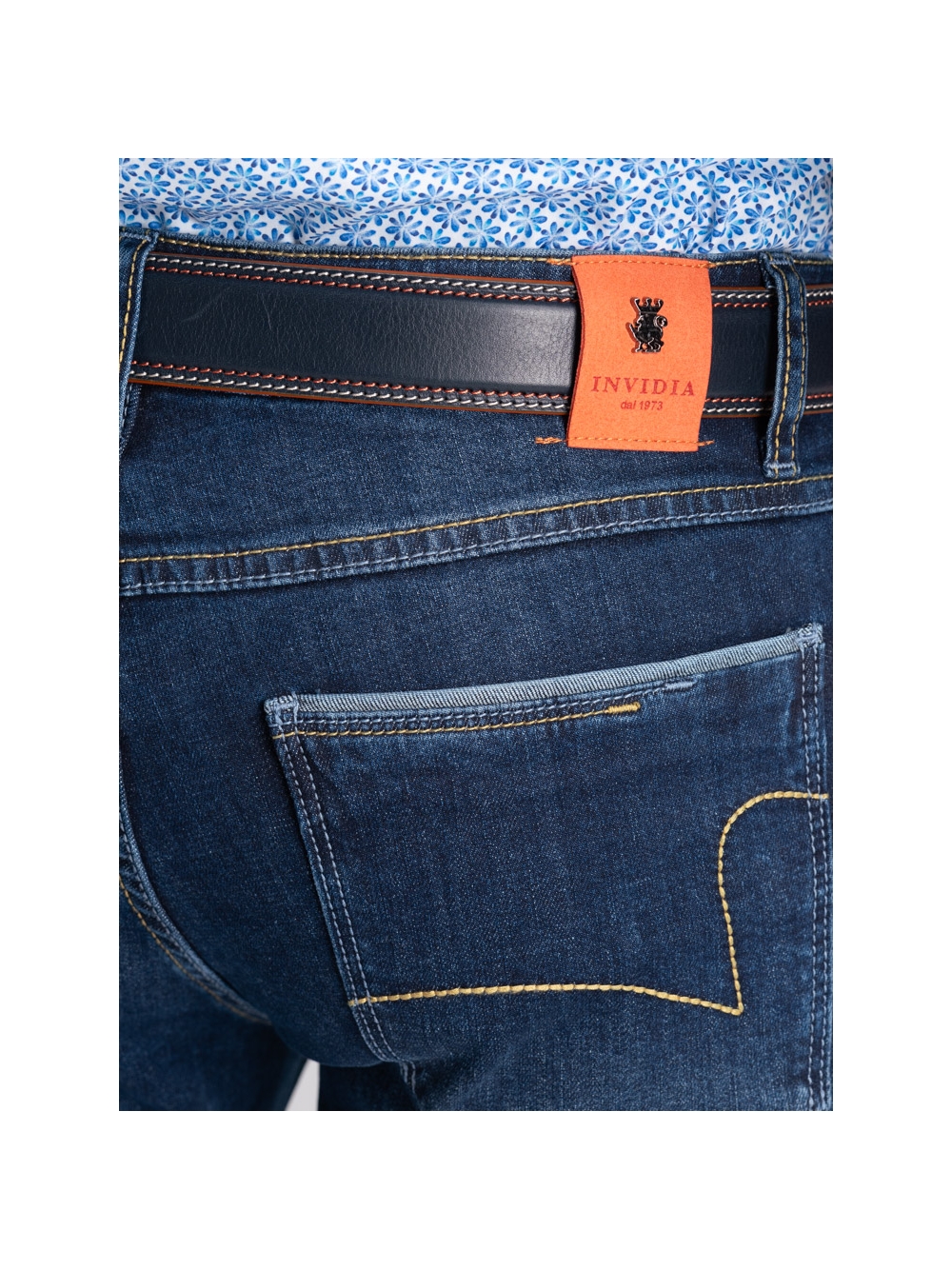 I jeans uomo cinque tasche in denim stretch con lavaggio scuro e baffi sul davanti, sono caratterizzati dalla doppia taschina davanti e cuciture a contrasto ocra per uno stile fresco, adatto alla stagione estiva. L’interno è rifinito con tasche realizzate in tessuto stampato e da un’etichetta con leone. Sul retro, la salpa con logo INVIDIA 1973 di colore arancione dà grande grinta al capo.