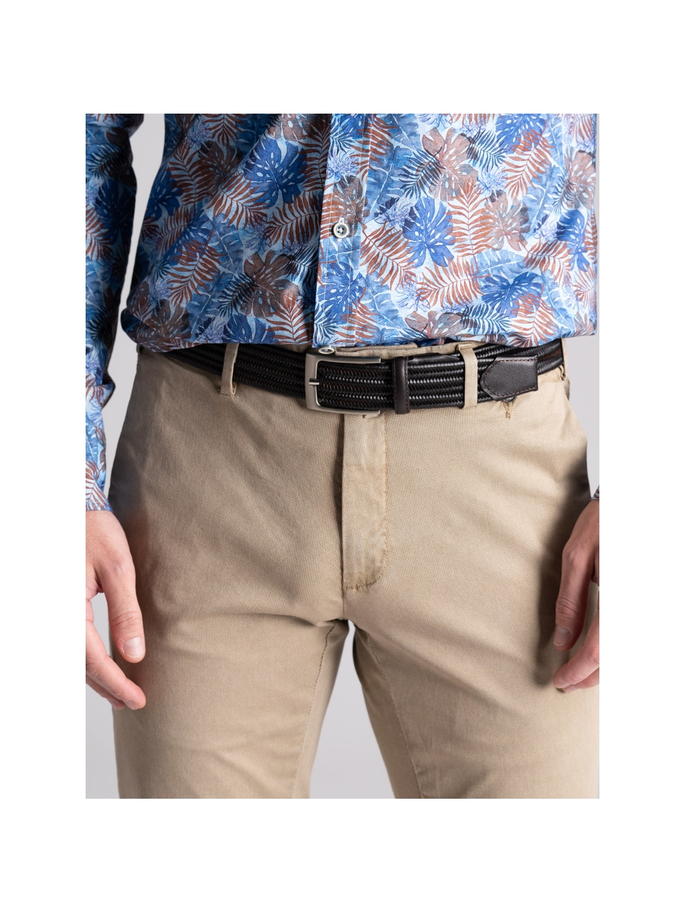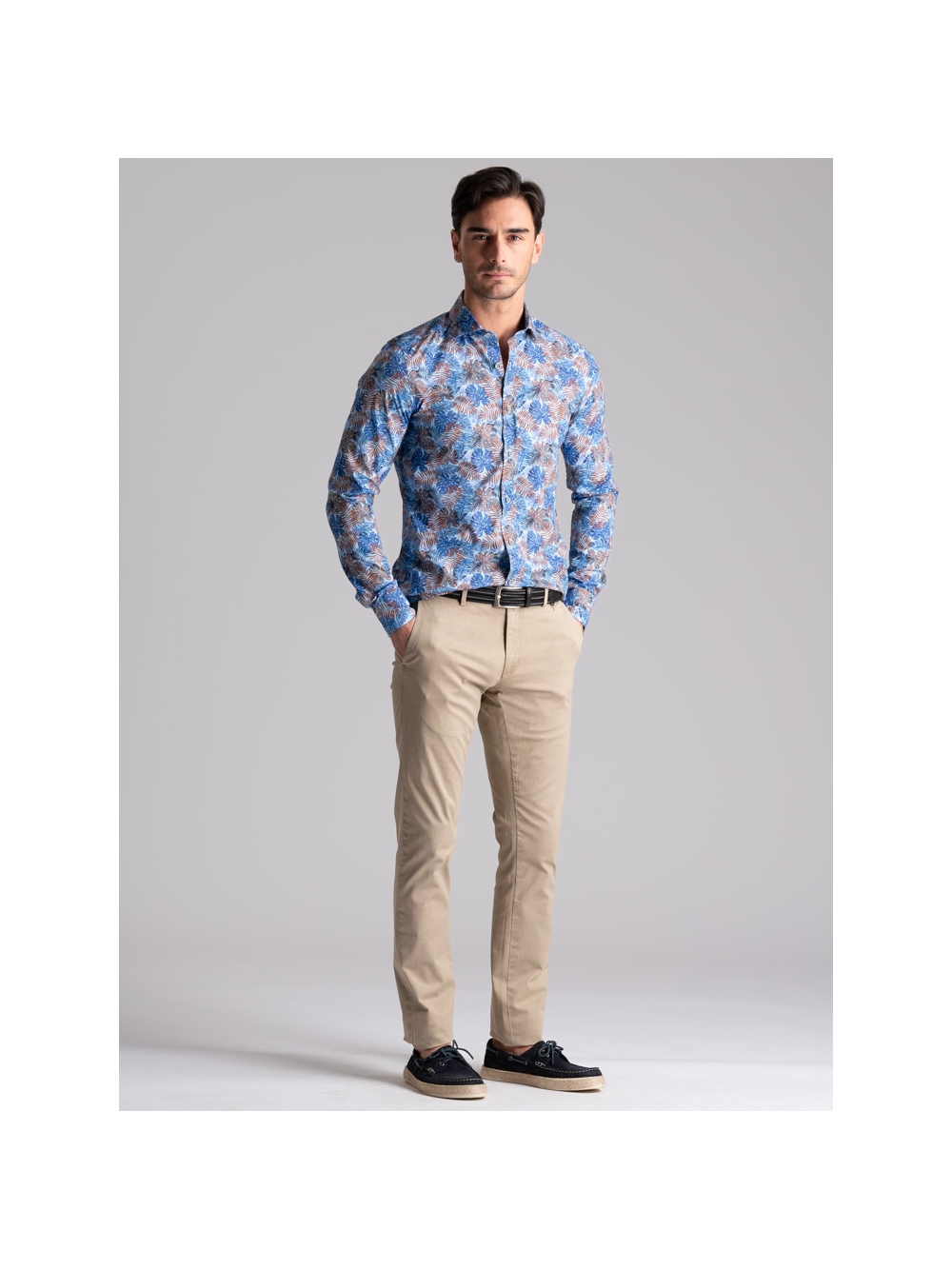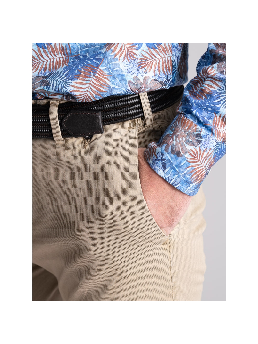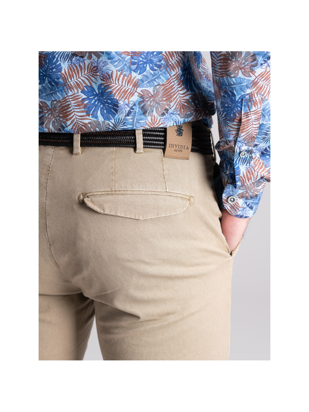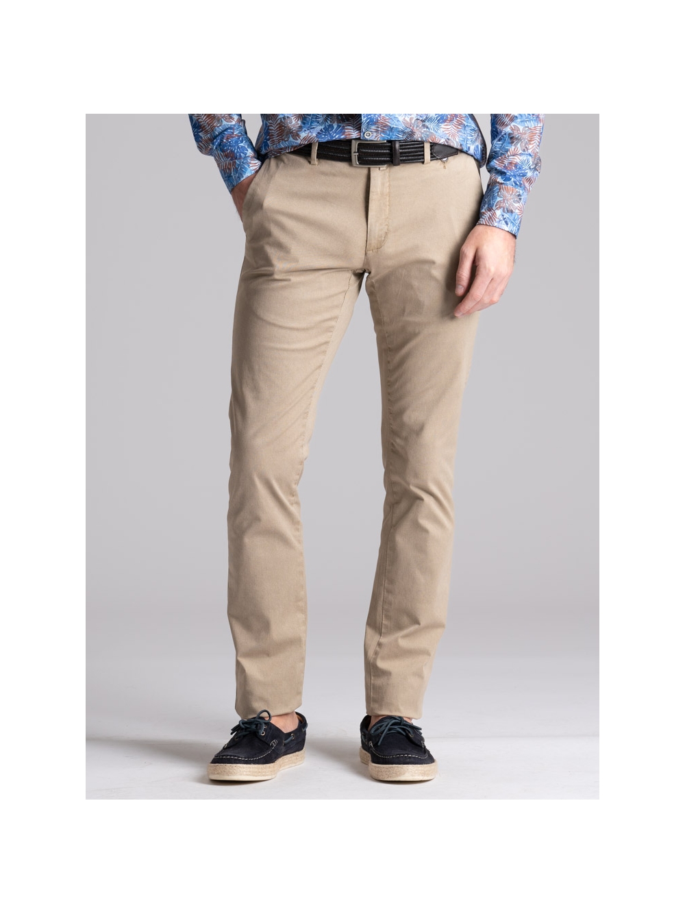 Pantalone uomo chino realizzato in tessuto di cotone stretch con micro stampa e lavaggio leggero effetto old. Questo modello si distingue per una linea slim, la vestibilità confortevole e una realizzazione semisartoriale che emerge da diversi dettagli: le tasche posteriori con micro patelle, la ricca cintura interna, il sottopancia con contro bottone per una chiusura perfetta e il profilo in piping a contrasto. Il pantalone uomo chino con micro stampa è disponibile nelle varianti color sabbia e blu chiaro.