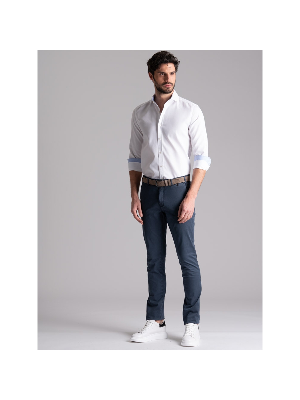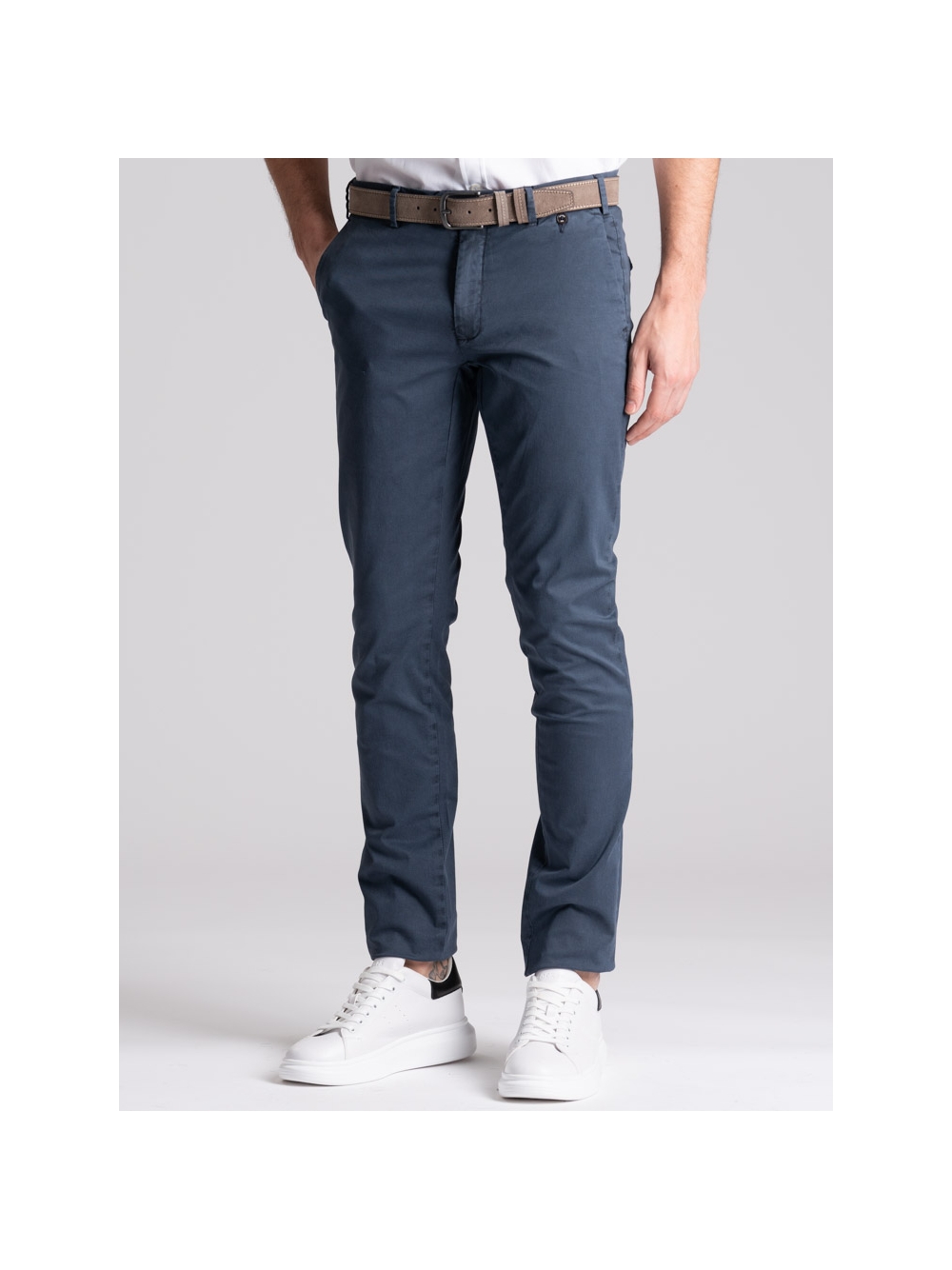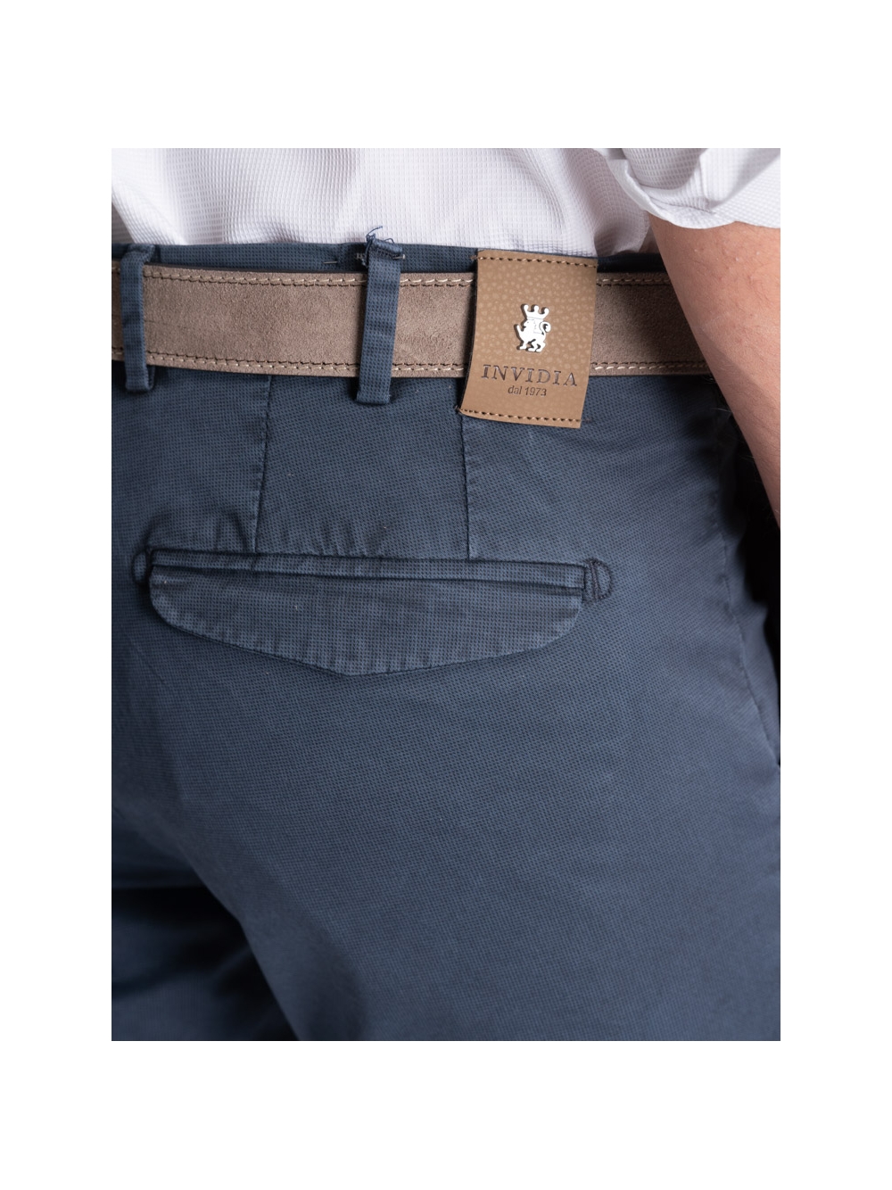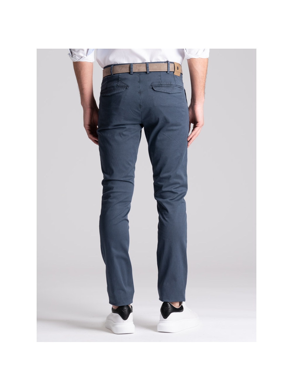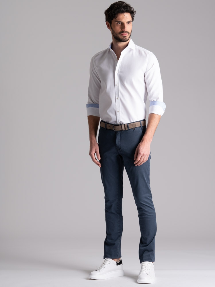 Pantalone uomo chino realizzato in tessuto di cotone stretch con micro stampa e lavaggio leggero effetto old. Questo modello si distingue per una linea slim, la vestibilità confortevole e una realizzazione semisartoriale che emerge da diversi dettagli: le tasche posteriori con micro patelle, la ricca cintura interna, il sottopancia con contro bottone per una chiusura perfetta e il profilo in piping a contrasto. Il pantalone uomo chino con micro stampa è disponibile nelle varianti color sabbia e blu chiaro.