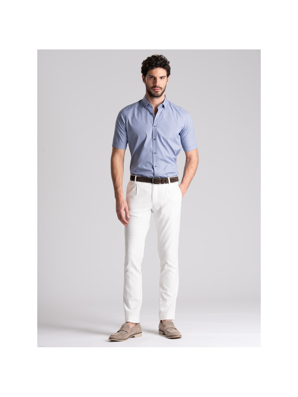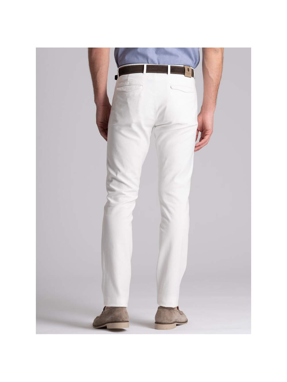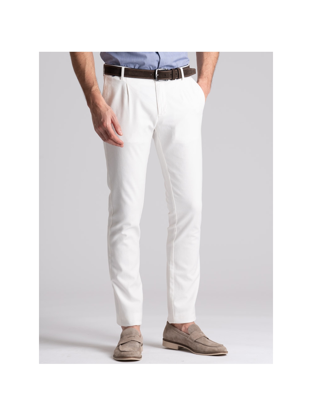 Pantalone chino in tessuto di cotone stretch armaturato con lavaggio old. Questo modello si distingue per una realizzazione semisartoriale che emerge da diversi dettagli: le tasche posteriori con micro patelle, la ricca cintura interna con tessuto tono su tono, le micro pinces e l’impuntura AMF sulle tasche con borchietta. I pantaloni uomo modello chinos hanno una linea slim e una vestibilità confortevole e sono disponibili nelle varianti colore bianco, grigio e blu.