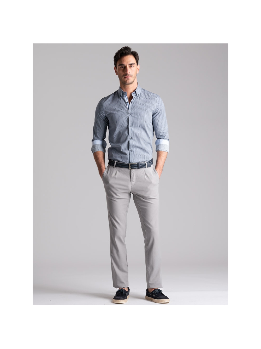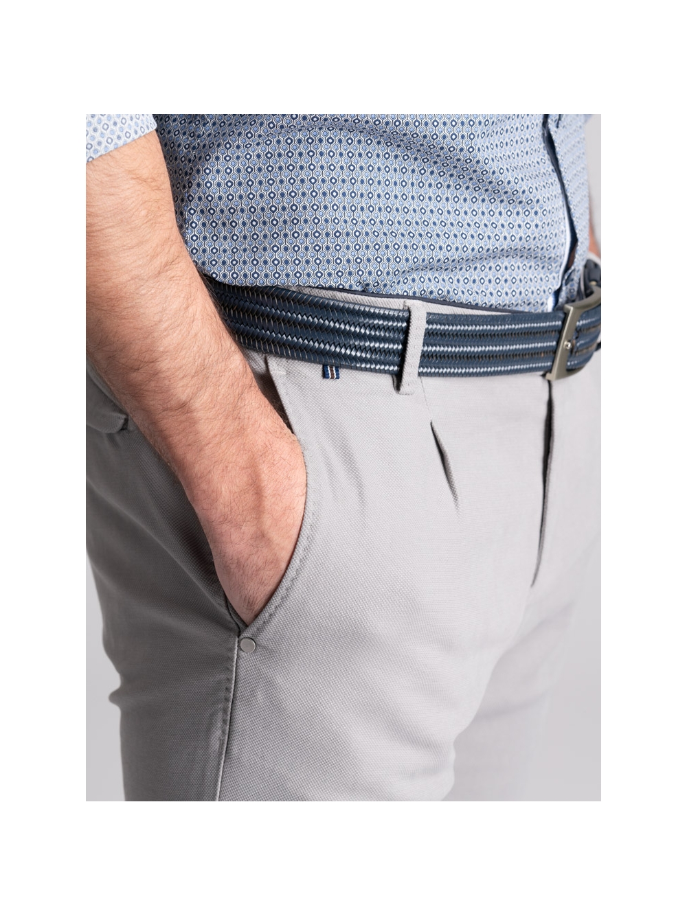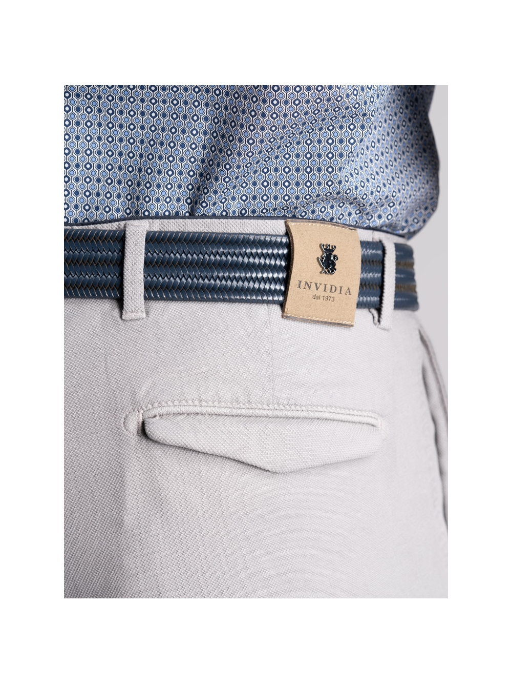 Pantalone chino in tessuto di cotone stretch armaturato con lavaggio old. Questo modello si distingue per una realizzazione semisartoriale che emerge da diversi dettagli: le tasche posteriori con micro patelle, la ricca cintura interna con tessuto tono su tono, le micro pinces e l’impuntura AMF sulle tasche con borchietta. I pantaloni uomo modello chinos hanno una linea slim e una vestibilità confortevole e sono disponibili nelle varianti colore bianco, grigio e blu.