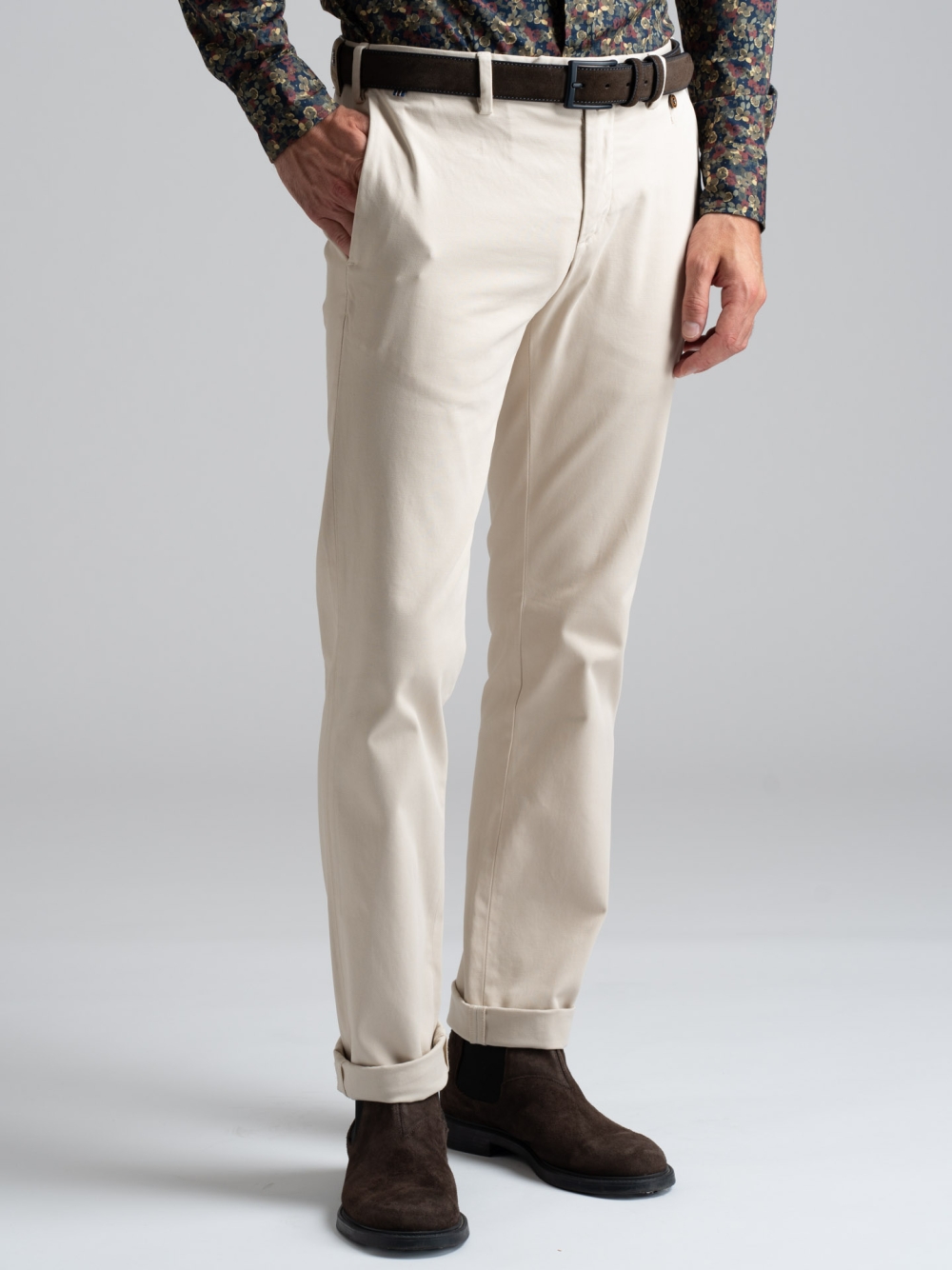 Pantalone uomo mano calda in tessuto Broken Twill, con finiture sartoriali, slargo e tasche posteriori a doppio filetto con picanello.