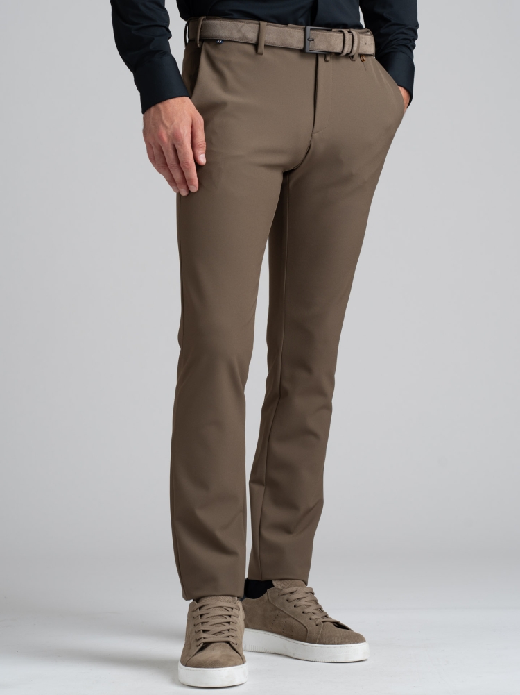 Pantalone uomo modello chino realizzato in tessuto TECNO, disponibile nelle varianti colore blu, tortora e nero.