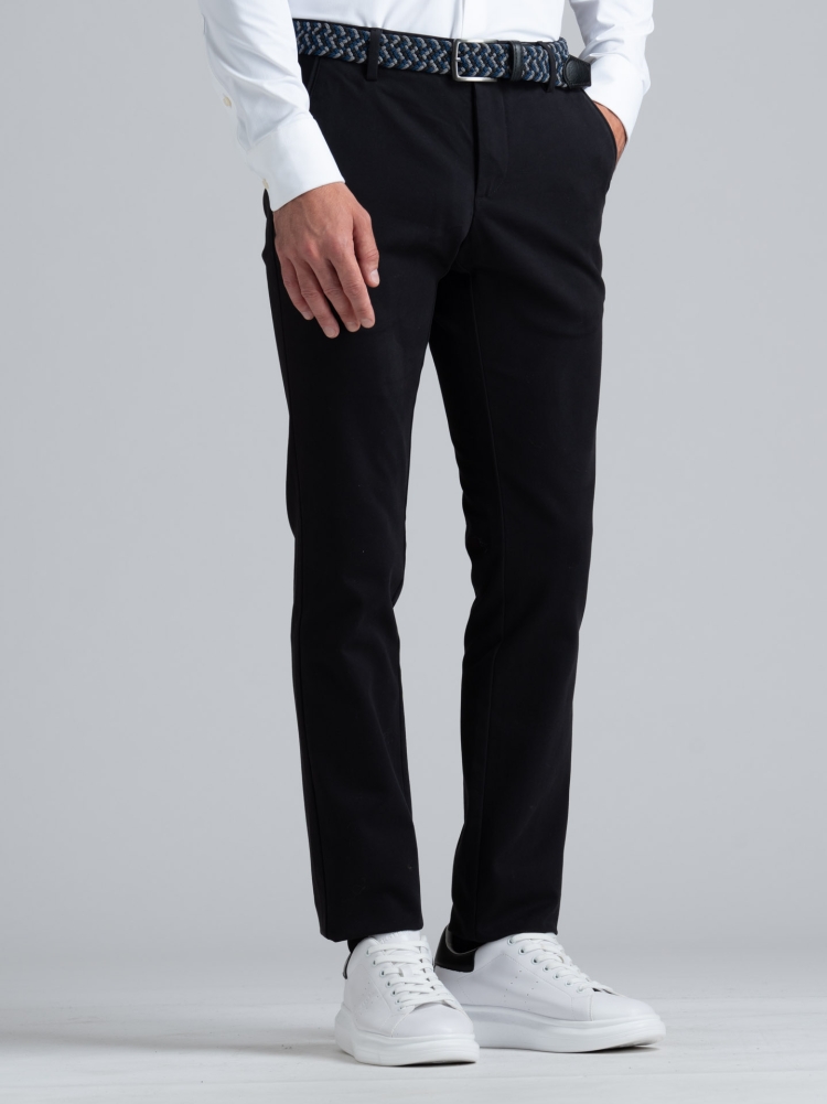 Pantalone uomo in tricotina di cotone a mano calda, modello chino a tasca America, disponibile nelle varianti colore blu, biscotto e nero.