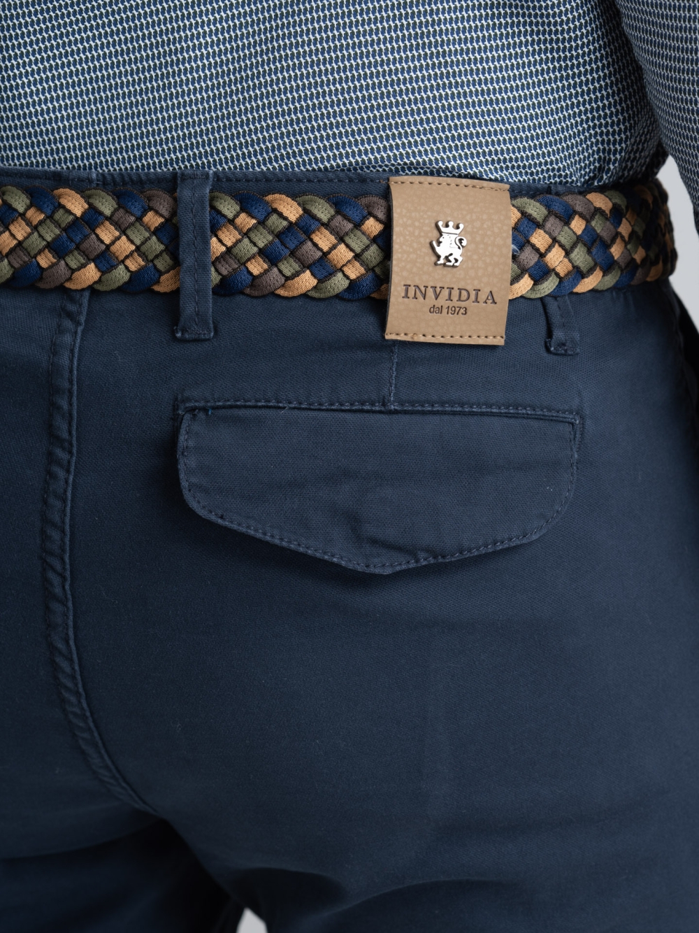 Pantalone uomo cargo modello tasca America, caratterizzato da tasche laterali con patella e tasche posteriori con alette, tutte chiuse con bottoni automatici nascosti. All’interno il pantalone è rifinito con attenzione sartoriale, in tessuto panna. Realizzato in tessuto armaturato, questo pantalone è disponibile nelle varianti colore blu e verde.