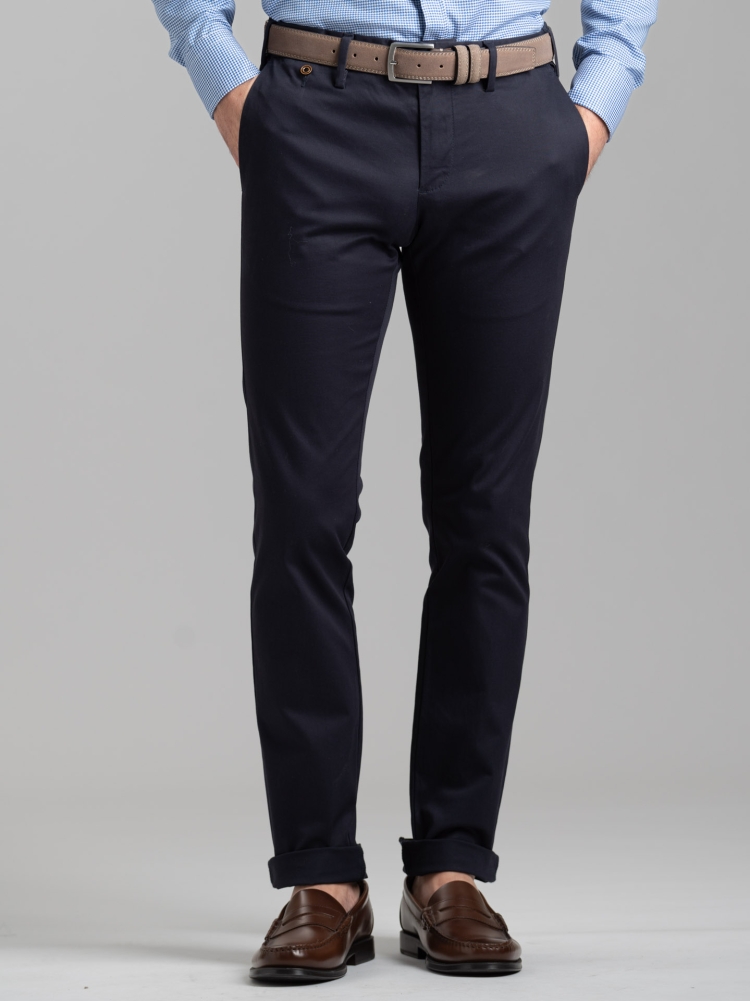 Pantalone uomo modello chino in cotone tricotina stretch tinto pezza, con passante in cintura con doppio bottone, dettagli sartoriali e finiture curate.
