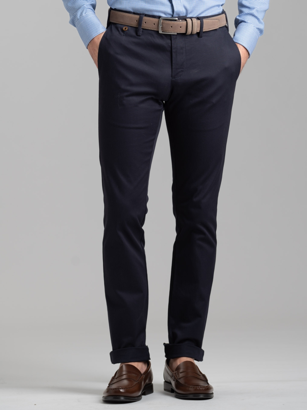 Pantalone uomo modello chino realizzato in cotone tricotina stretch tinto pezza, con taschino porta monete sul davanti e tasche posteriori con patelle impunturate. È presente un passante in cintura con doppio bottone, mentre l'interno sartoriale con sottopancia presenta fodere stampate. Disponibile in quattro varianti colore: blu, verde, panna e sabbia.