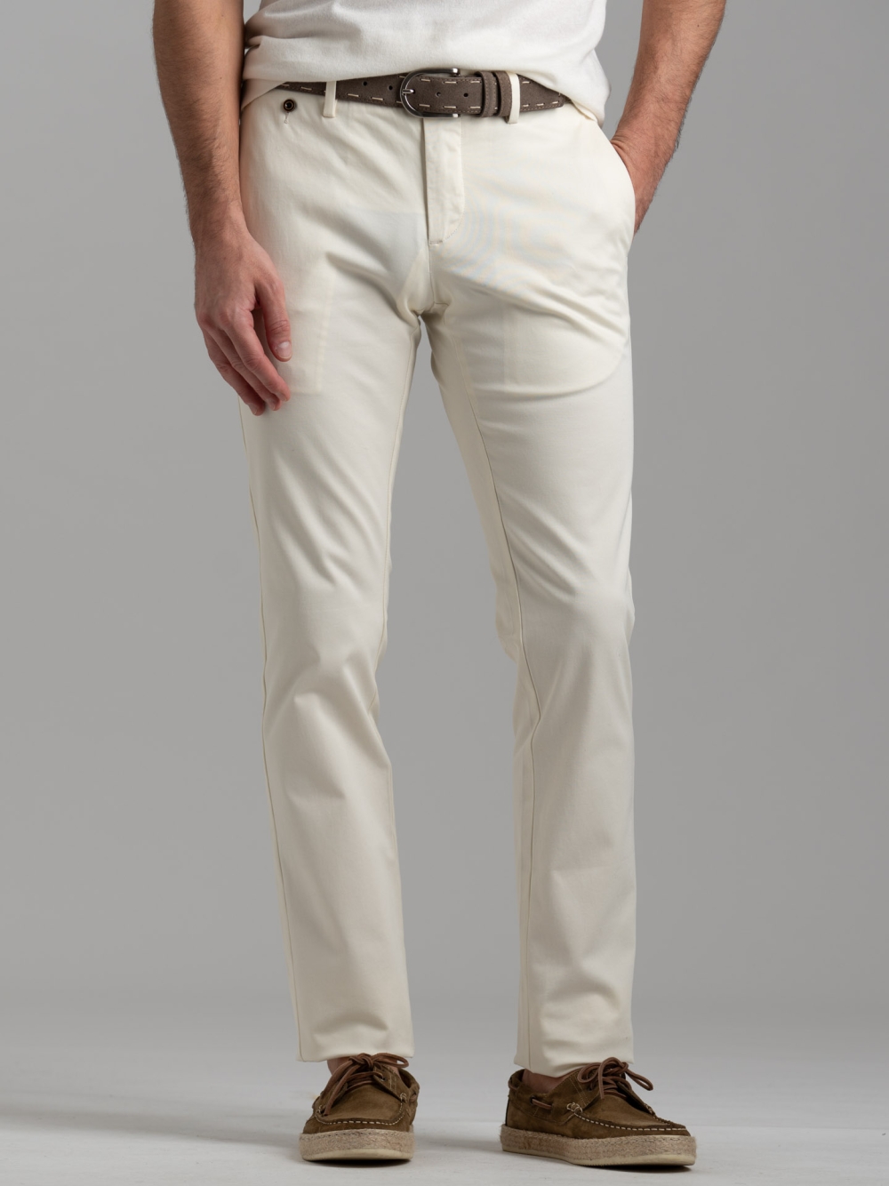 Pantalone uomo modello chino realizzato in cotone tricotina stretch tinto pezza, con taschino porta monete sul davanti e tasche posteriori con patelle impunturate. È presente un passante in cintura con doppio bottone, mentre l'interno sartoriale con sottopancia presenta fodere stampate. Disponibile in quattro varianti colore: blu, verde, panna e sabbia.