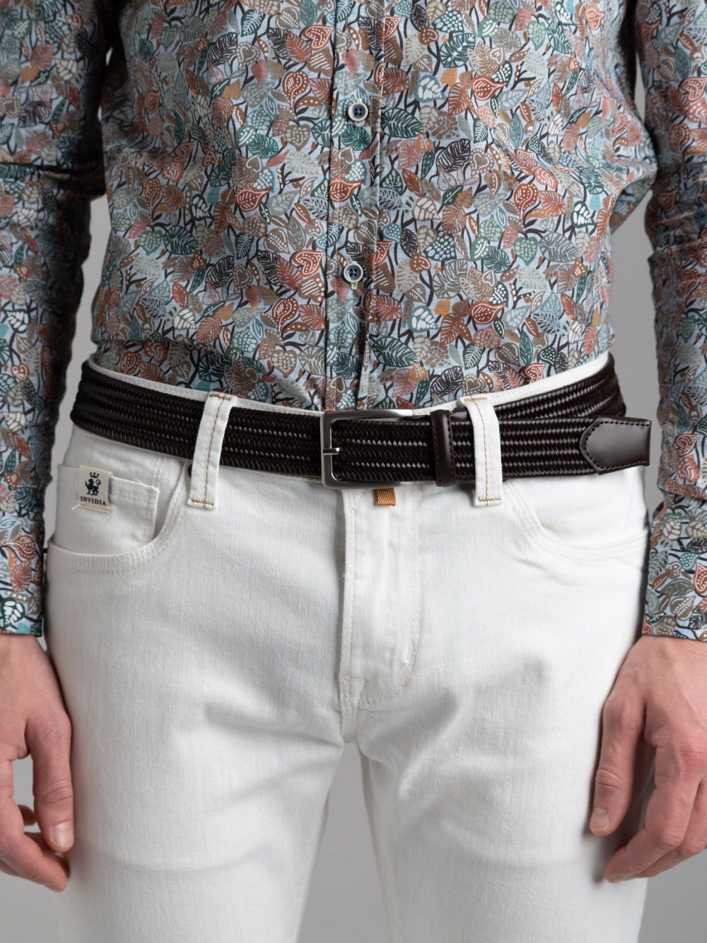 Jeans uomo modello 5 tasche bianco con impunture color biscotto e salpa color sabbia.