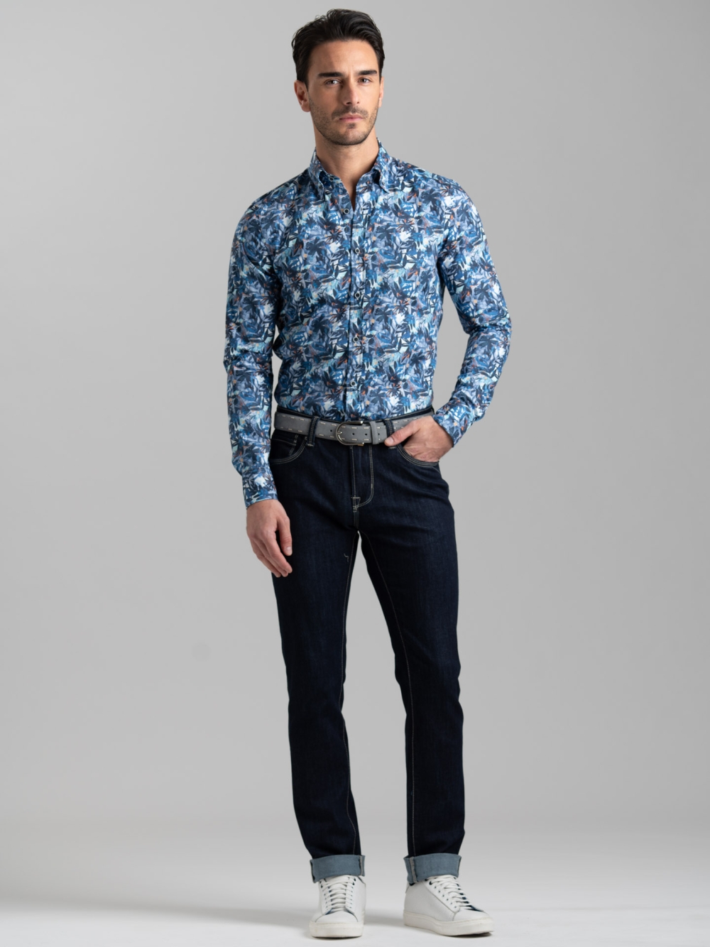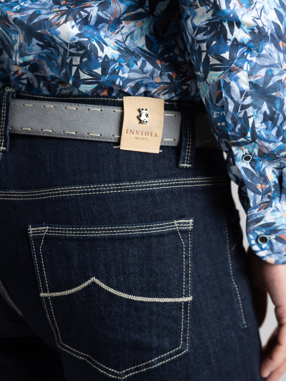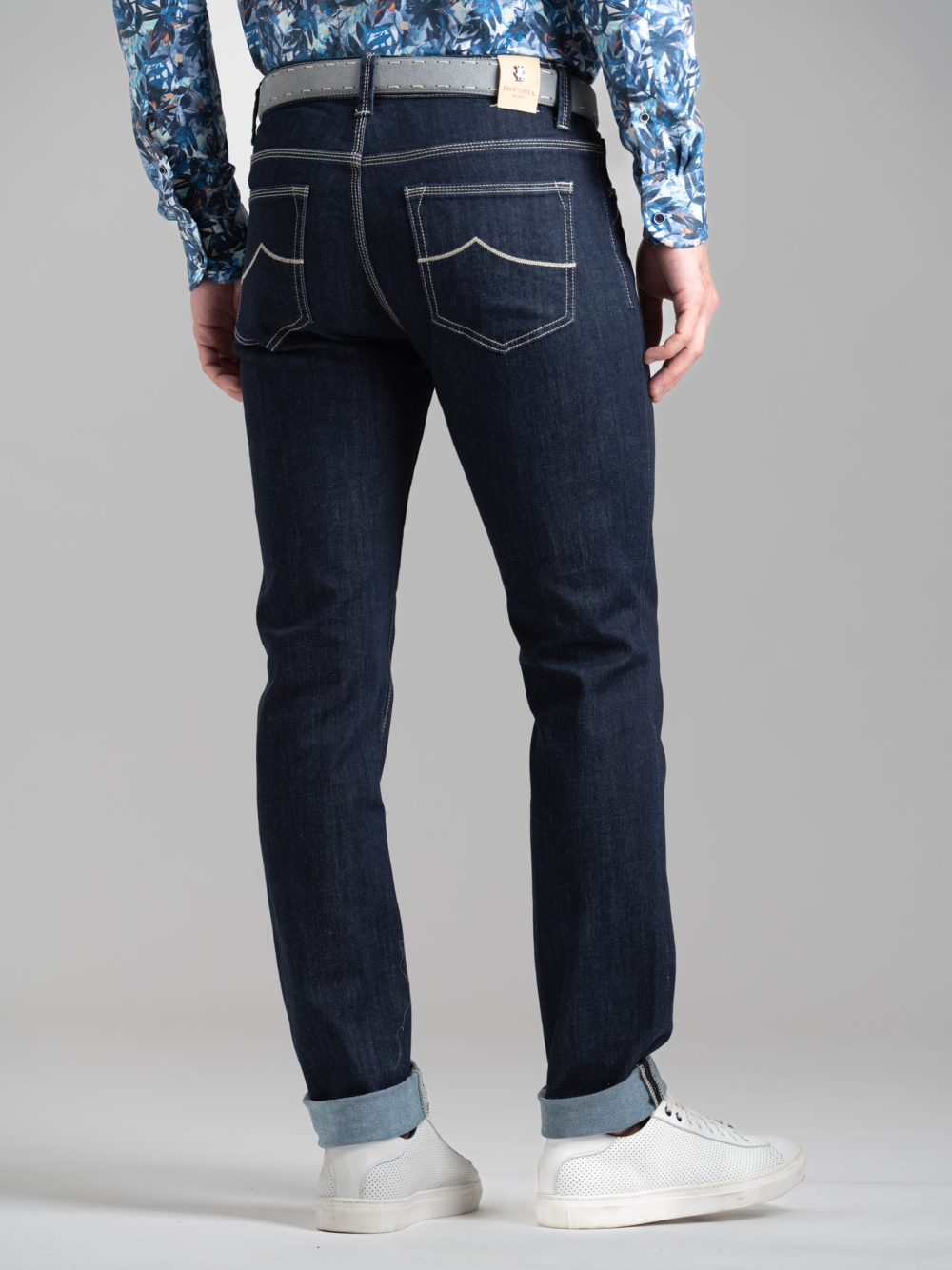 Jeans uomo modello 5 tasche, realizzato in denim blu scuro lavato. Le cuciture color sabbia creano un elegante contrasto, mentre le fodere interne stampate aggiungono una nota sartoriale. Completa il design la salpa color sabbia.