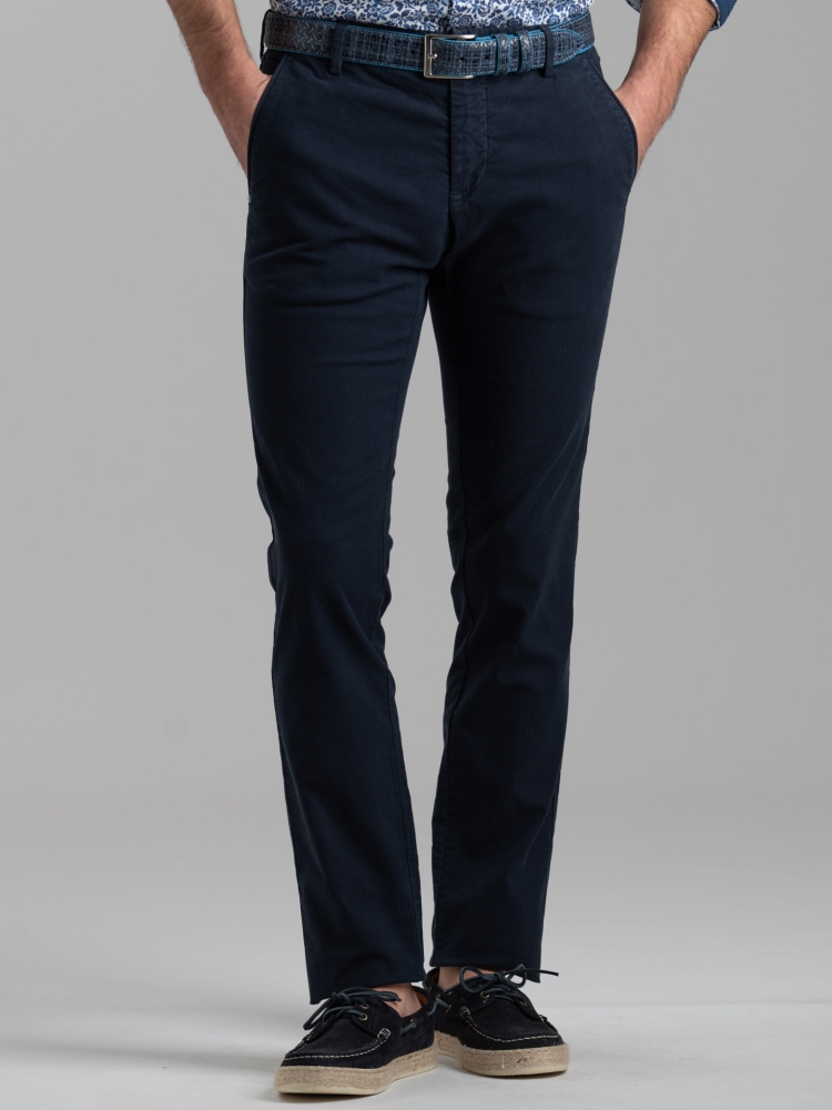 Pantalone uomo modello chino in tessuto micro spina di pesce, tinto capo, con tasca America e cuciture grintose.