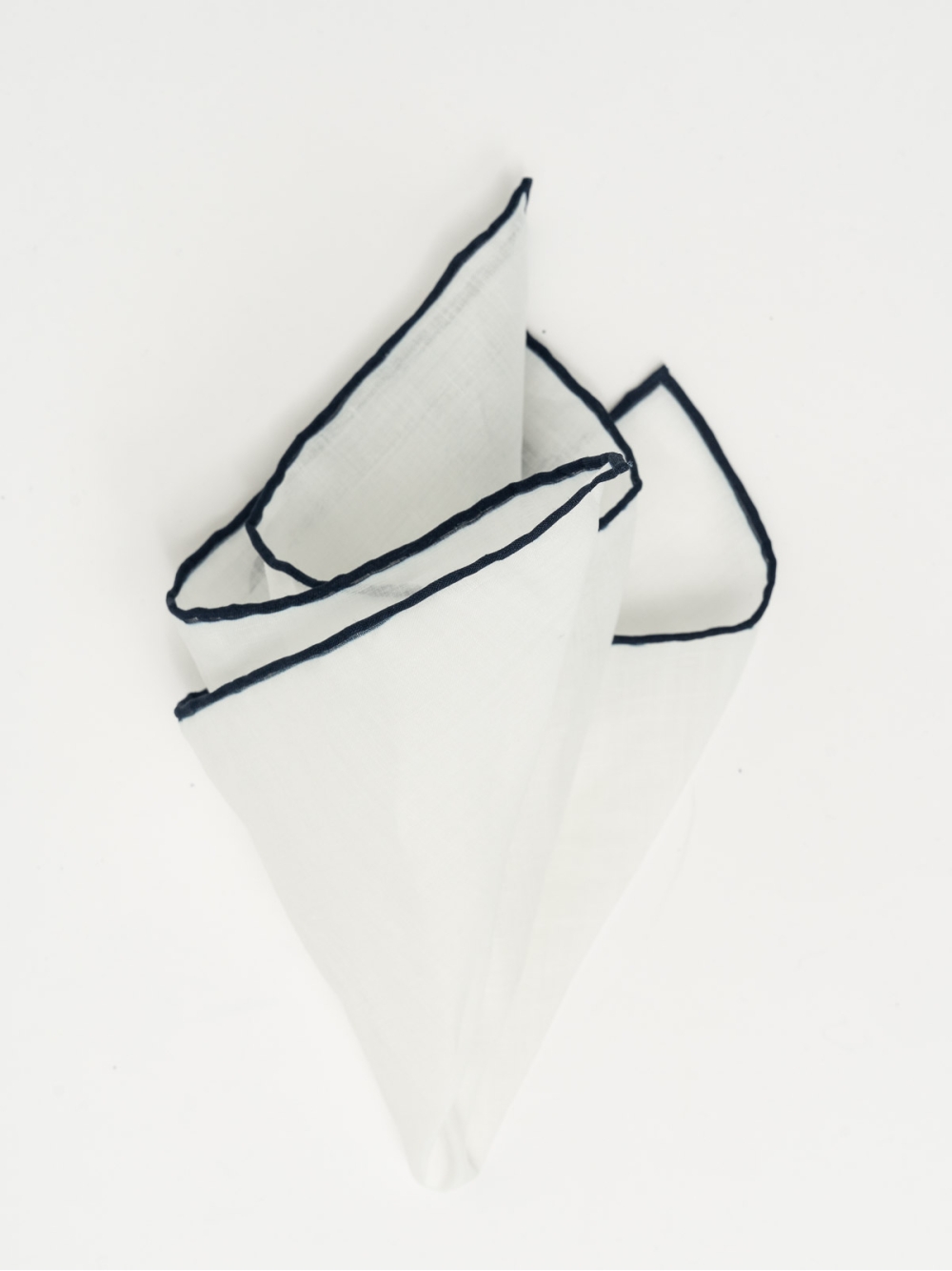Pochette uomo realizzata in tessuto bianco 100% lino con bordo realizzato a mano in colori a contrasto, tutti abbinati alle giacche della collezione.