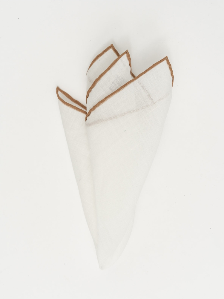 Pochette uomo realizzata in tessuto bianco 100% lino con bordo realizzato a mano in colori a contrasto, tutti abbinati alle giacche della collezione.