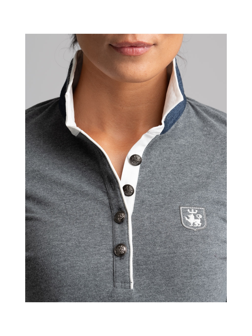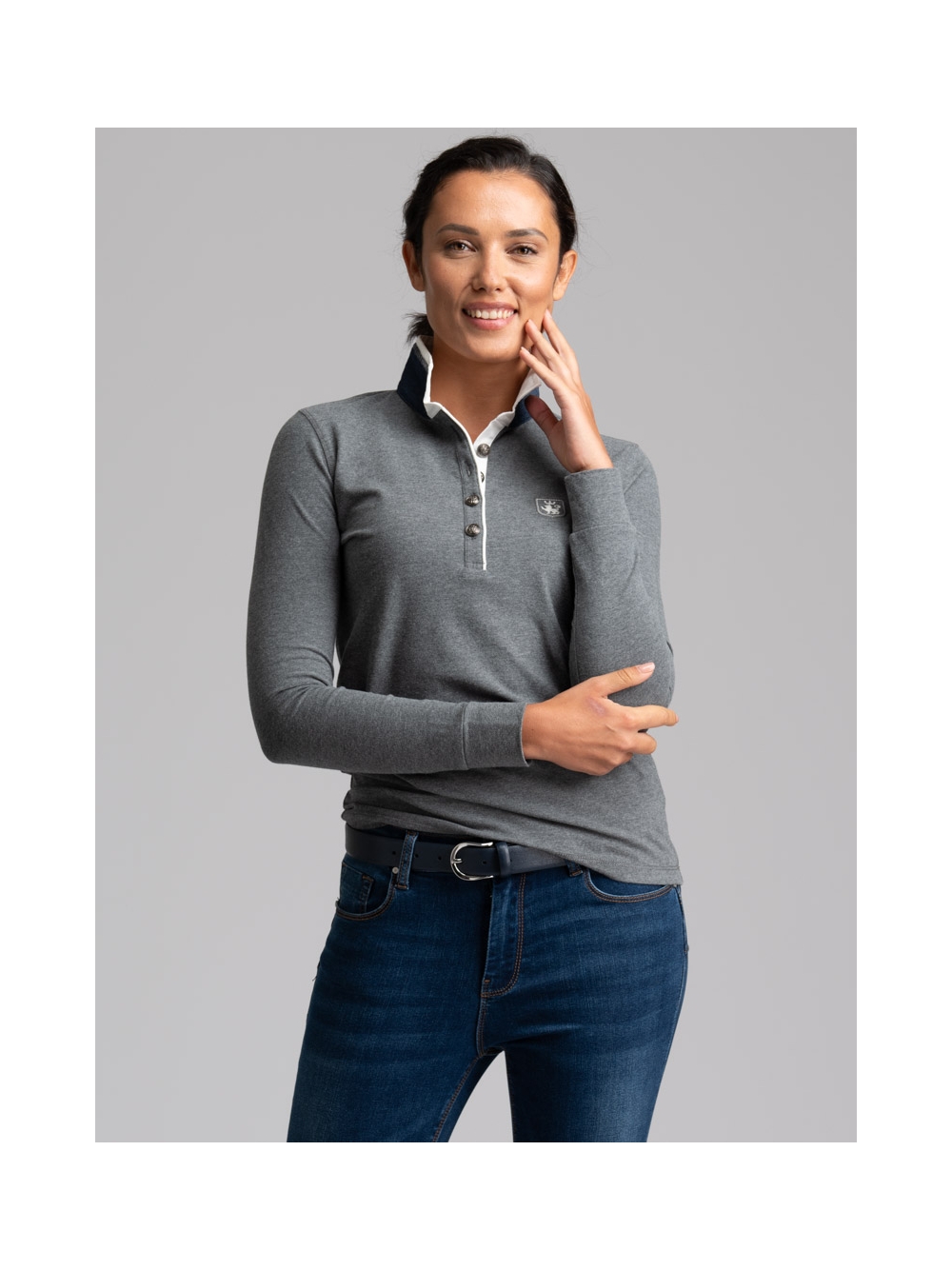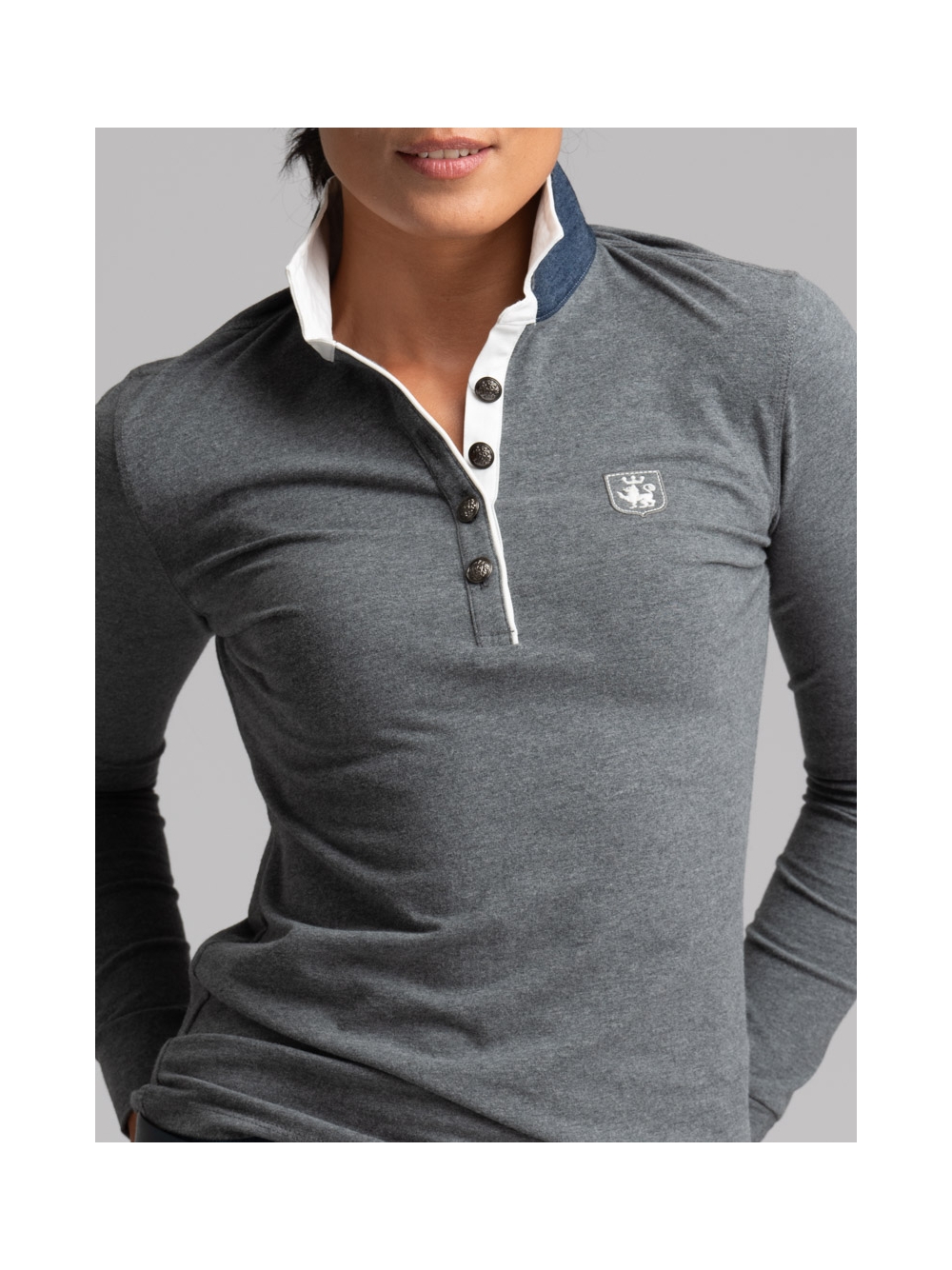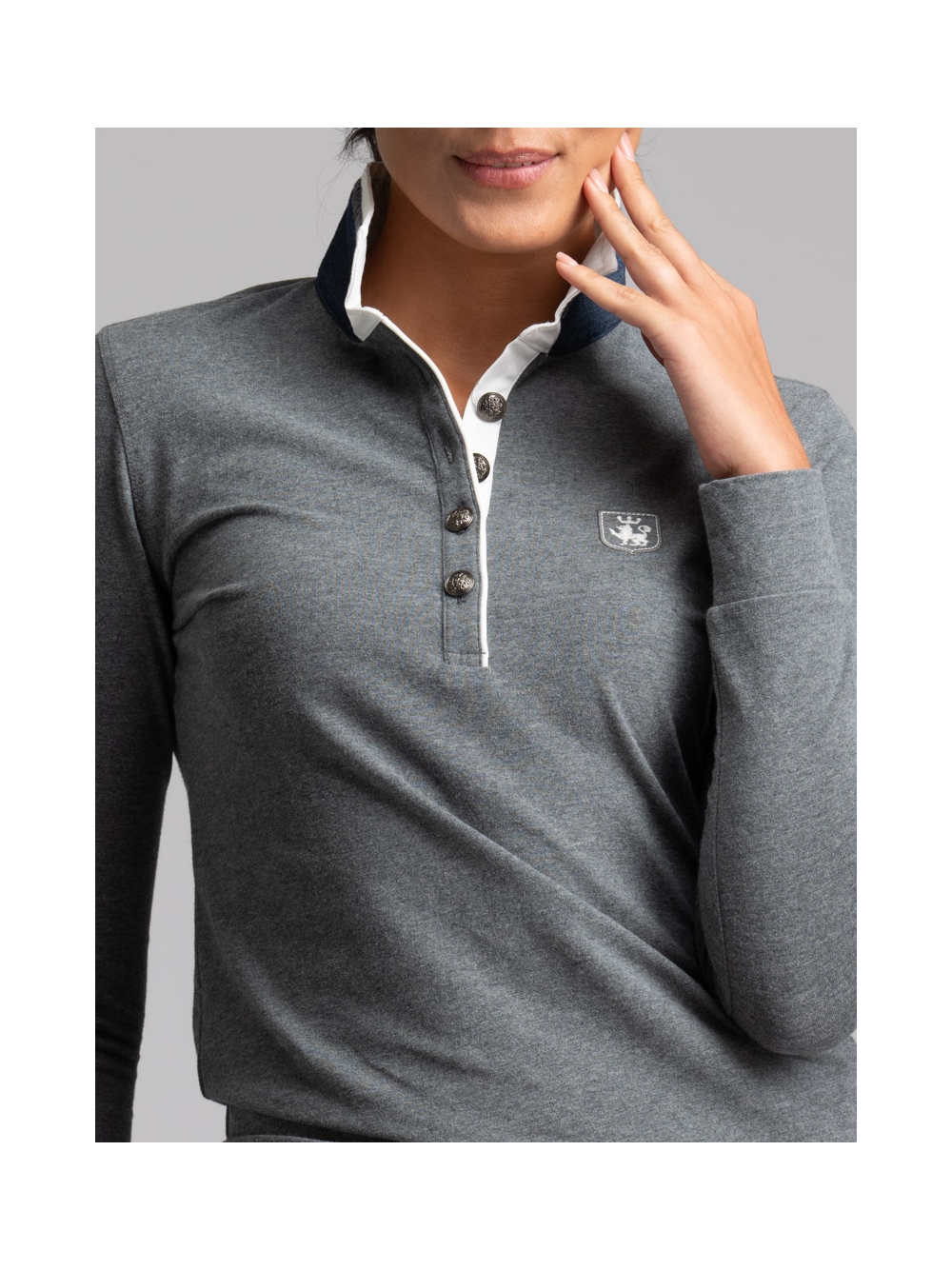 Polo donna a manica lunga modello classico realizzata in cotone Piquet stretch mano calda, un tessuto confortevole ma allo stesso tempo molto resistente, che mantiene la forma e il colore nel tempo. Questa polo è caratterizzata da un doppio collo di colore a contrasto e da un canolo profondo e femminile rifinito con piping, puntoni fatti a mano e bottoni araldici.