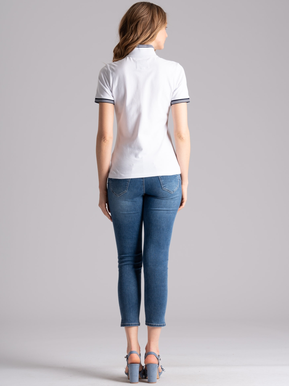 Polo donna in cotone piquet stretch modello mezza manica, collo smacchinato doppio con costina e intarsio, polsini con rib e bottoni ricoperti in tessuto.