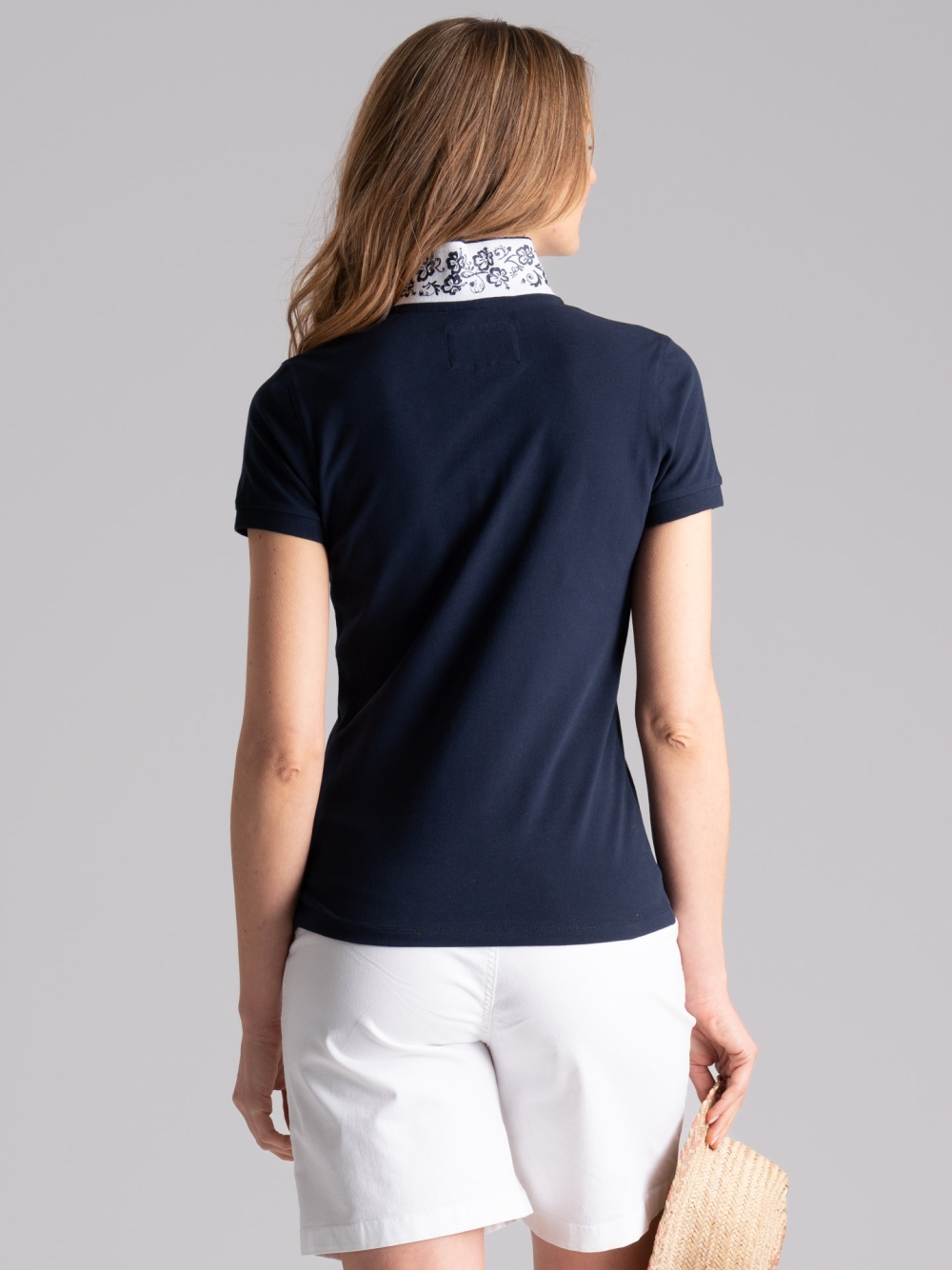 Polo donna in cotone piquet stretch modello mezza manica, collo smacchinato doppio con costina e stampa Hawaii ripresa anche sul canolo.
