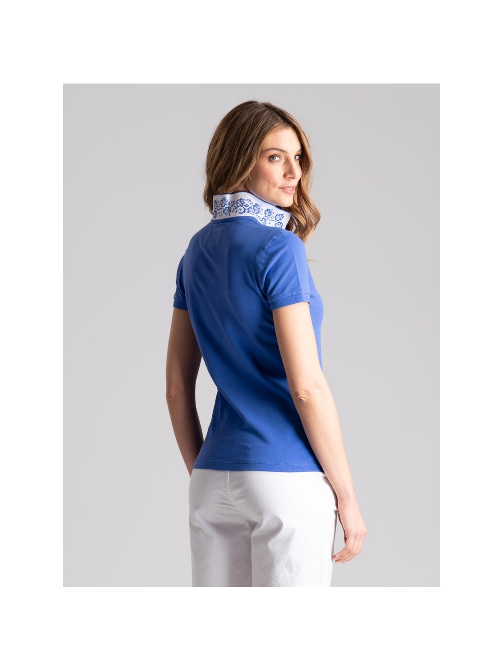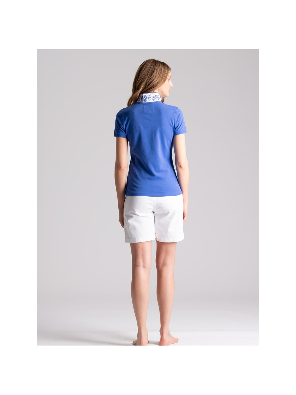 Polo donna in cotone piquet stretch modello mezza manica, collo smacchinato doppio con costina e stampa Hawaii ripresa anche sul canolo.