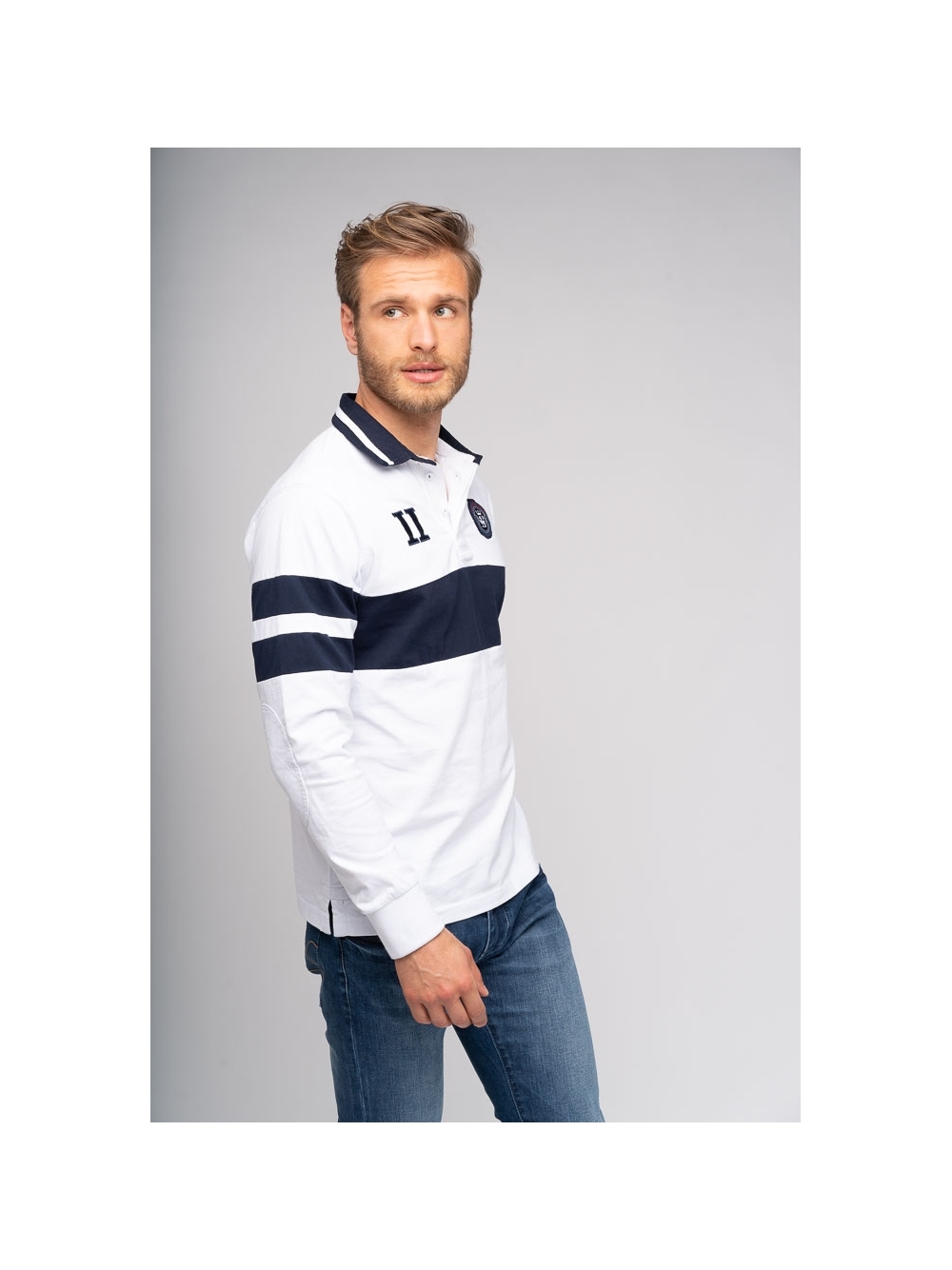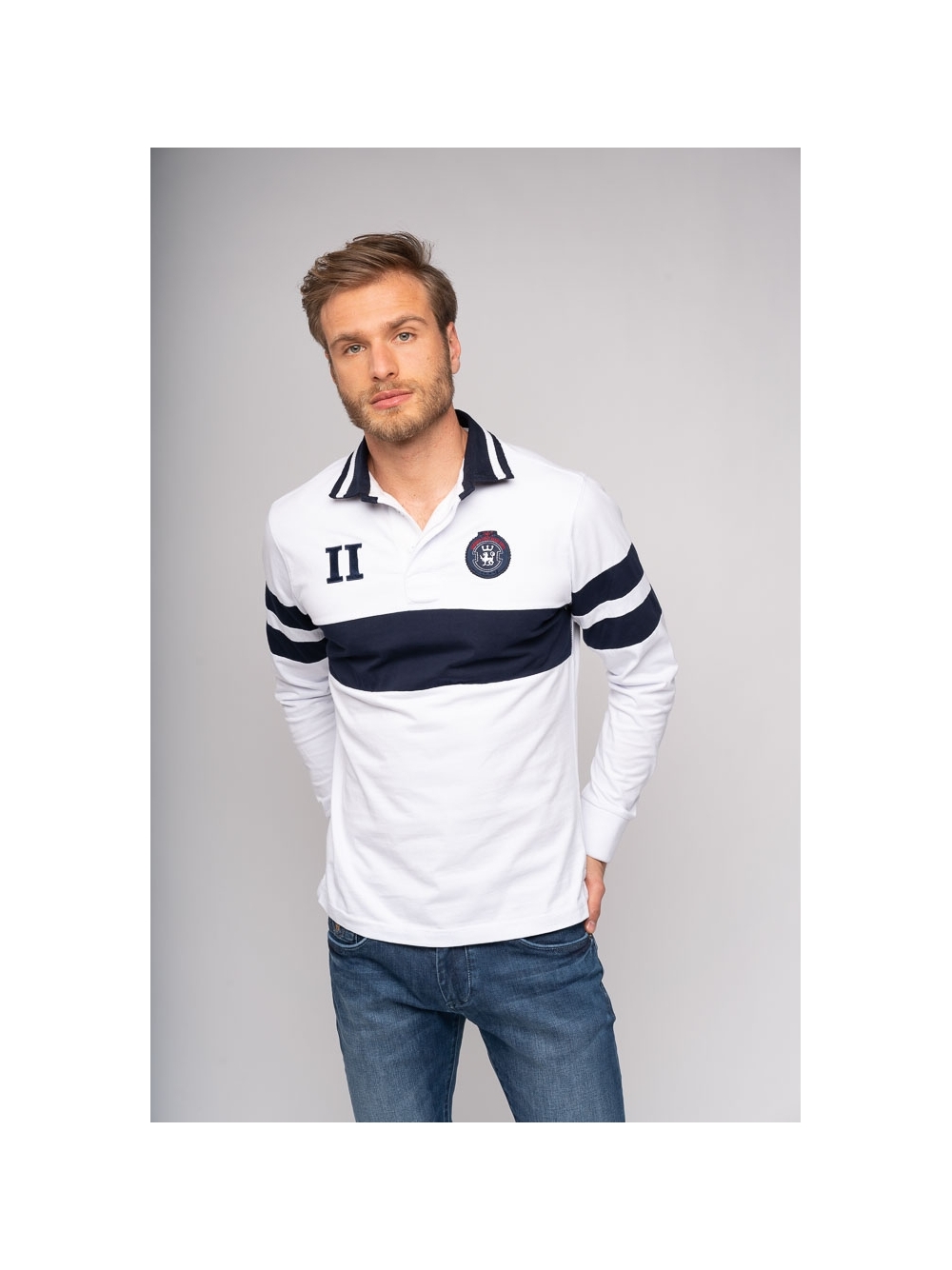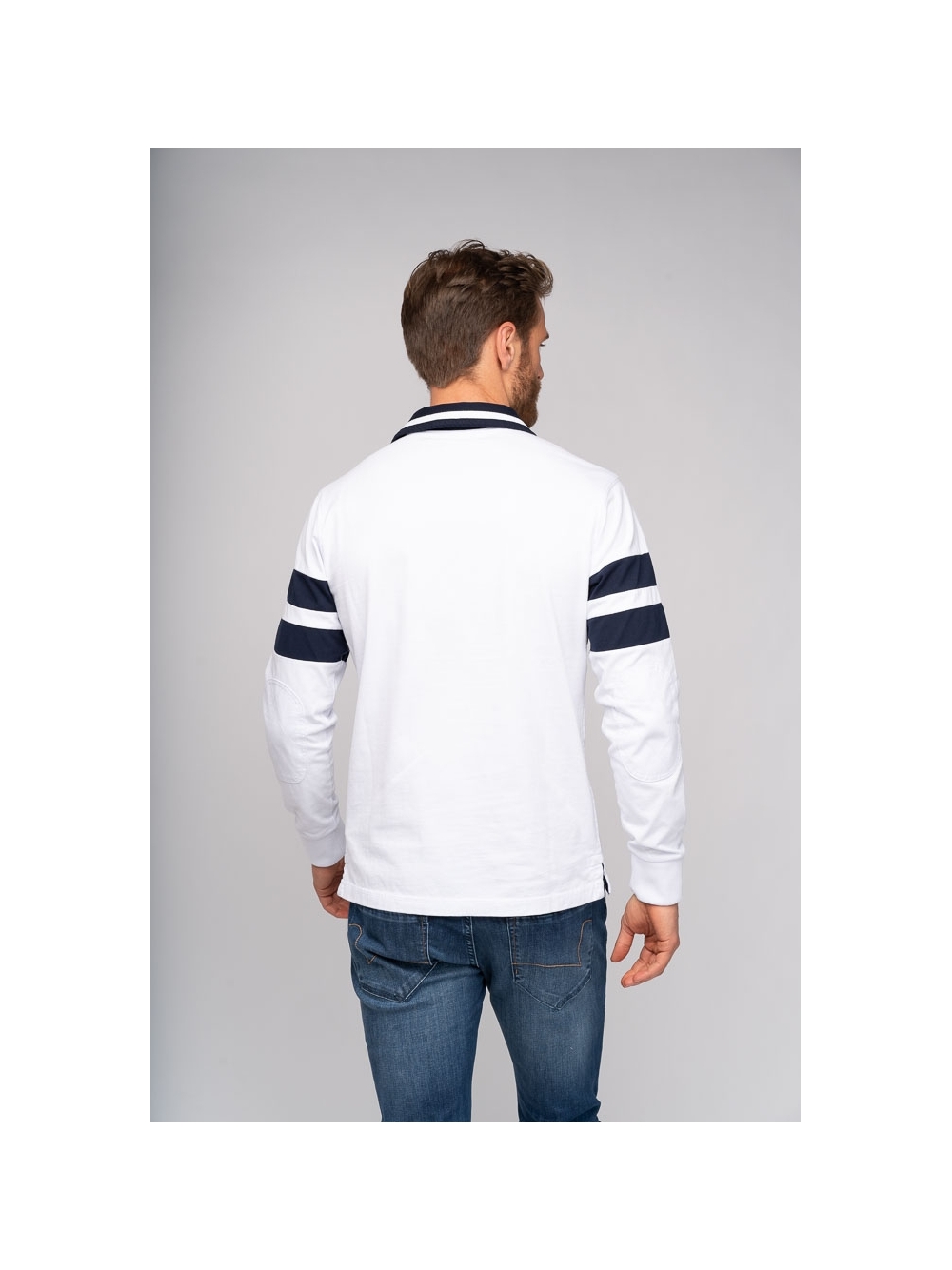 Polo uomo manica lunga, realizzata in jersey in stile rugby, impreziosita da inserti in tessuto a contrasto e patch ricamato.