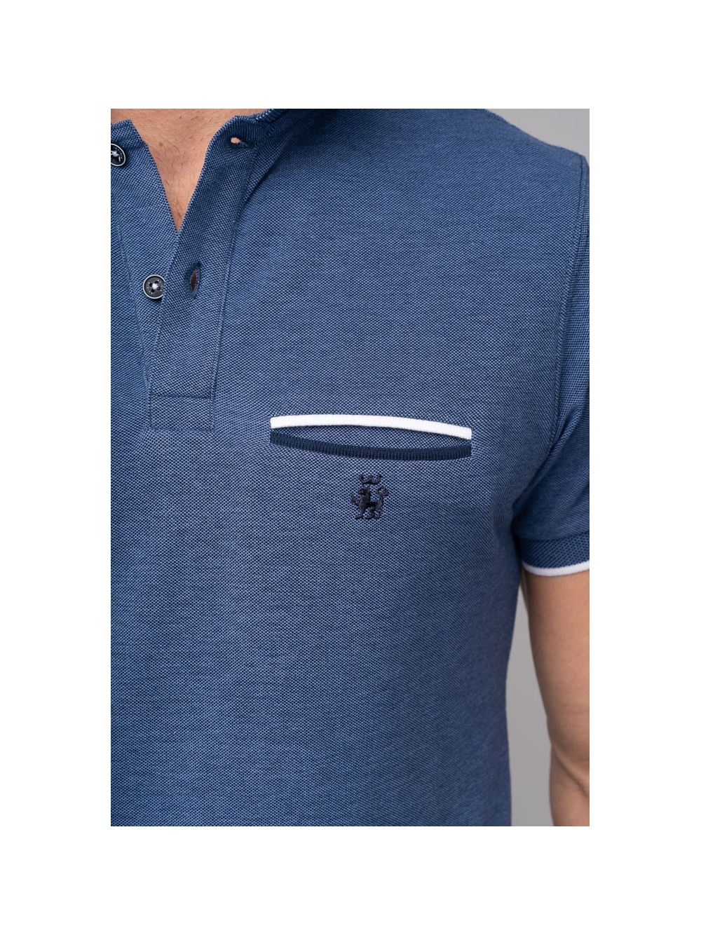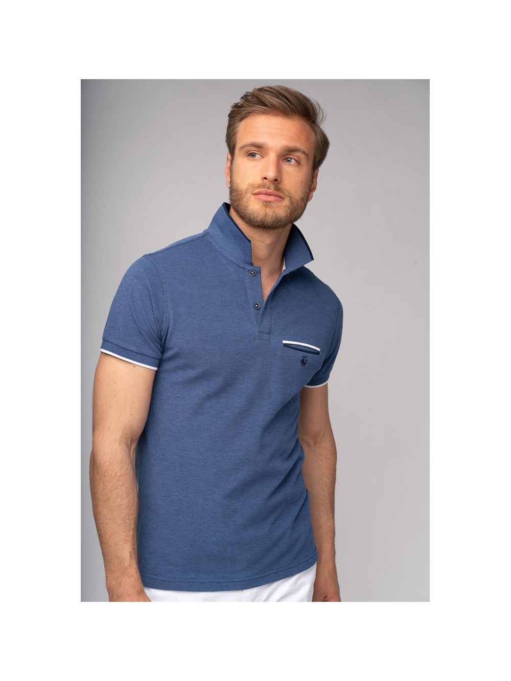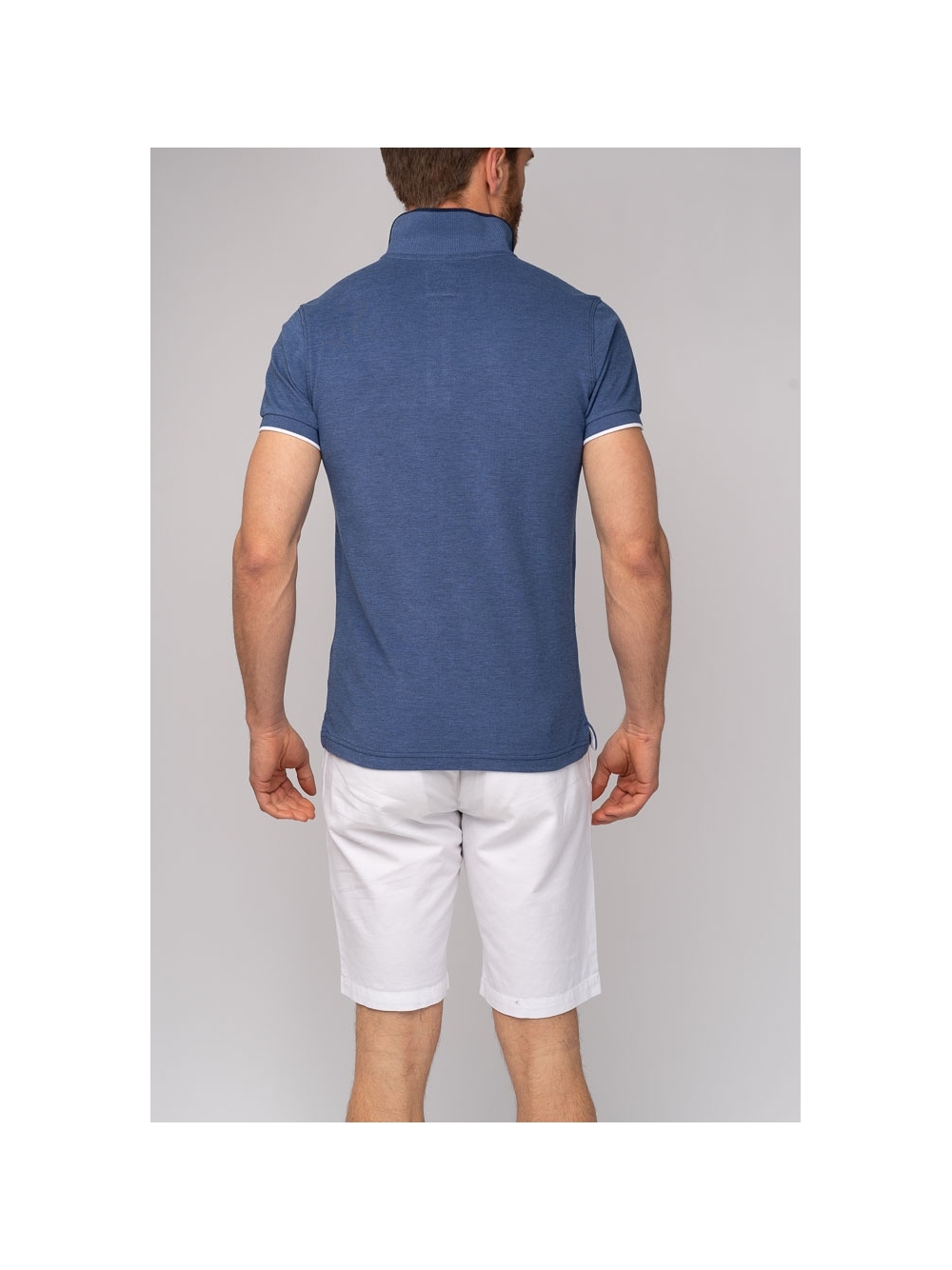Polo uomo a maniche corte realizzata in cotone piquet tinto filo melange, con taschino a filetto e logo ricamato, presenta finiture in colore a contrasto su colletto e fondo manica.