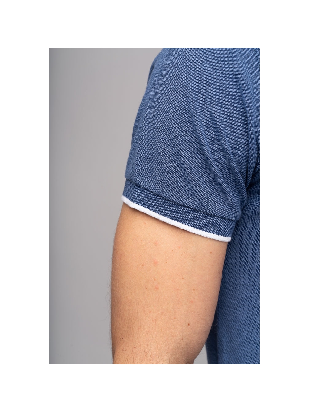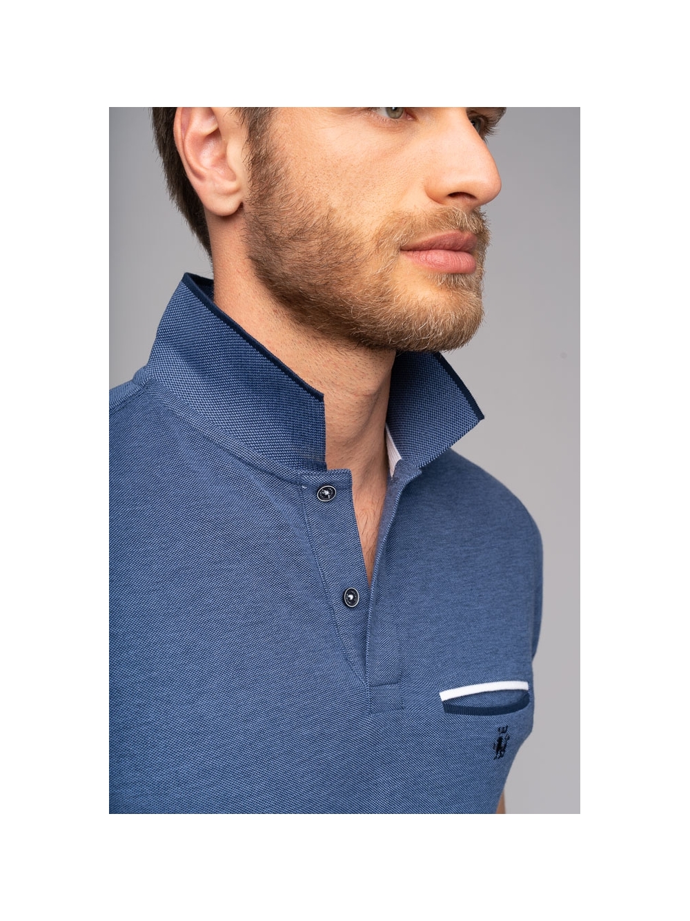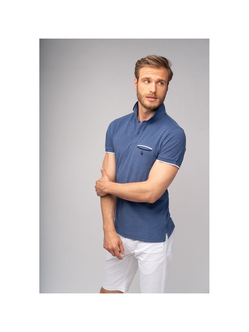 Polo uomo a maniche corte realizzata in cotone piquet tinto filo melange, con taschino a filetto e logo ricamato, presenta finiture in colore a contrasto su colletto e fondo manica.