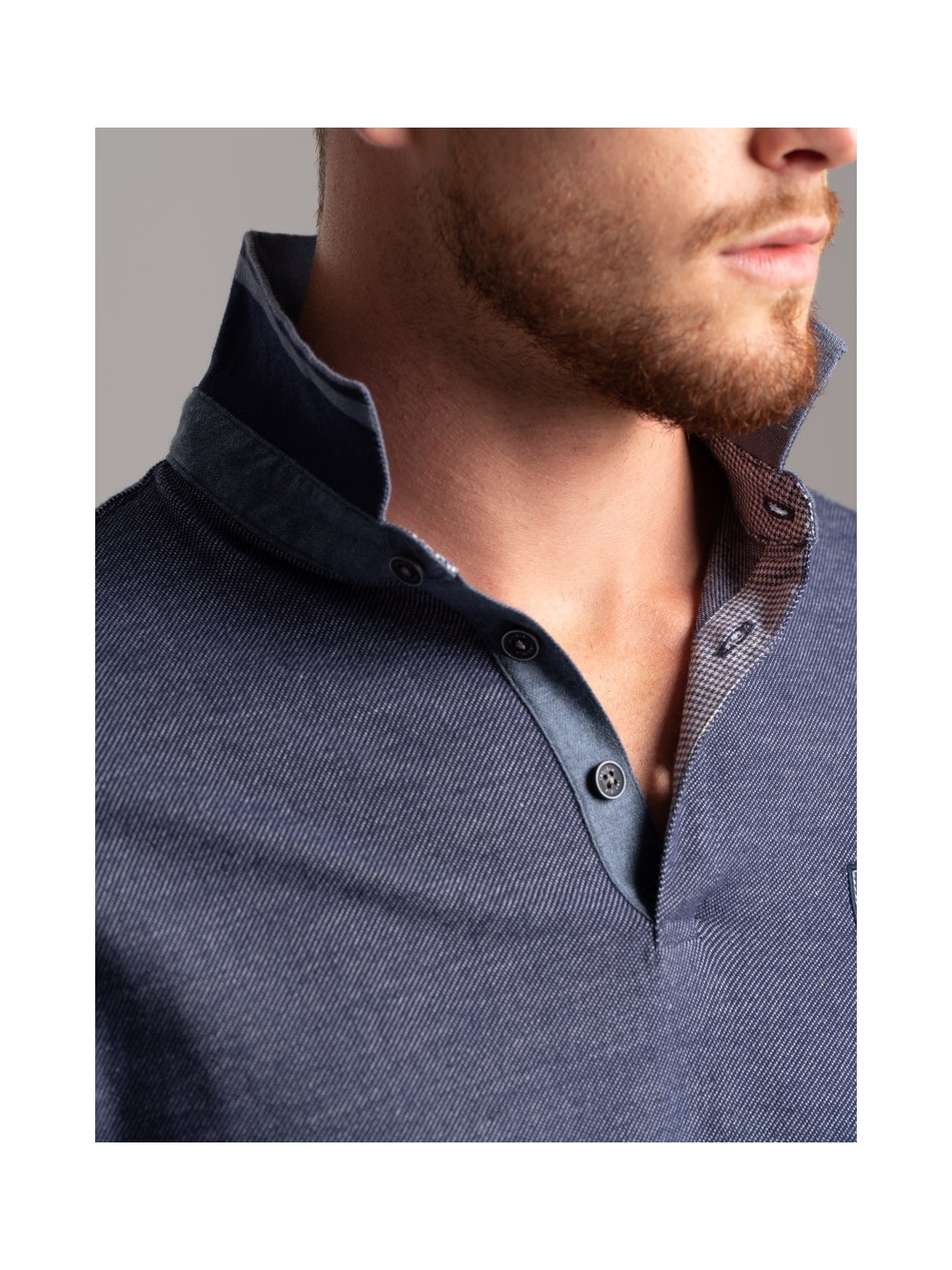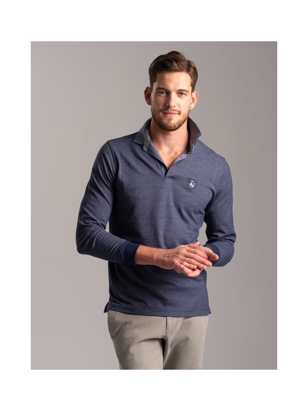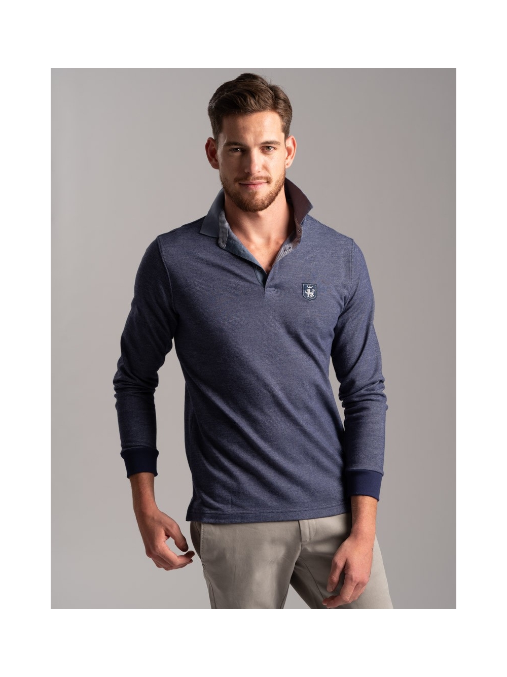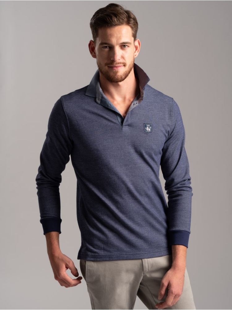 Polo uomo manica lunga, realizzata in tessuto diagonale. Tinto filo con inserti preziosi, disegno camiceria, Rib collo a contrasto.