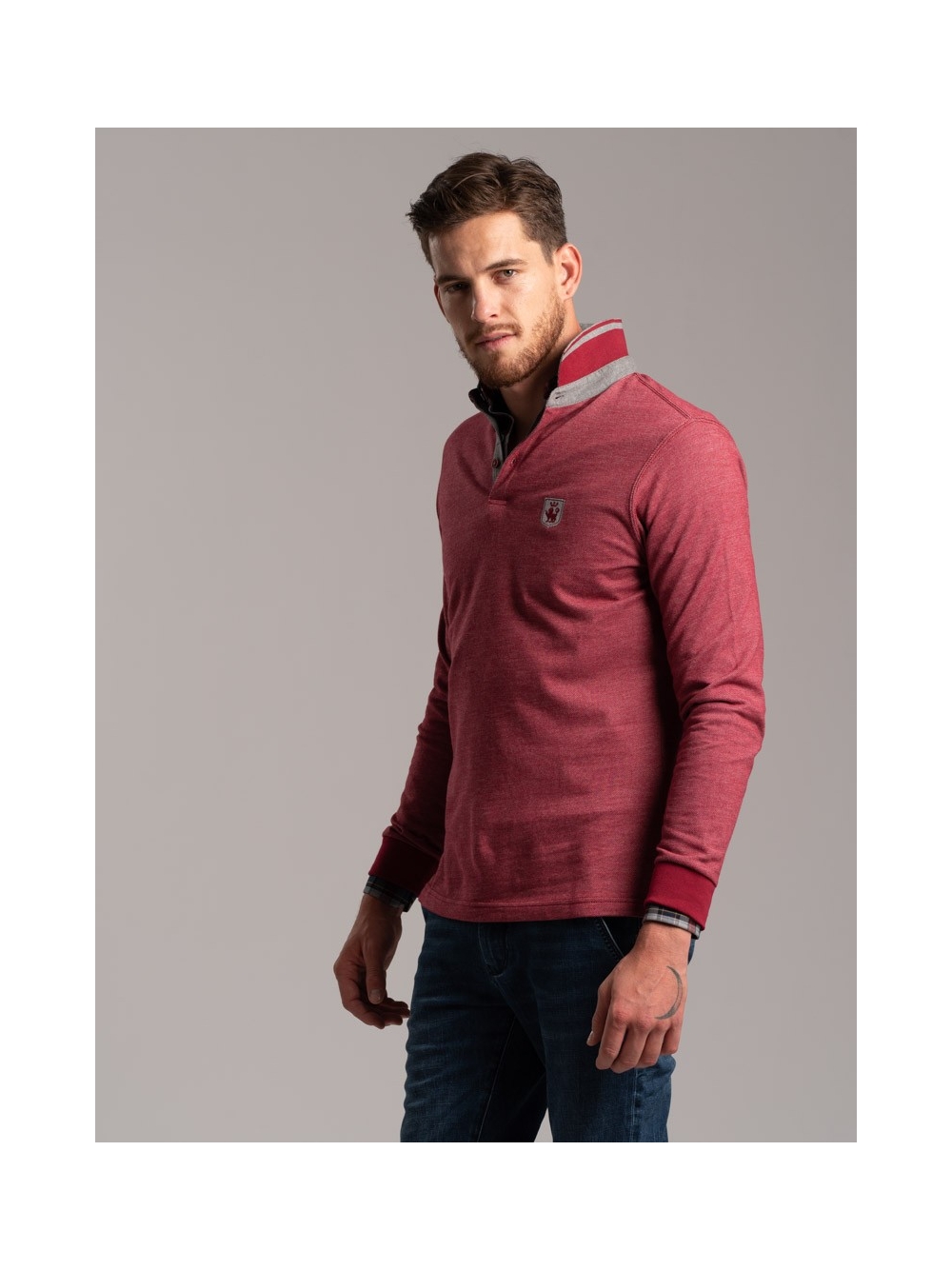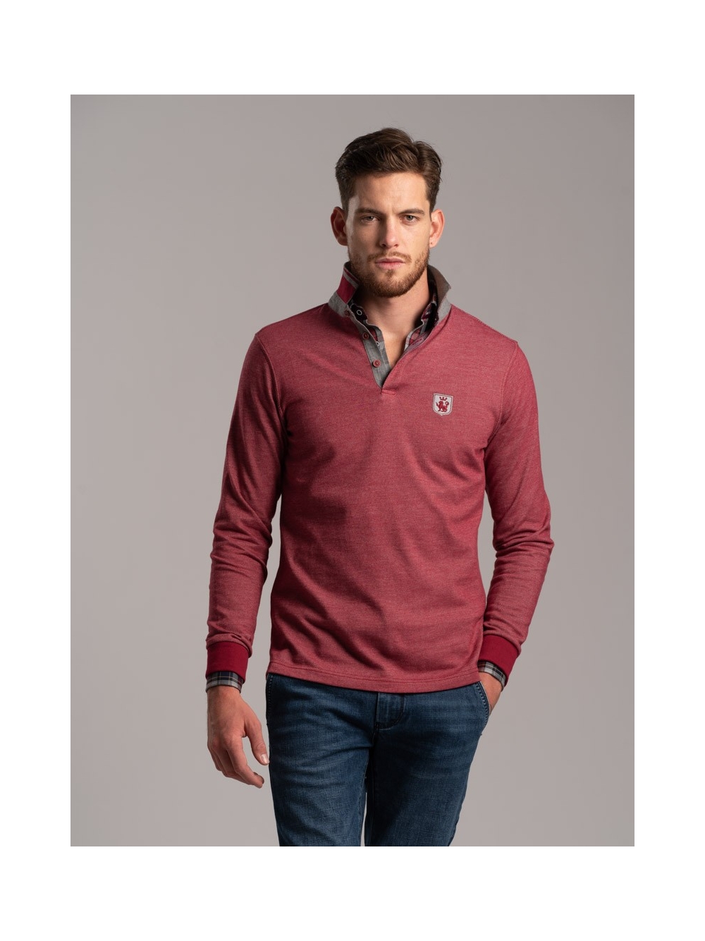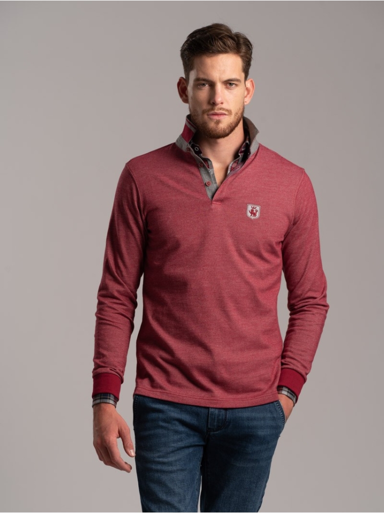 Polo uomo manica lunga, realizzata in tessuto diagonale. Tinto filo con inserti preziosi, disegno camiceria, Rib collo a contrasto.