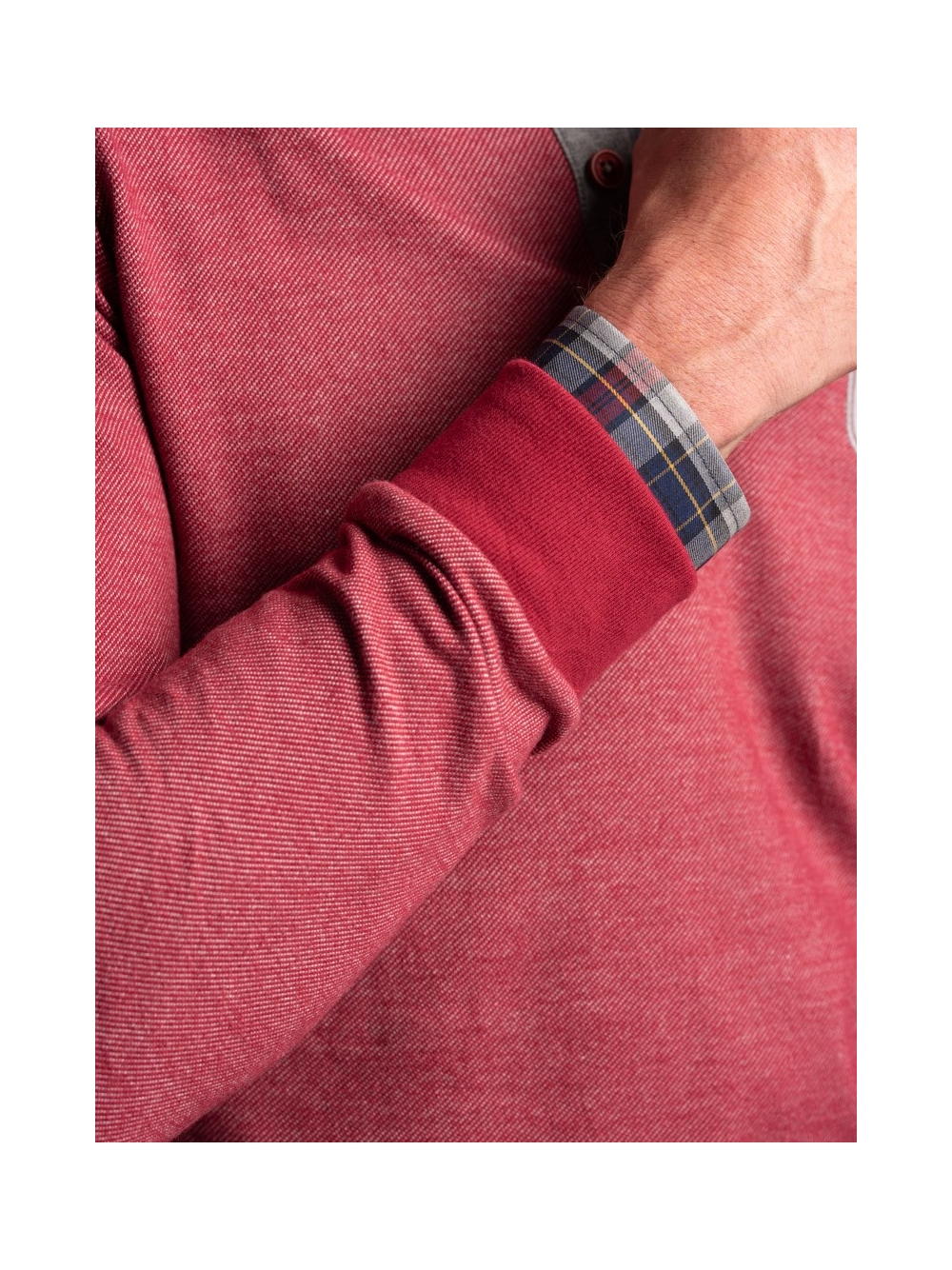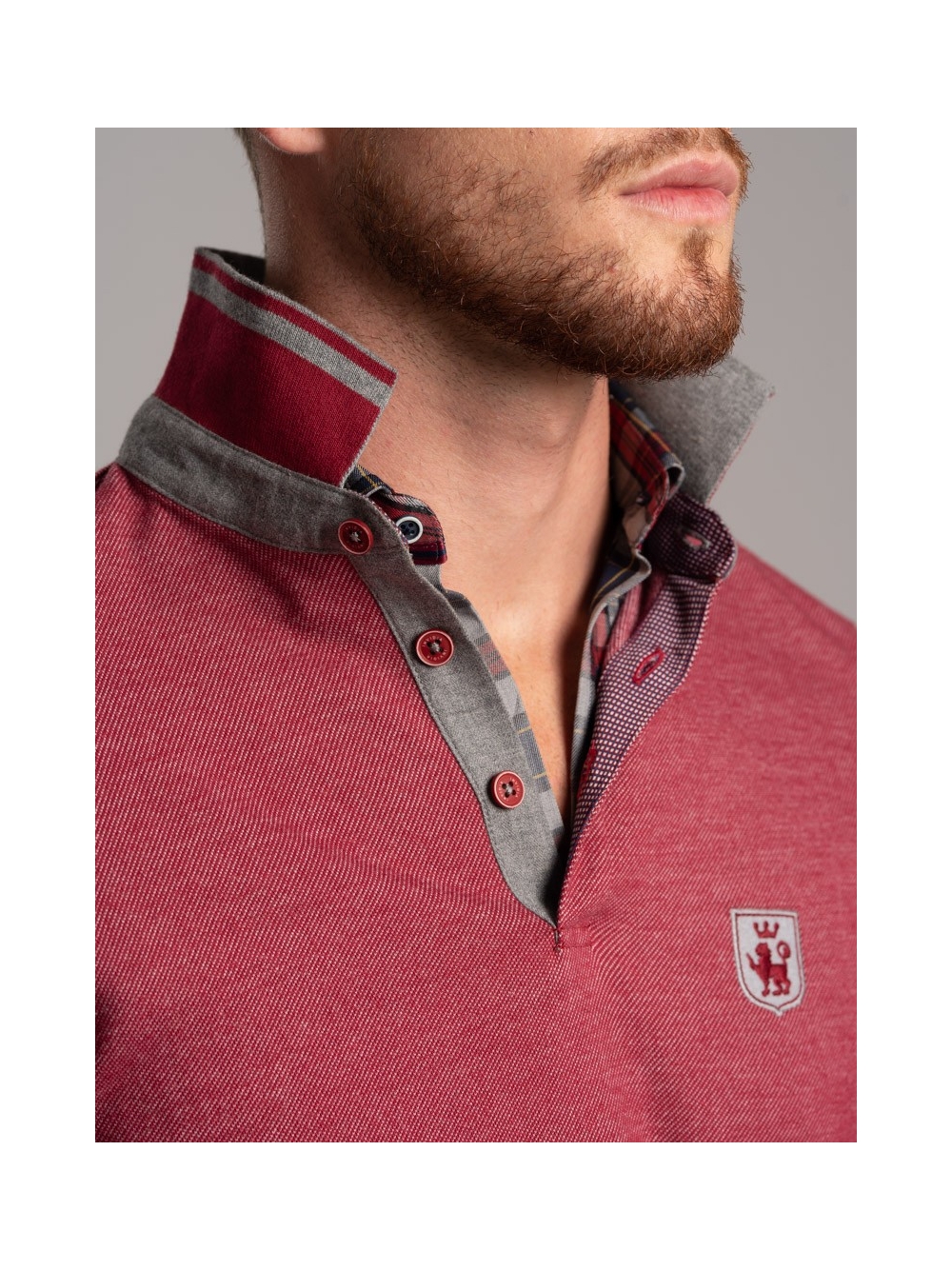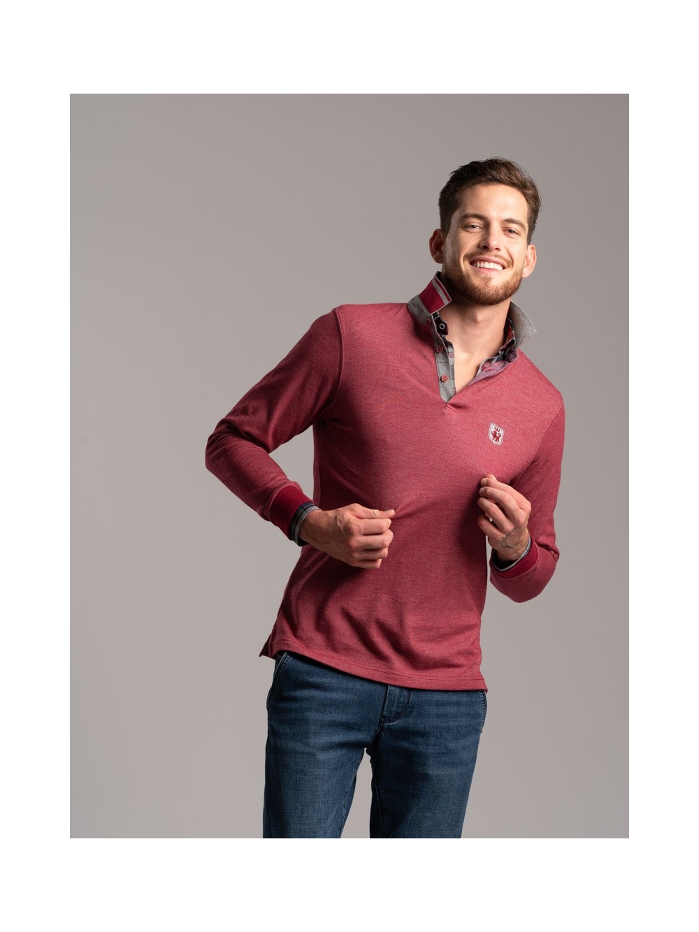 Polo uomo manica lunga, realizzata in tessuto diagonale. Tinto filo con inserti preziosi, disegno camiceria, Rib collo a contrasto.