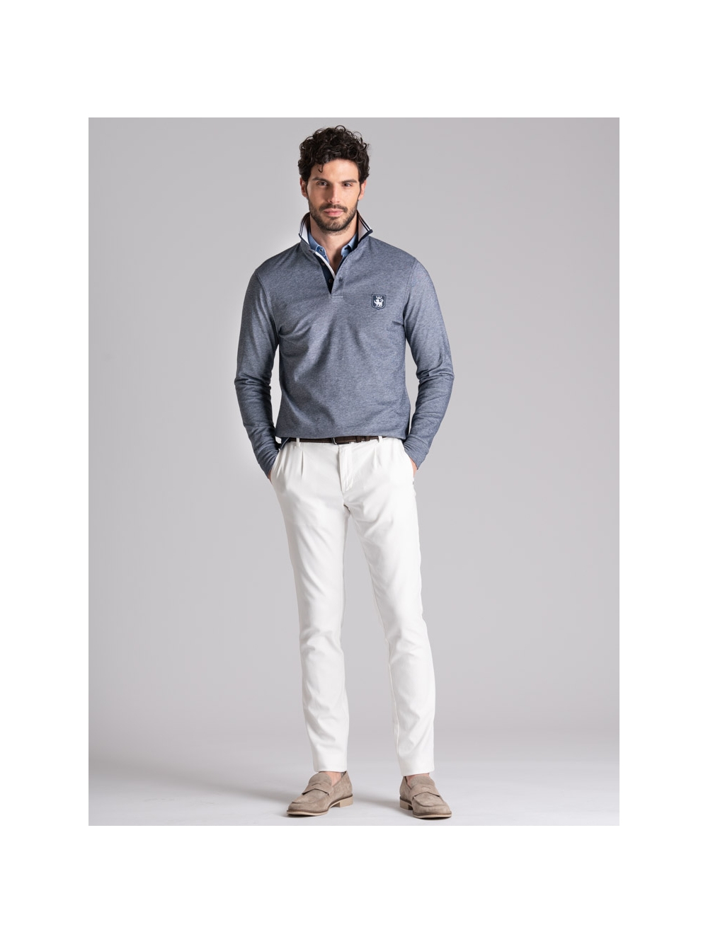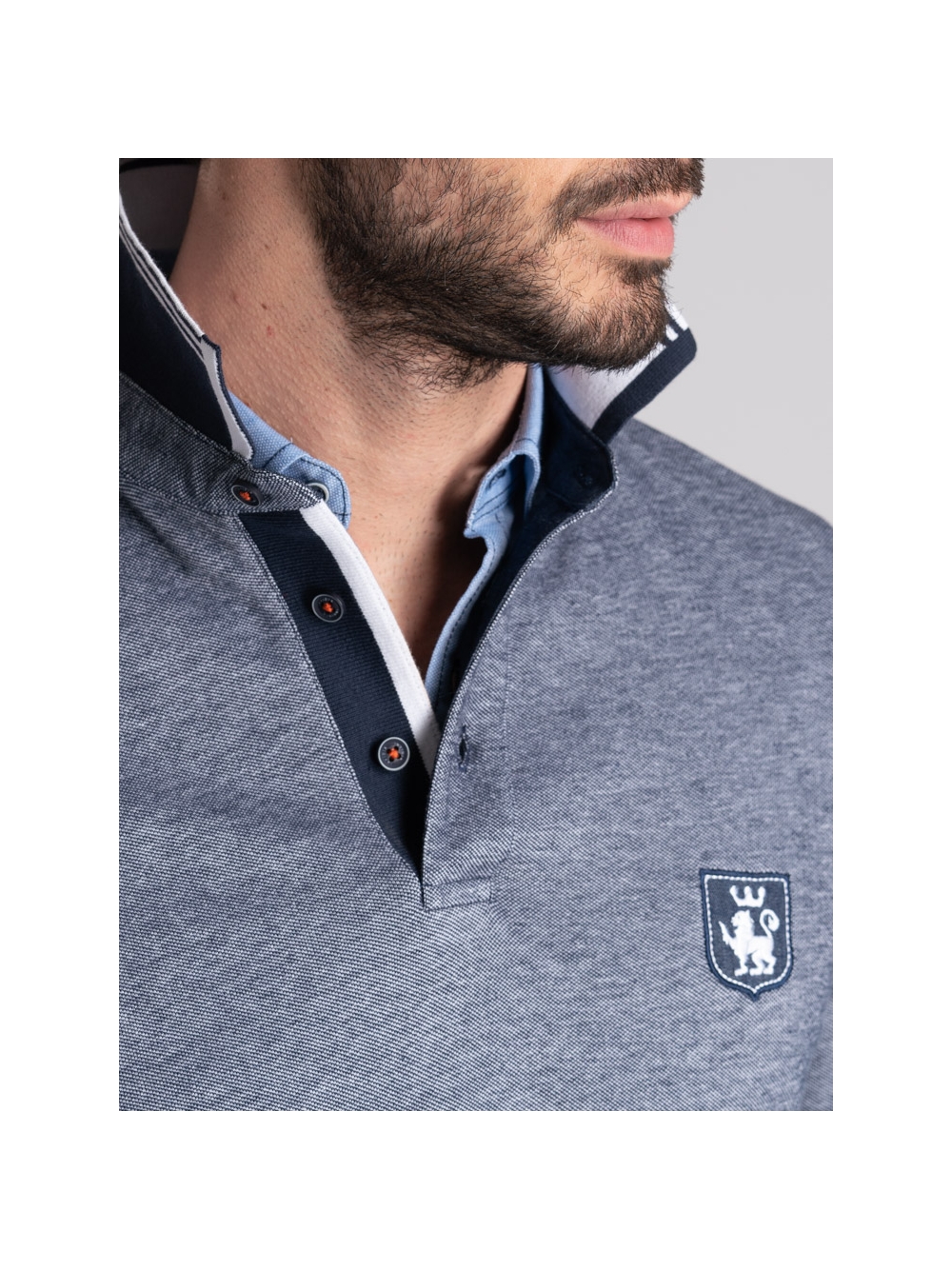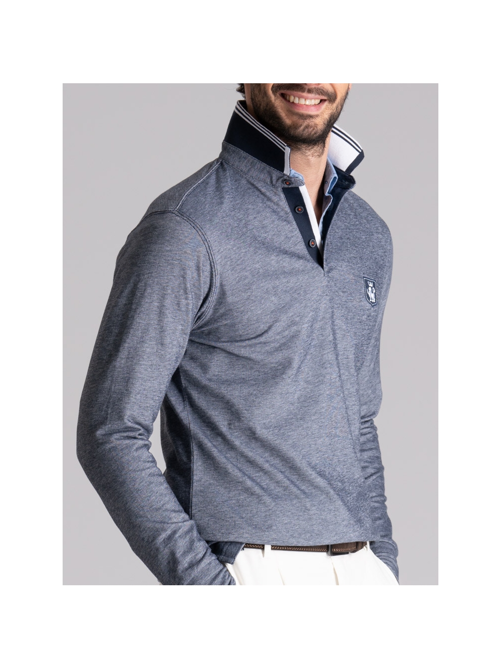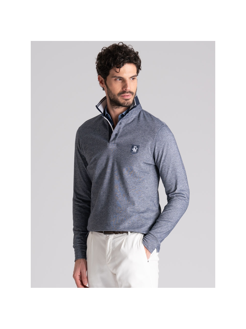 Polo uomo tinto filo in tessuto di cotone piquet a due fili, a manica lunga con collo smacchinato doppio e logo patch.