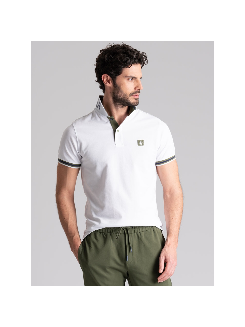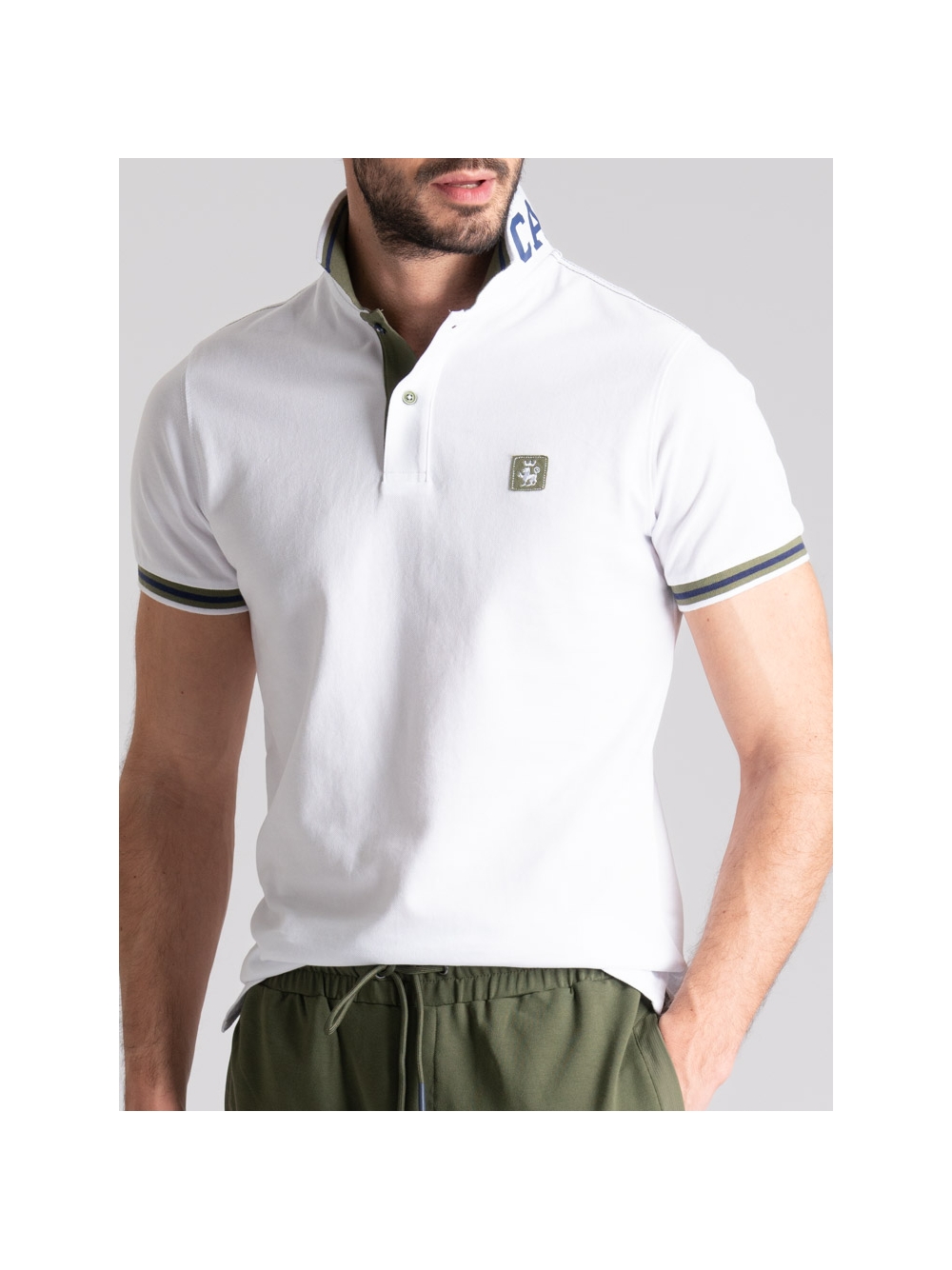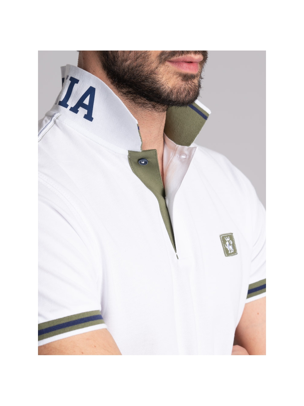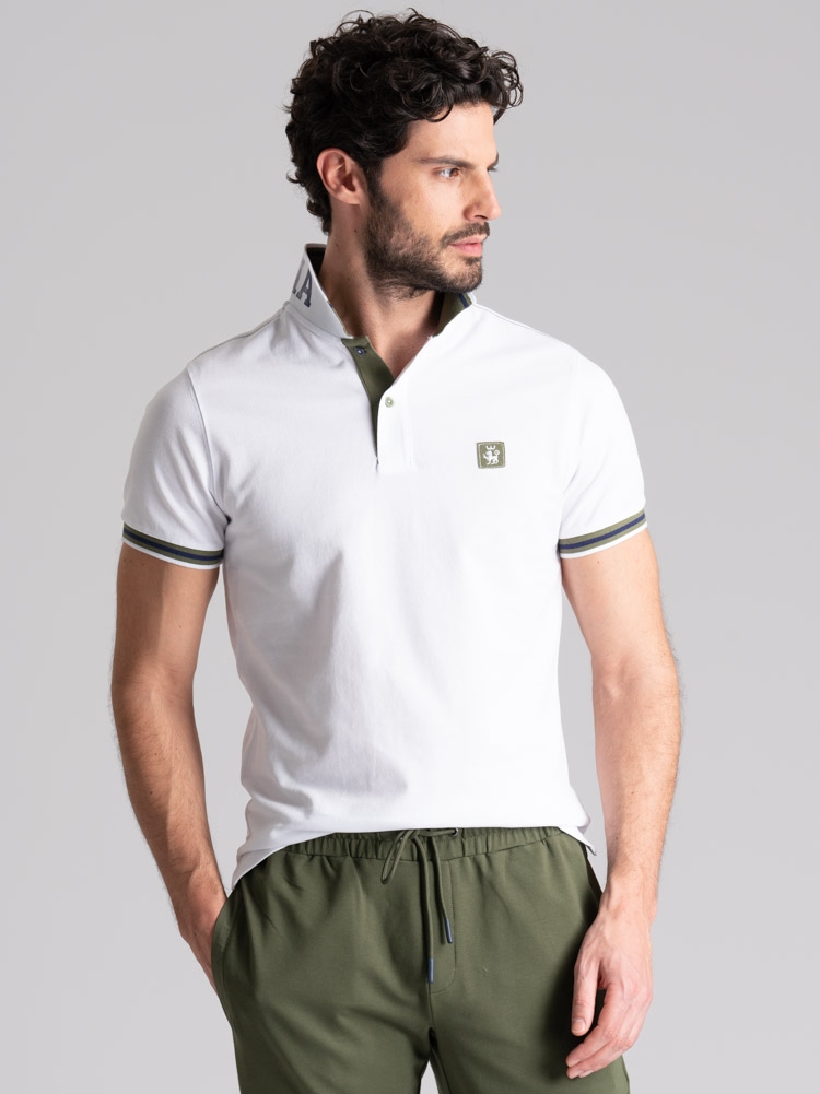 Polo uomo mezza manica realizzata in tessuto piquet 100% cotone, caratterizzata dal collo smacchinato doppio con stampa californiana all’esterno e riga colore a contrasto all’interno, ripresa anche sul rib del polsino della manica. Questa polo presenta cuciture in colore a contrasto sulle spalle, nastro canolo dello stesso colore del collo e il logo INVIDIA 1973 applicato. Disponibile nelle varianti colore bianco, verde e blu chiaro.