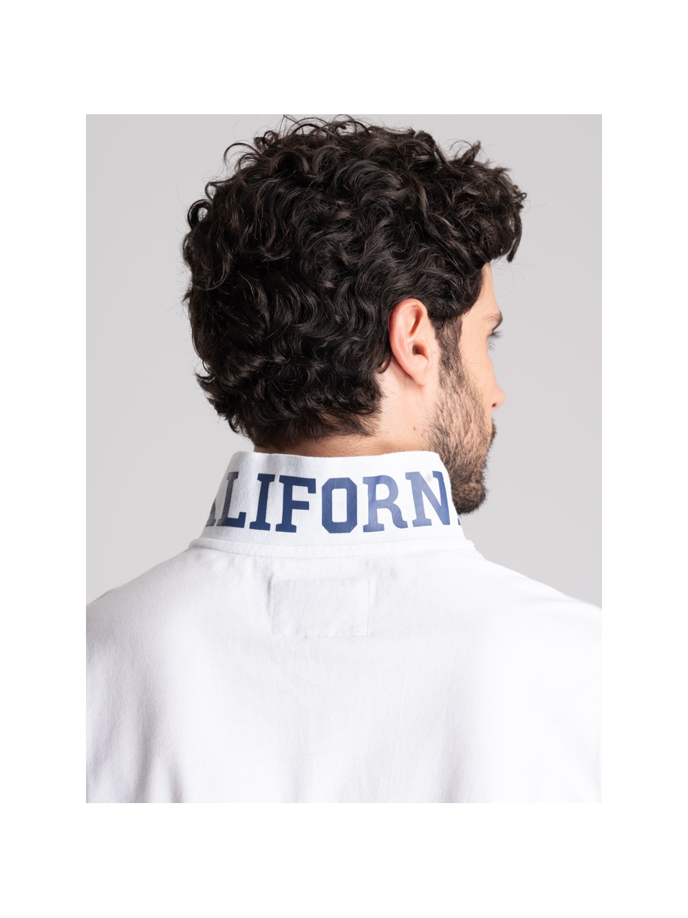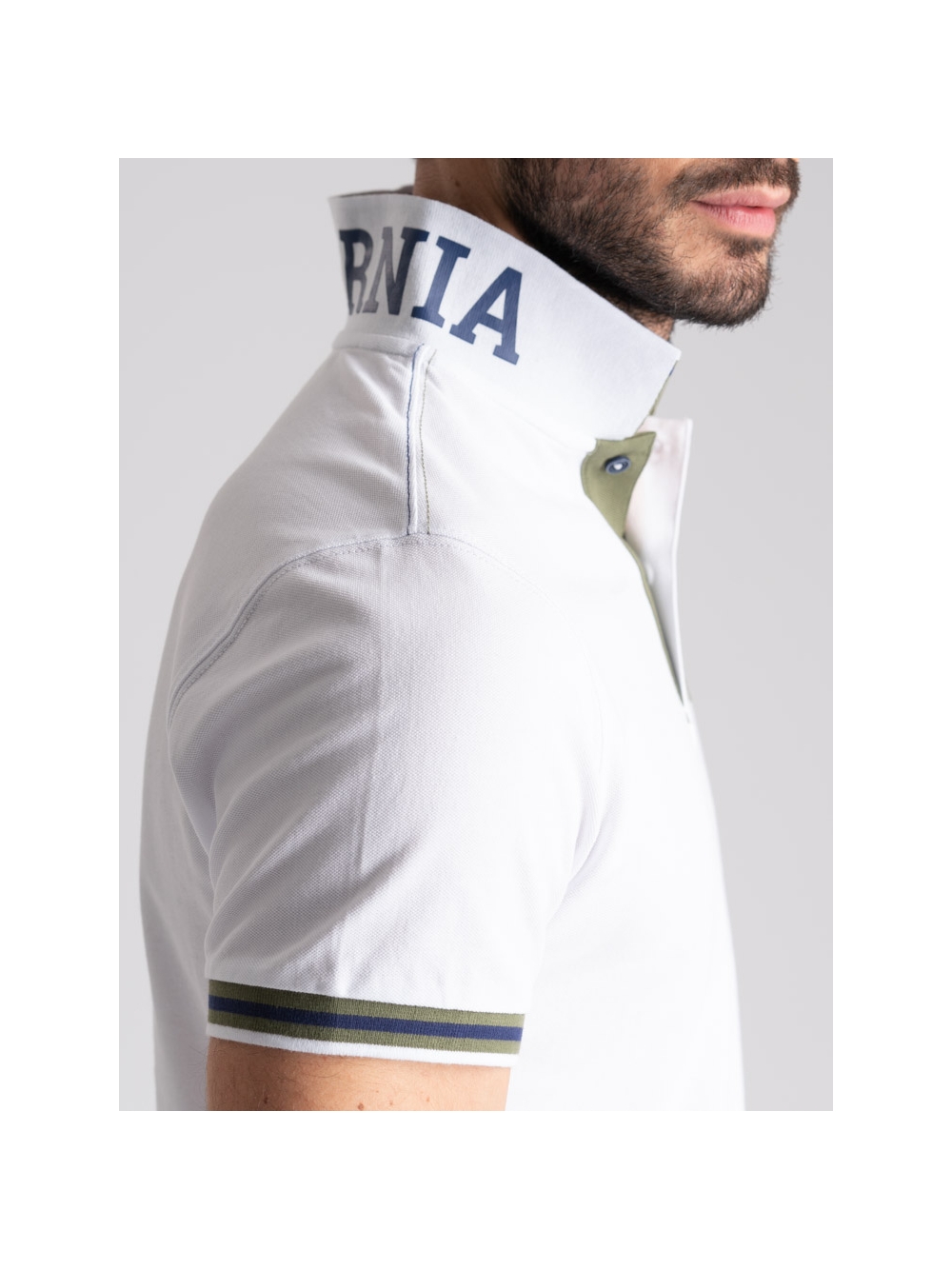 Polo uomo in tessuto piquet 100% cotone a mezza manica, collo con stampa californiana all’esterno e riga colore a contrasto all’interno.