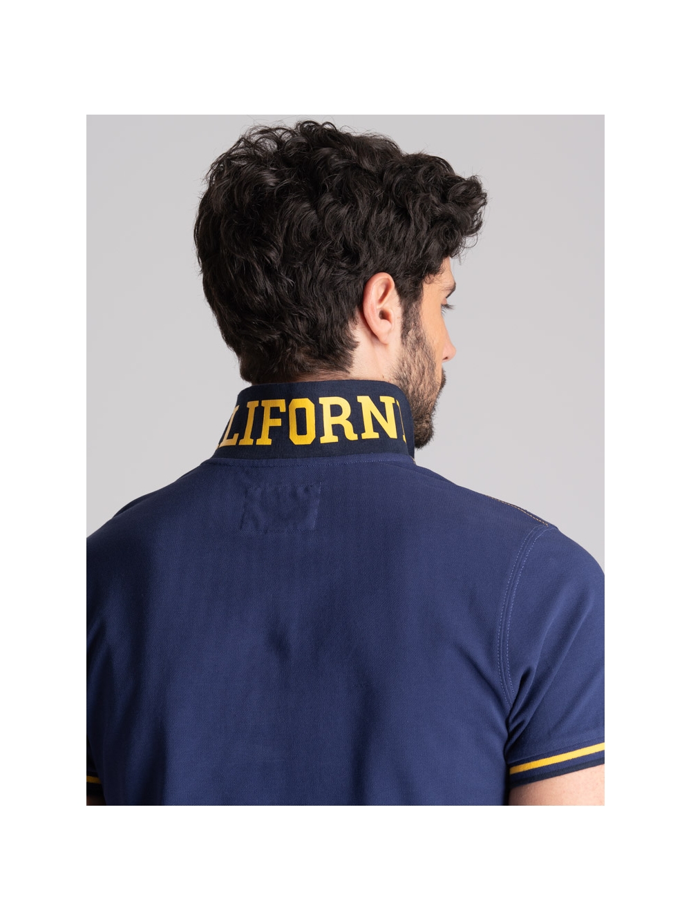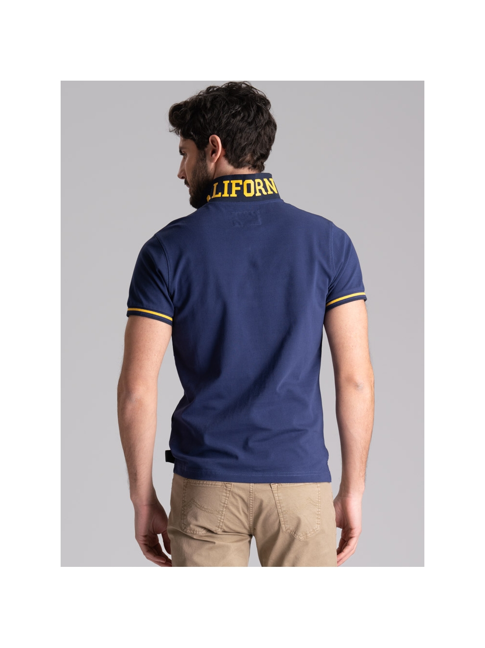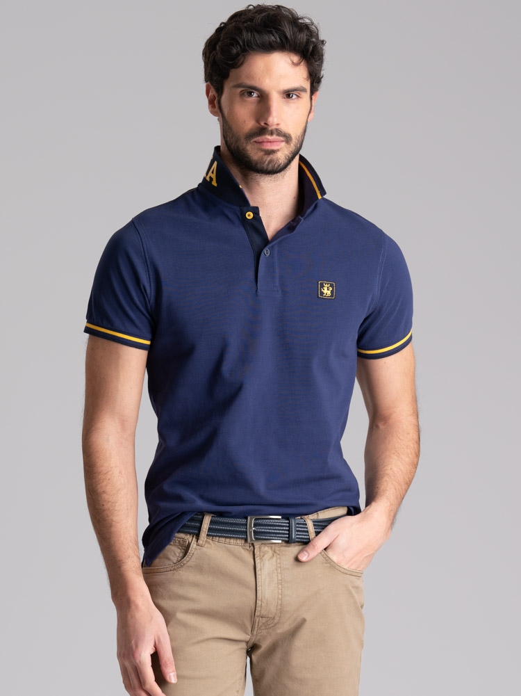 Polo uomo in tessuto piquet 100% cotone a mezza manica, collo con stampa californiana all’esterno e riga colore a contrasto all’interno.