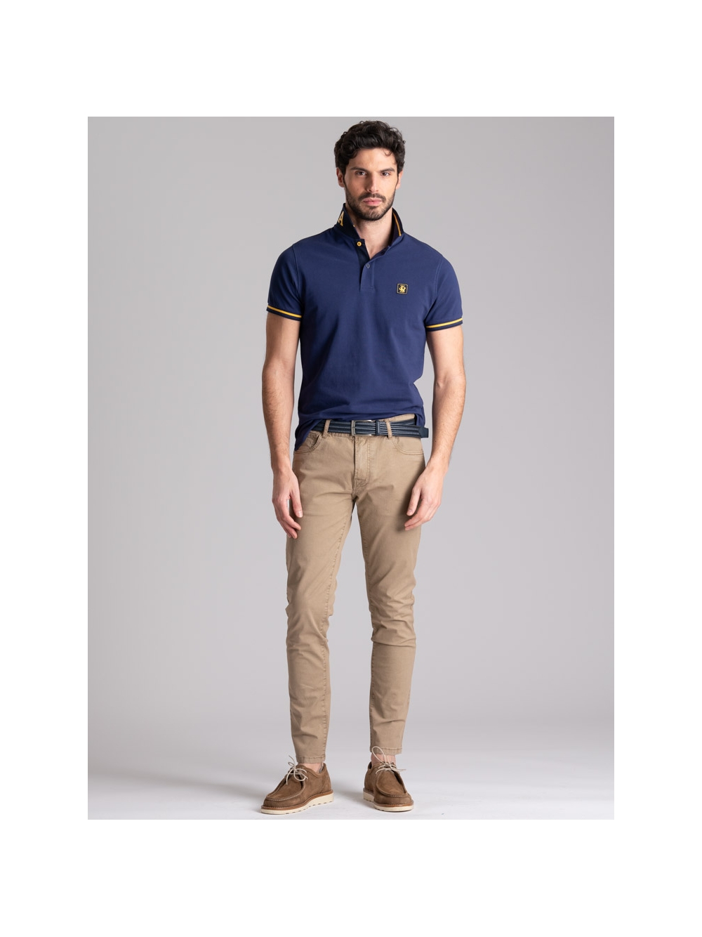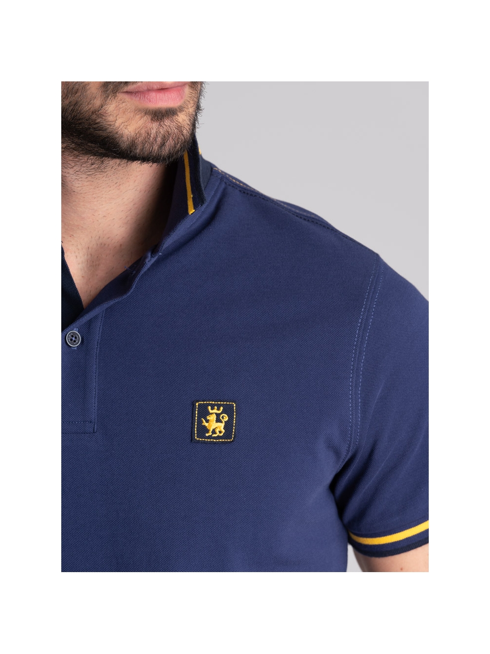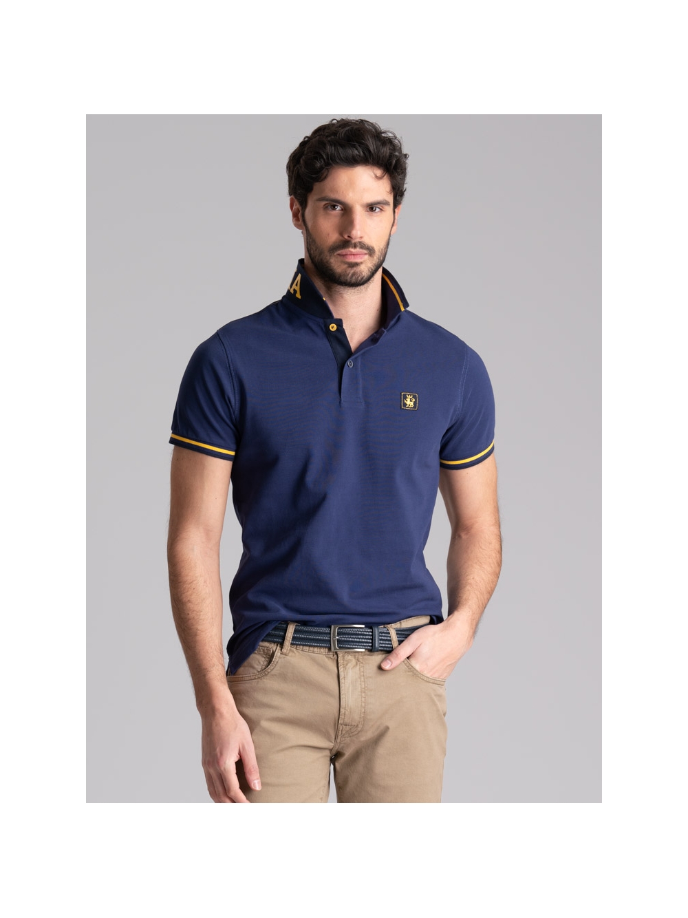 Polo uomo in tessuto piquet 100% cotone a mezza manica, collo con stampa californiana all’esterno e riga colore a contrasto all’interno.