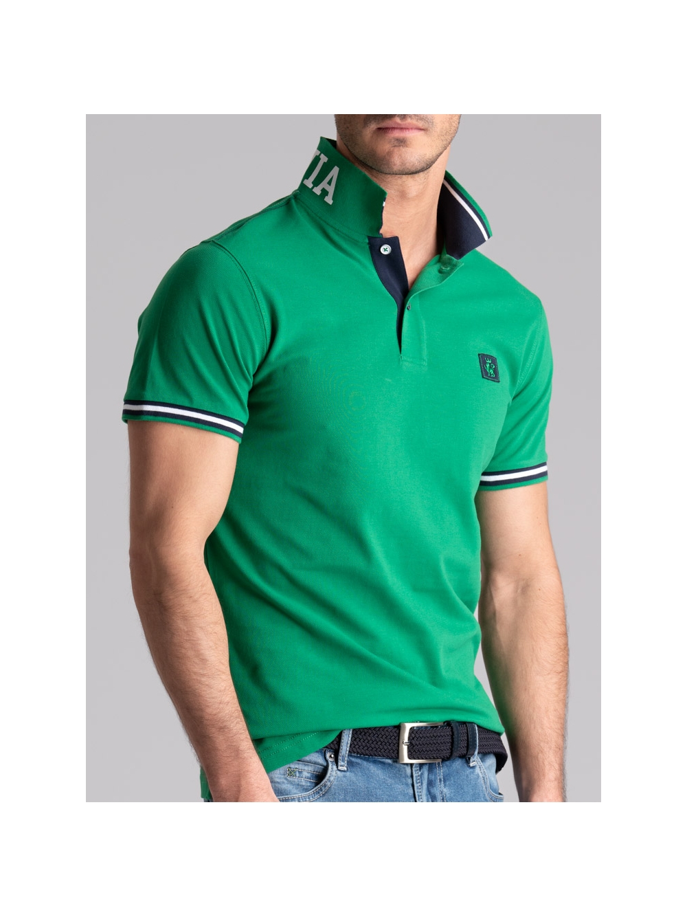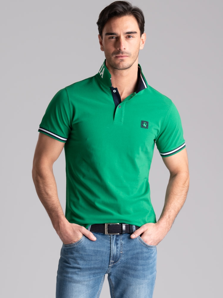Polo uomo mezza manica realizzata in tessuto piquet 100% cotone, caratterizzata dal collo smacchinato doppio con stampa californiana all’esterno e riga colore a contrasto all’interno, ripresa anche sul rib del polsino della manica. Questa polo presenta cuciture in colore a contrasto sulle spalle, nastro canolo dello stesso colore del collo e il logo INVIDIA 1973 applicato. Disponibile nelle varianti colore bianco, verde e blu chiaro.