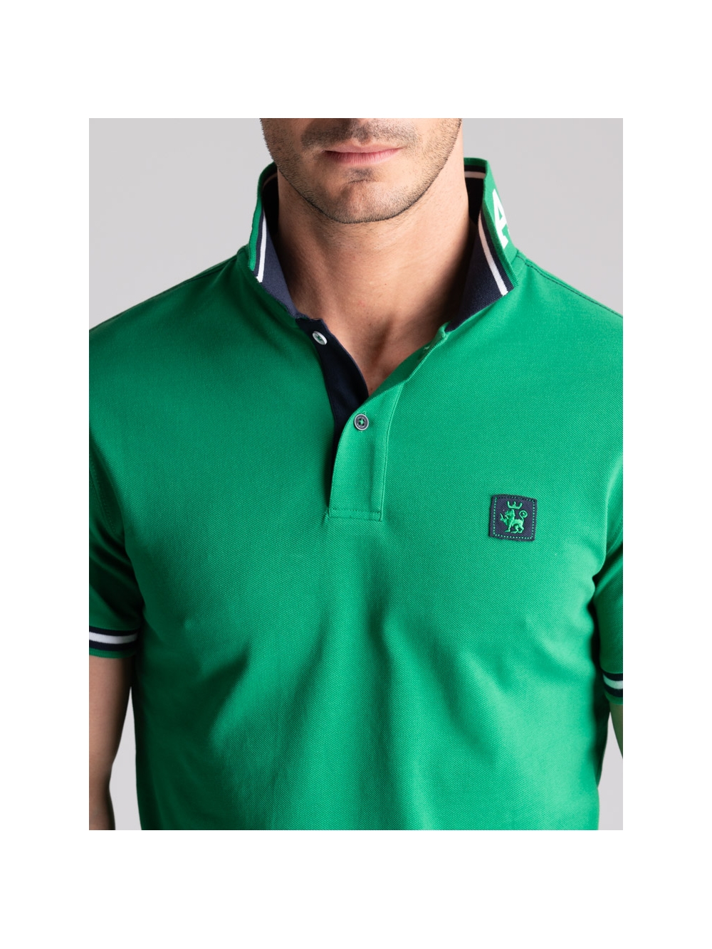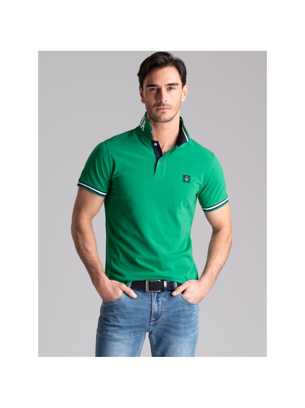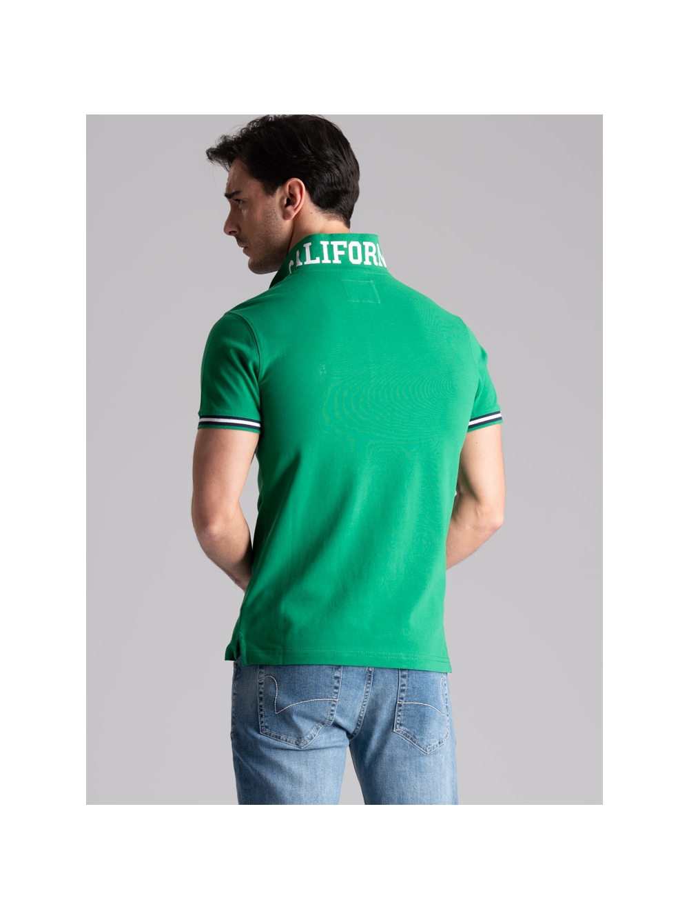 Polo uomo in tessuto piquet 100% cotone a mezza manica, collo con stampa californiana all’esterno e riga colore a contrasto all’interno.