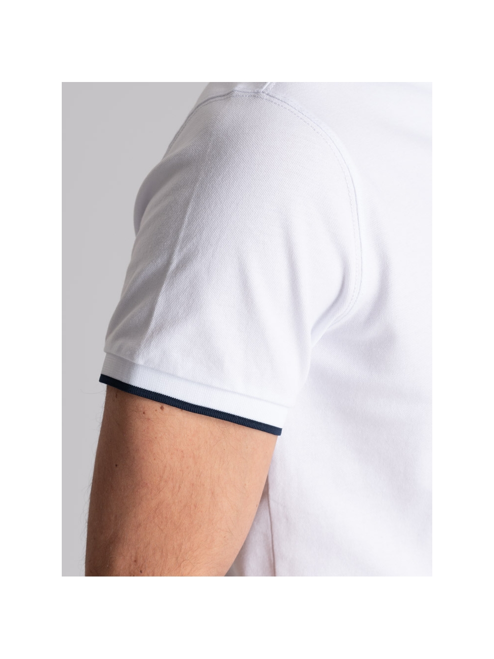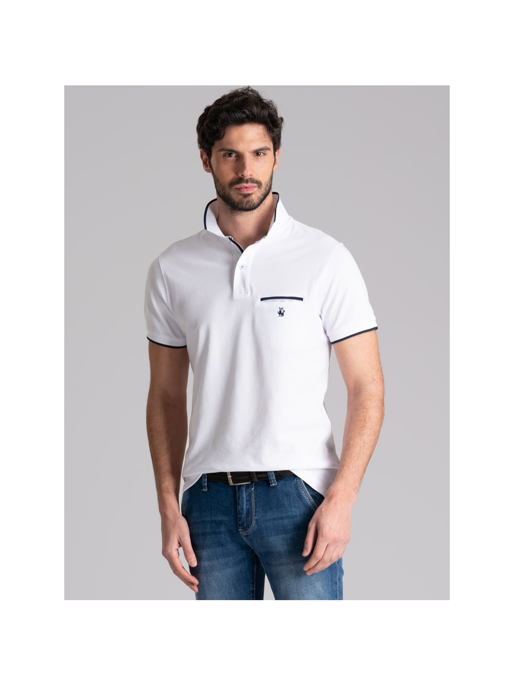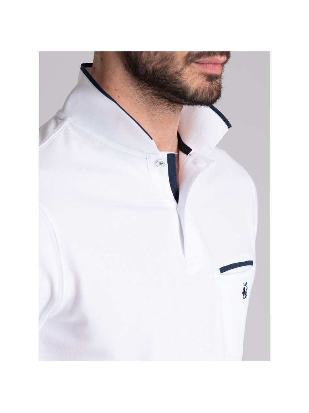 Polo uomo modello mezza manica realizzata in tessuto piquet di cotone stretch tinta unita nelle varianti colore bianco, blu e moro. Questa polo presenta un taschino interno con filetti a contrasto, collo, costina canolo e polsino manica in poliestere con riga a contrasto, logo INVIDIA 1973 applicato.