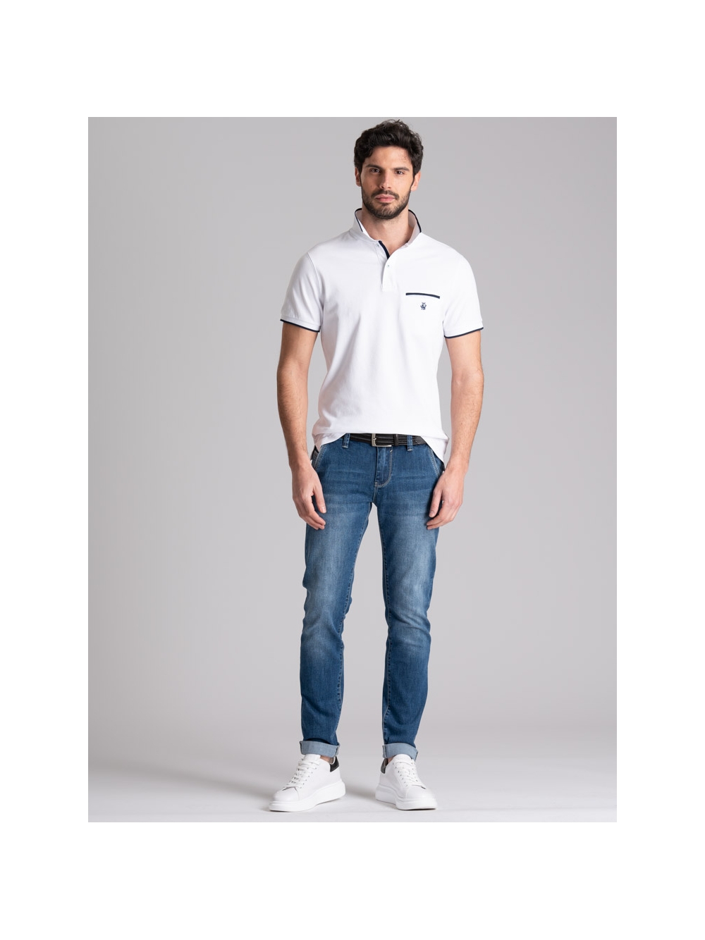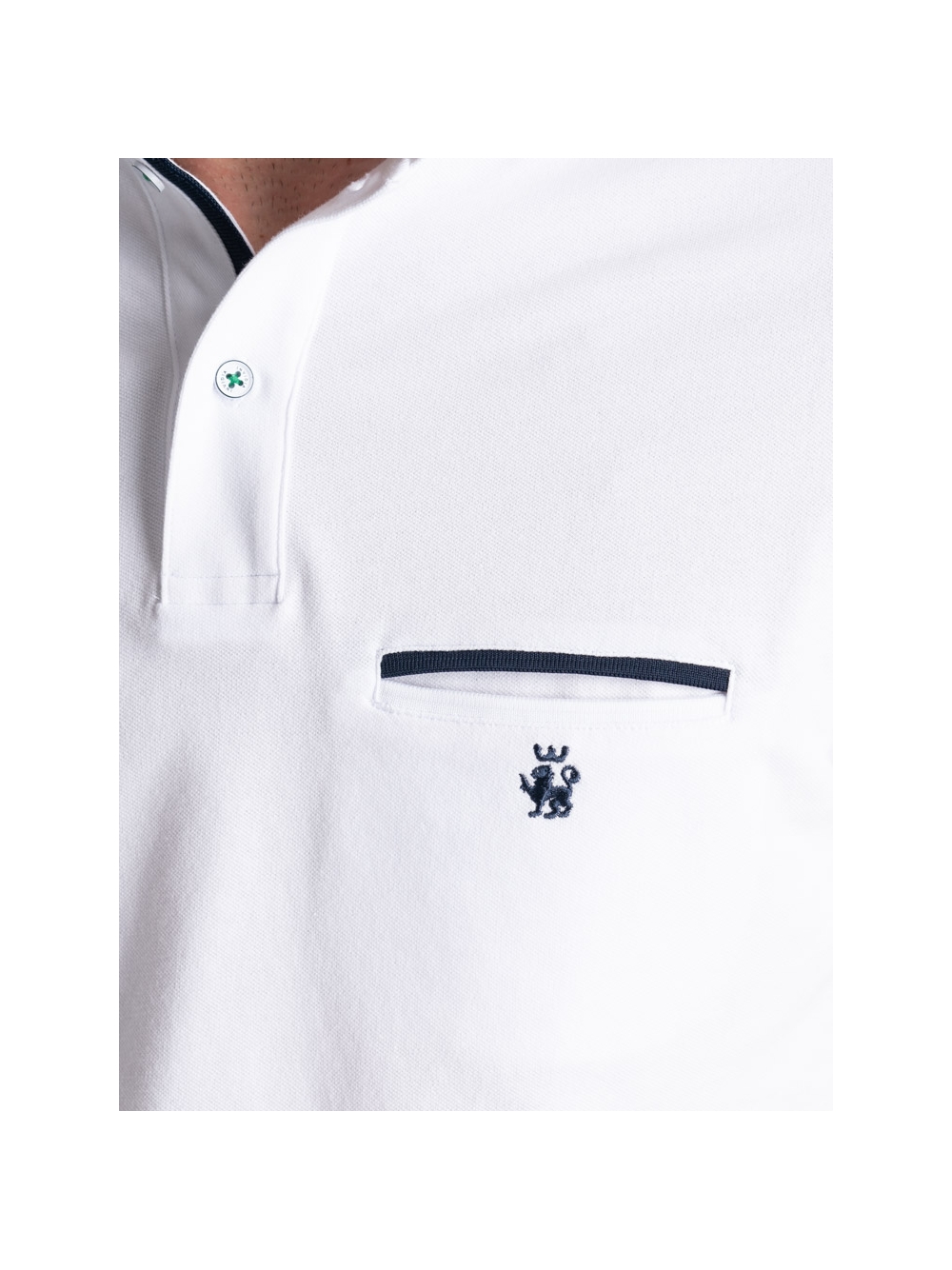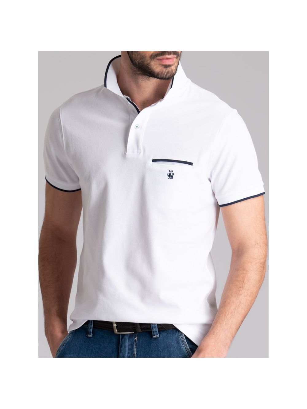 Polo uomo modello mezza manica realizzata in tessuto piquet di cotone stretch tinta unita nelle varianti colore bianco, blu e moro. Questa polo presenta un taschino interno con filetti a contrasto, collo, costina canolo e polsino manica in poliestere con riga a contrasto, logo INVIDIA 1973 applicato.