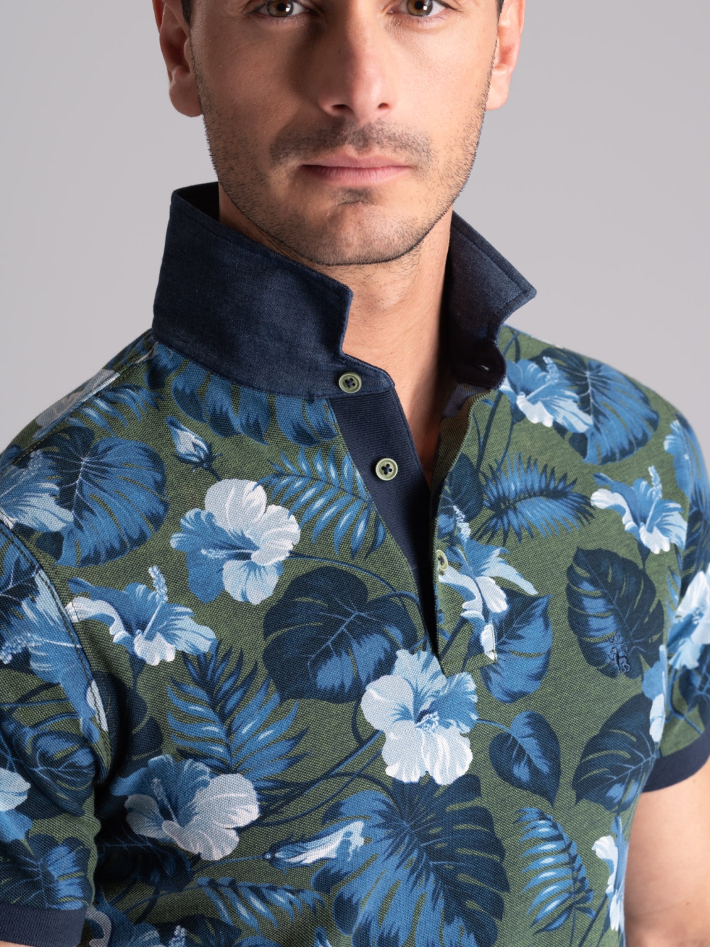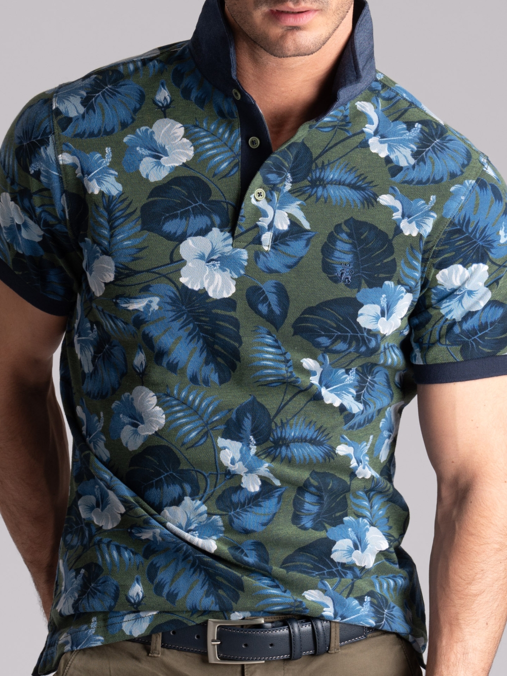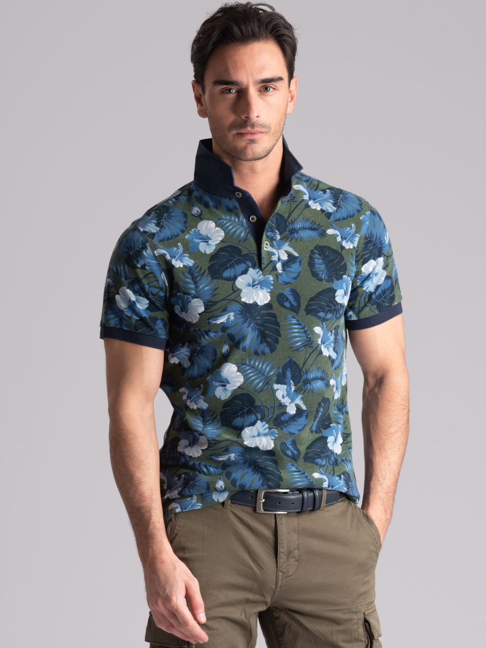 Polo uomo modello mezza manica realizzata in tessuto 100% cotone piquet a due fili con stampa Hawaii nelle varianti sabbia-blu avio e verde-blu avio. Il collo è realizzato in tessuto effetto denim e presenta il canolo in costina.