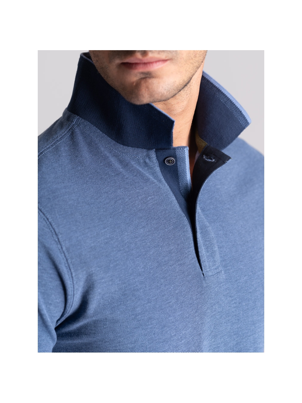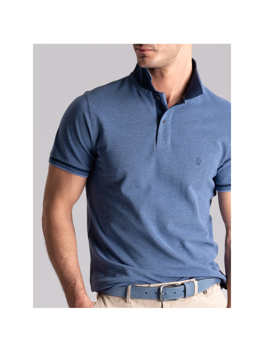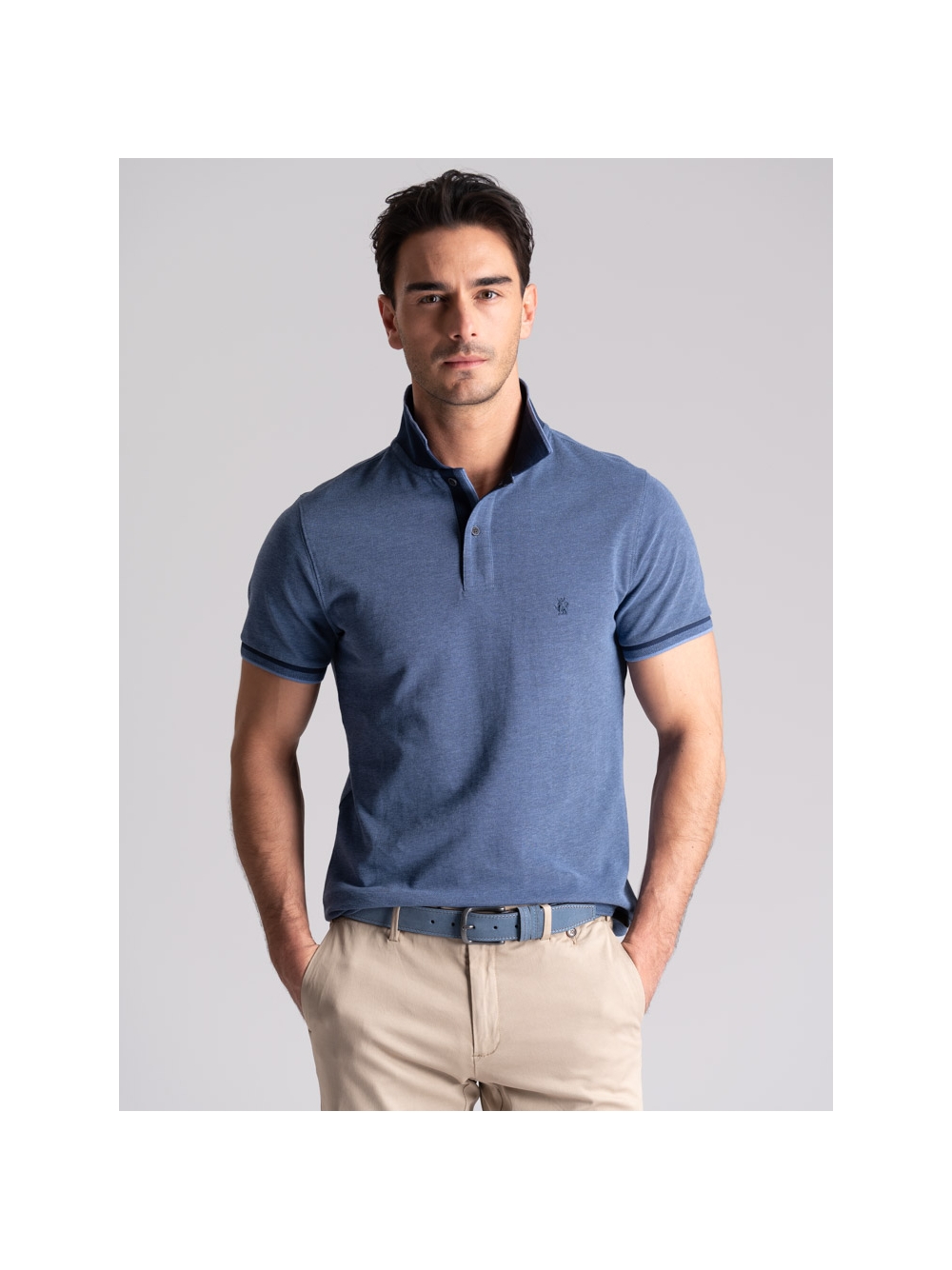 Polo uomo modello mezza manica realizzata in tessuto tinto filo 100% cotone piquet a due fili effetto melange, disponibile nelle varianti colore blu, verde e avio. Il collo e i polsini sono realizzati con lavorazione a doppia smacchinatura con una costina e profili a contrasto.