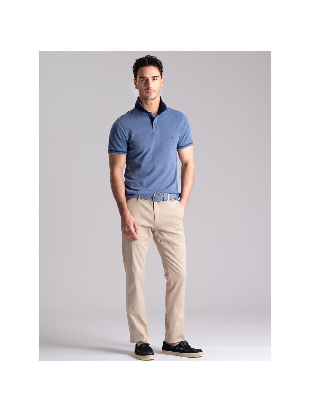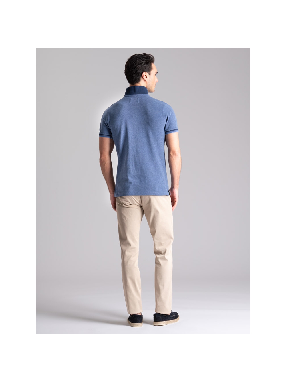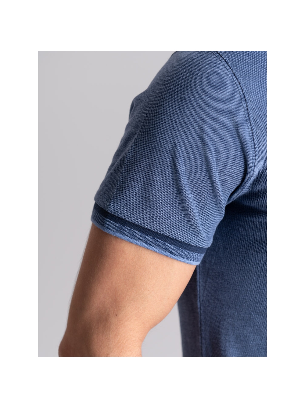 Polo uomo modello mezza manica realizzata in tessuto tinto filo 100% cotone piquet a due fili effetto melange, disponibile nelle varianti colore blu, verde e avio. Il collo e i polsini sono realizzati con lavorazione a doppia smacchinatura con una costina e profili a contrasto.