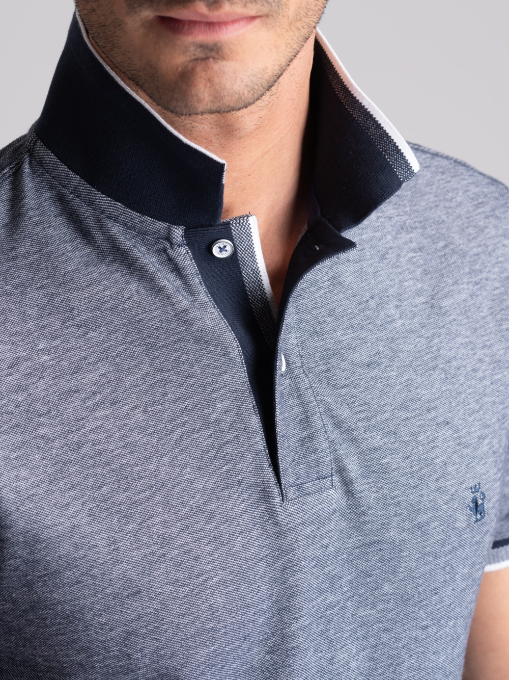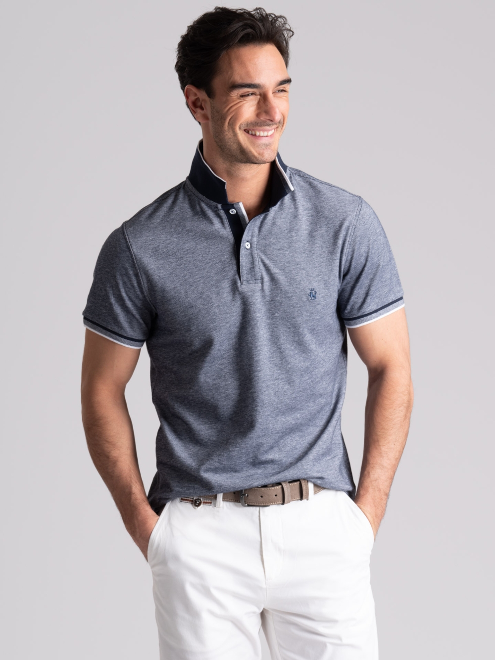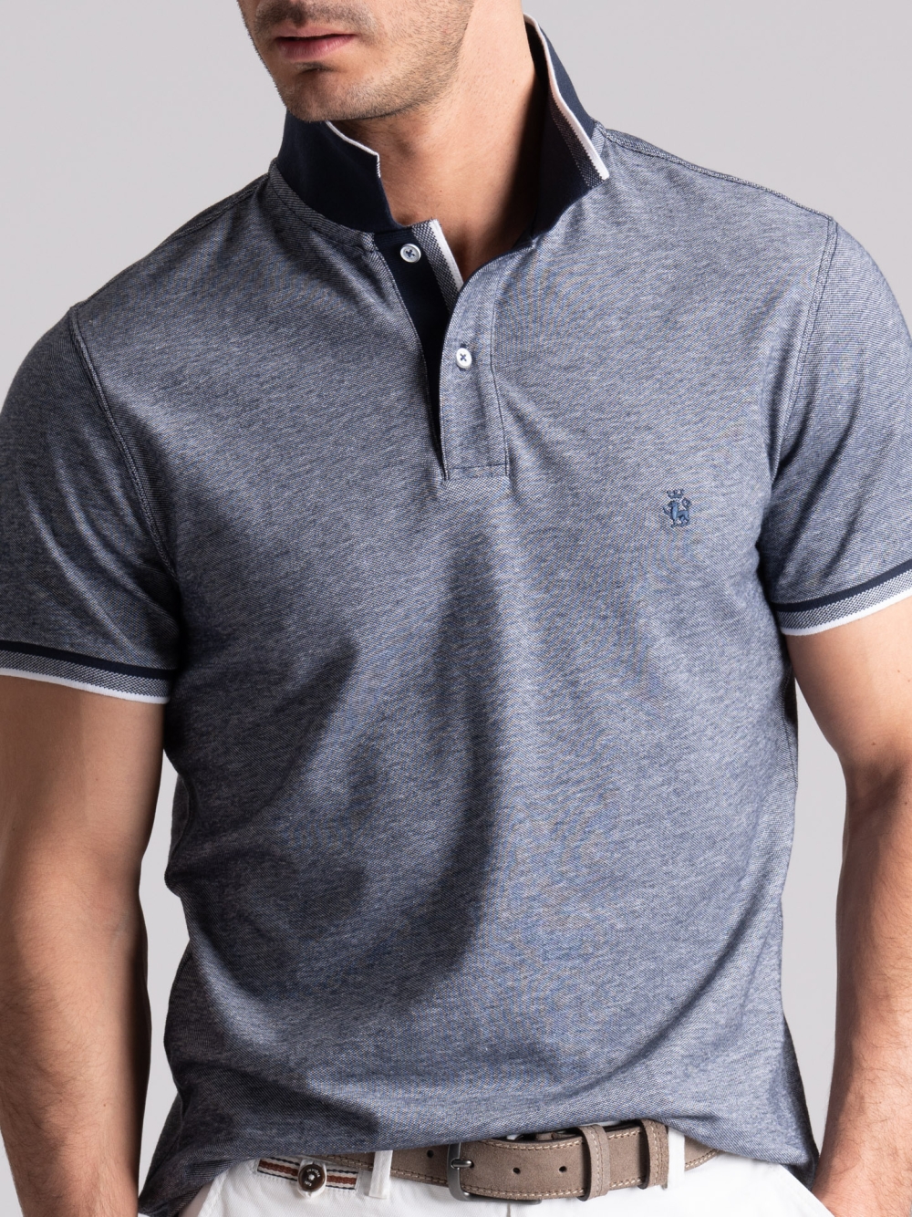 Polo uomo modello mezza manica realizzata in tessuto tinto filo 100% cotone piquet a due fili effetto melange, disponibile nelle varianti colore blu, verde e avio. Il collo e i polsini sono realizzati con lavorazione a doppia smacchinatura con una costina e profili a contrasto.