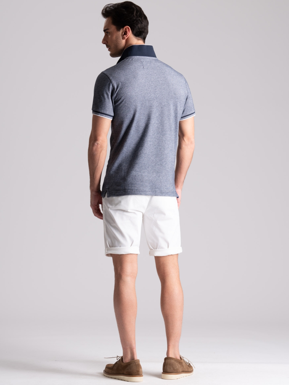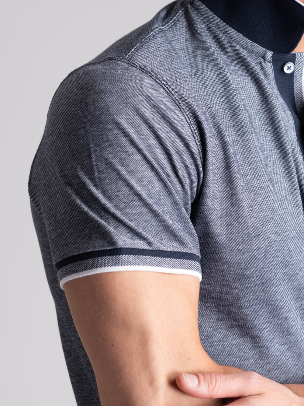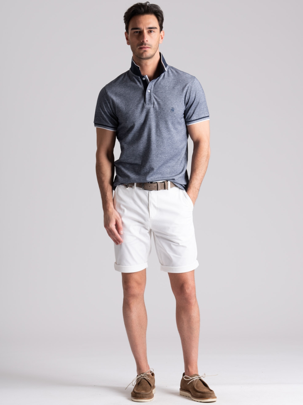 Polo uomo modello mezza manica realizzata in tessuto tinto filo 100% cotone piquet a due fili effetto melange, disponibile nelle varianti colore blu, verde e avio. Il collo e i polsini sono realizzati con lavorazione a doppia smacchinatura con una costina e profili a contrasto.