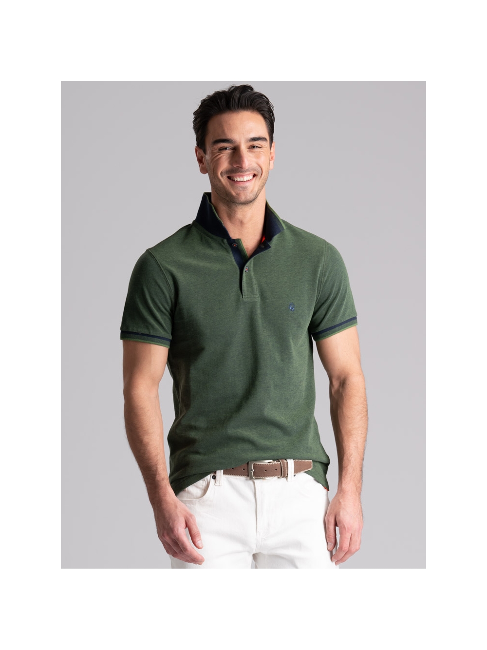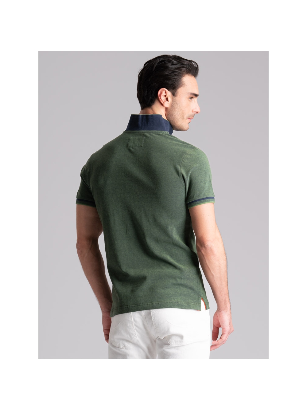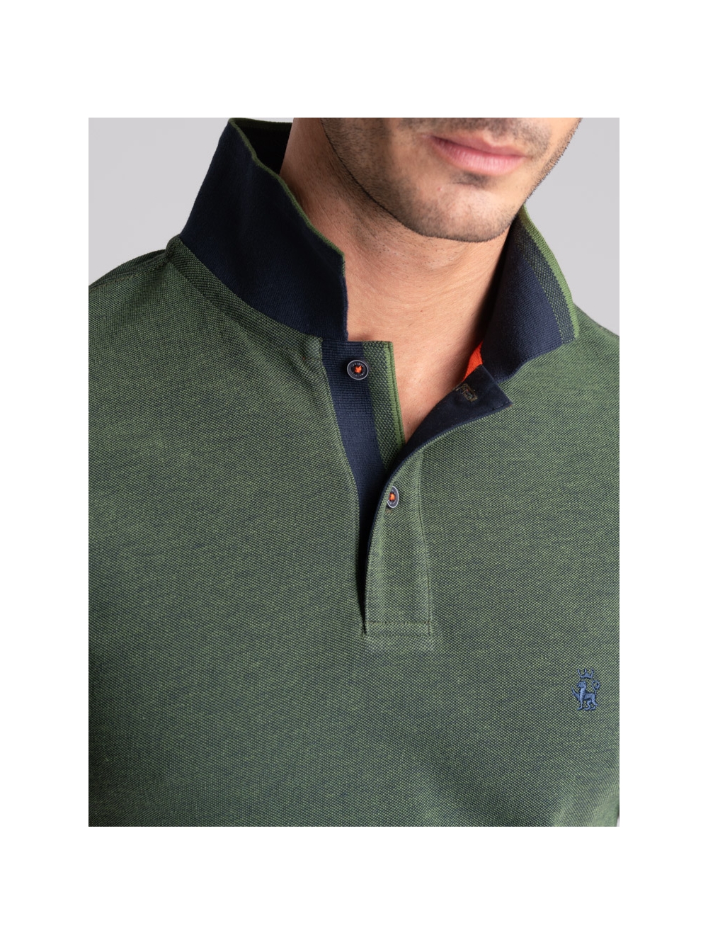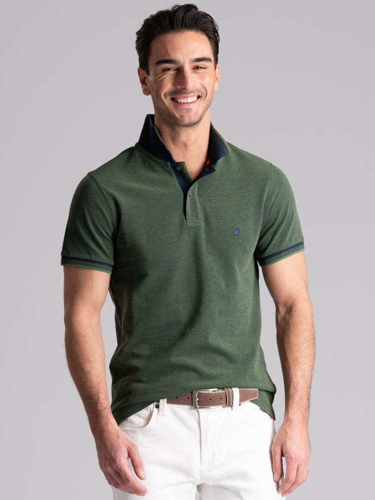 Polo uomo modello mezza manica realizzata in tessuto tinto filo 100% cotone piquet a due fili effetto melange, disponibile nelle varianti colore blu, verde e avio. Il collo e i polsini sono realizzati con lavorazione a doppia smacchinatura con una costina e profili a contrasto.