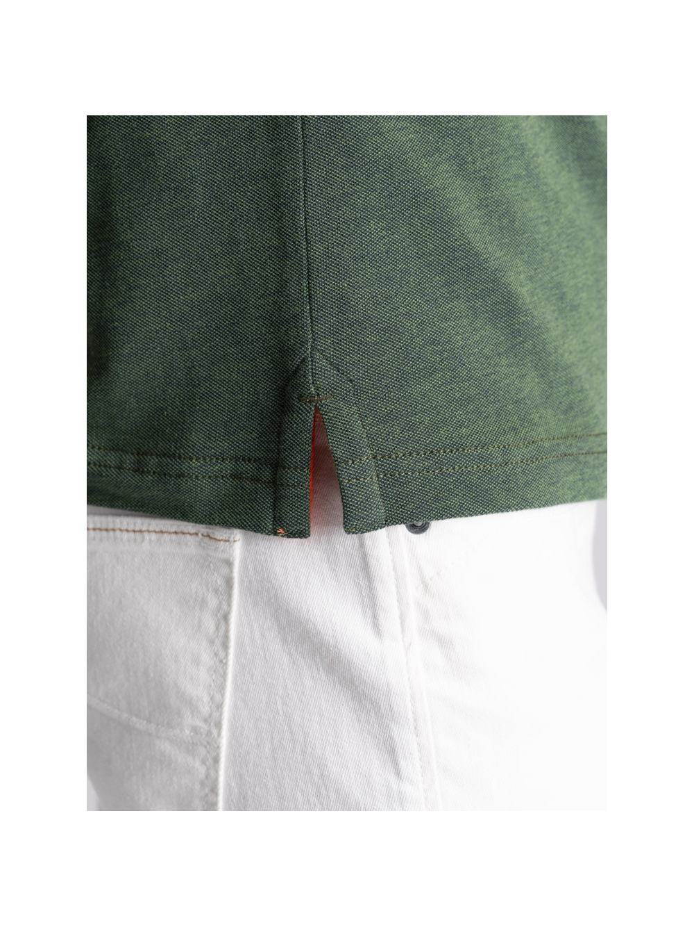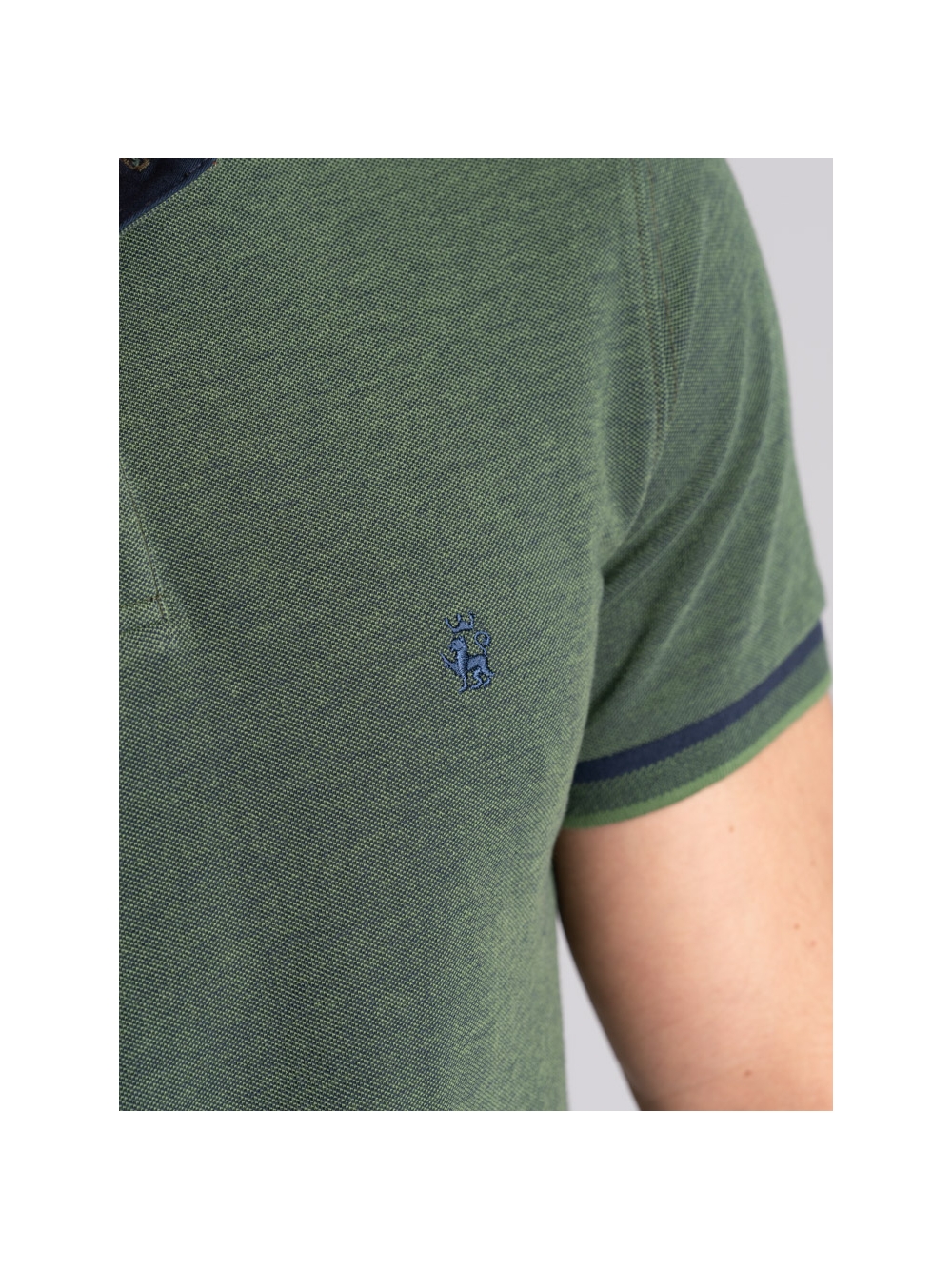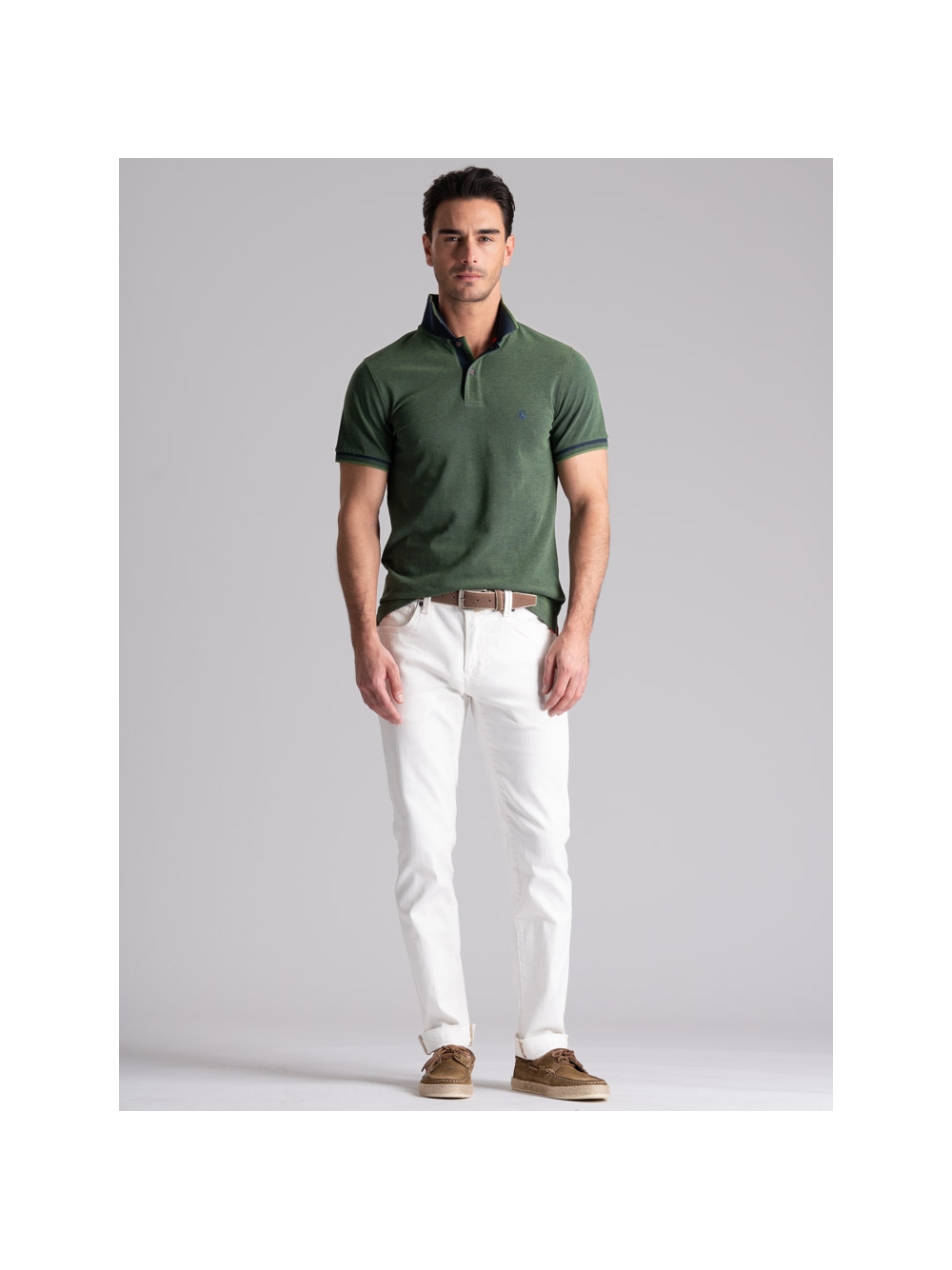 Polo uomo modello mezza manica realizzata in tessuto tinto filo 100% cotone piquet a due fili effetto melange, disponibile nelle varianti colore blu, verde e avio. Il collo e i polsini sono realizzati con lavorazione a doppia smacchinatura con una costina e profili a contrasto.